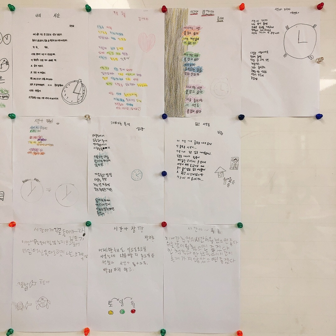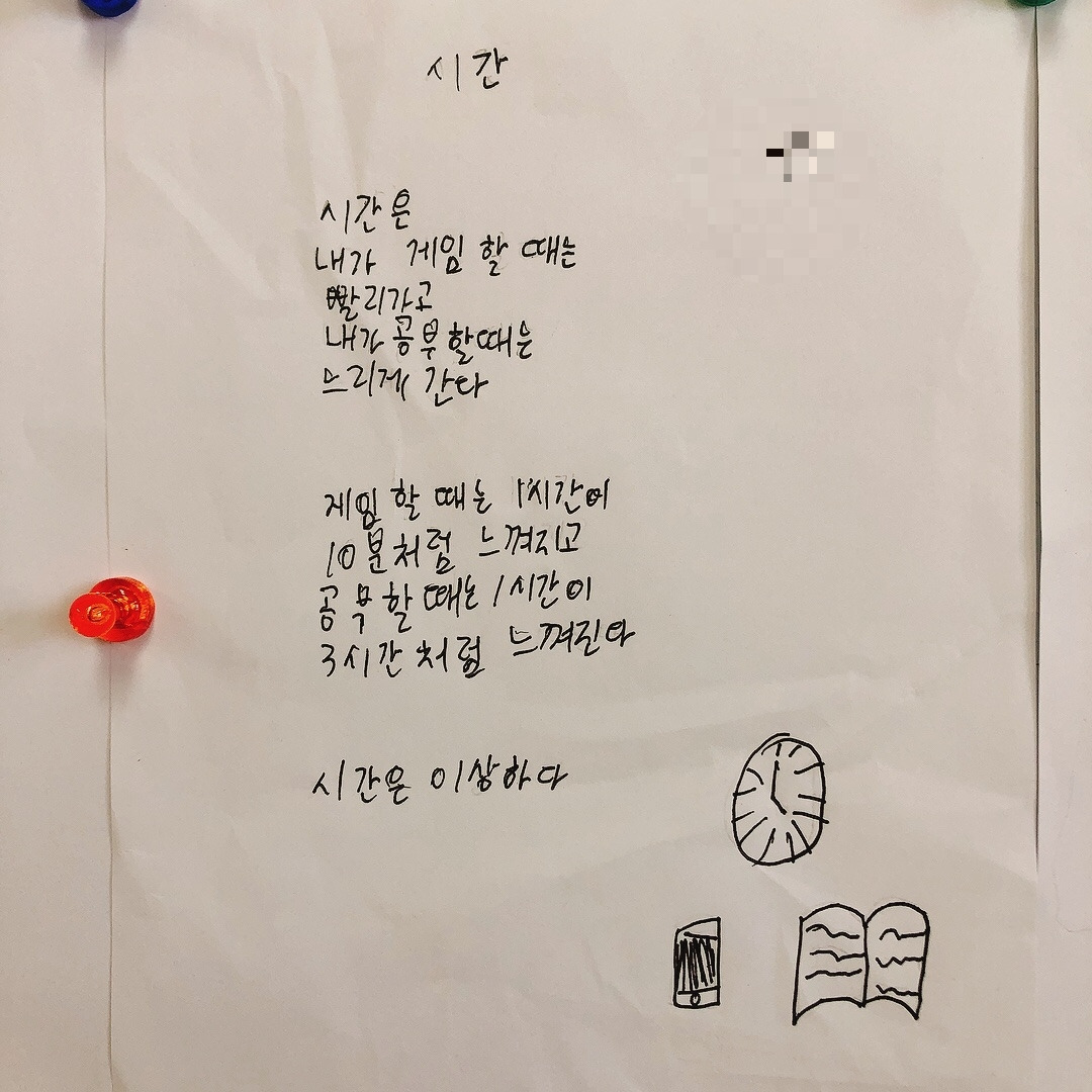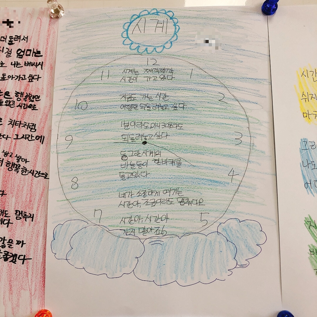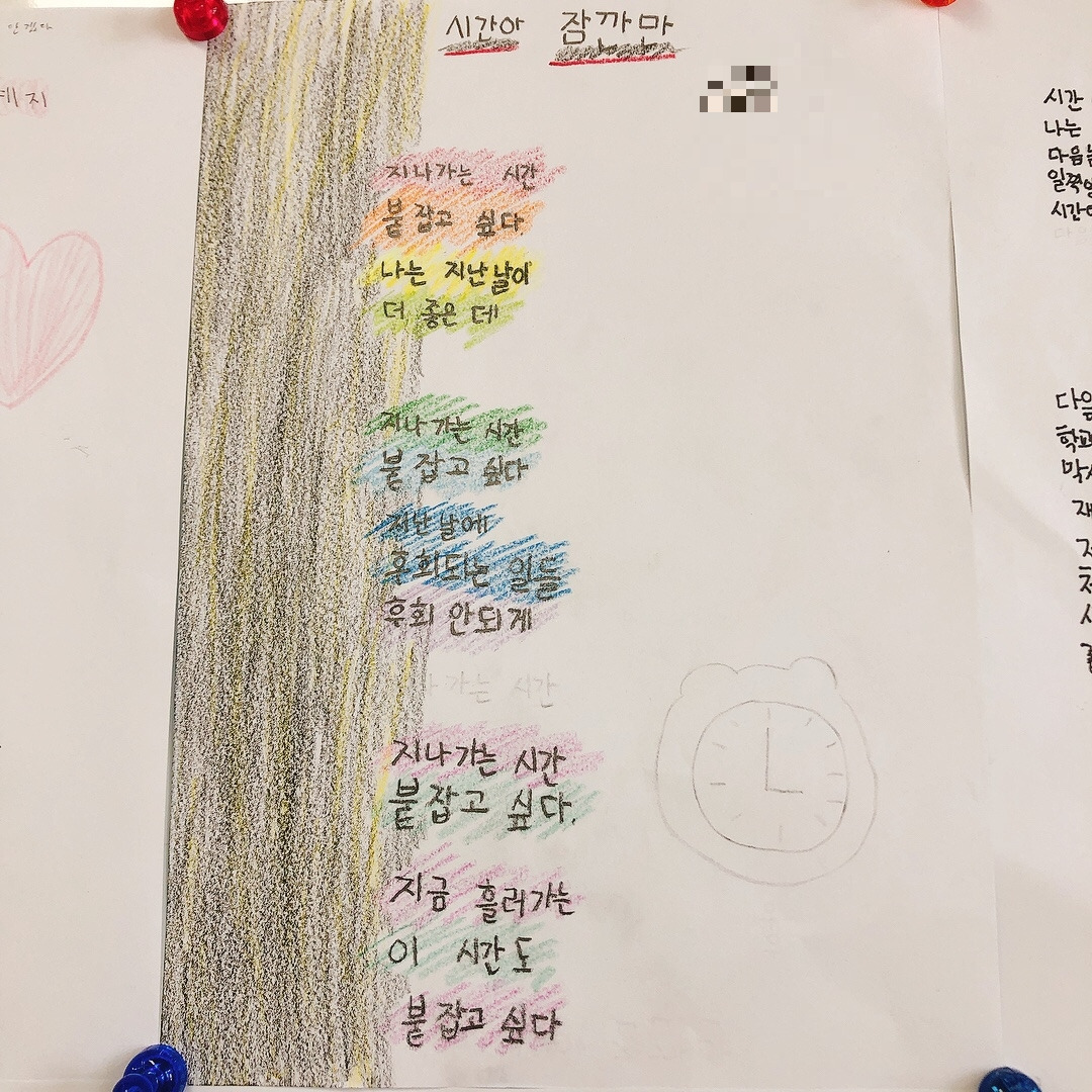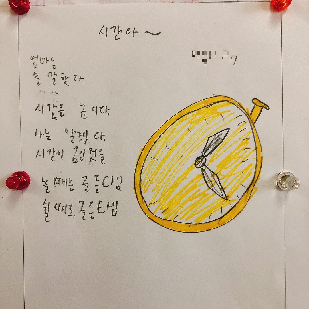 이번 주제는 ‘시간’이었다. 좋았던 시간, 힘들었던 시간, 추억하고 싶은 시간, 옛날, 지금 이 시간 모두 ‘시간’이다. 시간은 모두에게 공평하게 주어져 지금, 이 순간에도 누리고 있는 것이다. 내가 표현하고 싶은 ‘시간’에 대해 마음껏 시로 표현해보자고 했다. 이번 주제도 쓰고 싶은 내용이 많았는지 어려워하기보단 쉽게 써 내려가는 모습이 보였다.