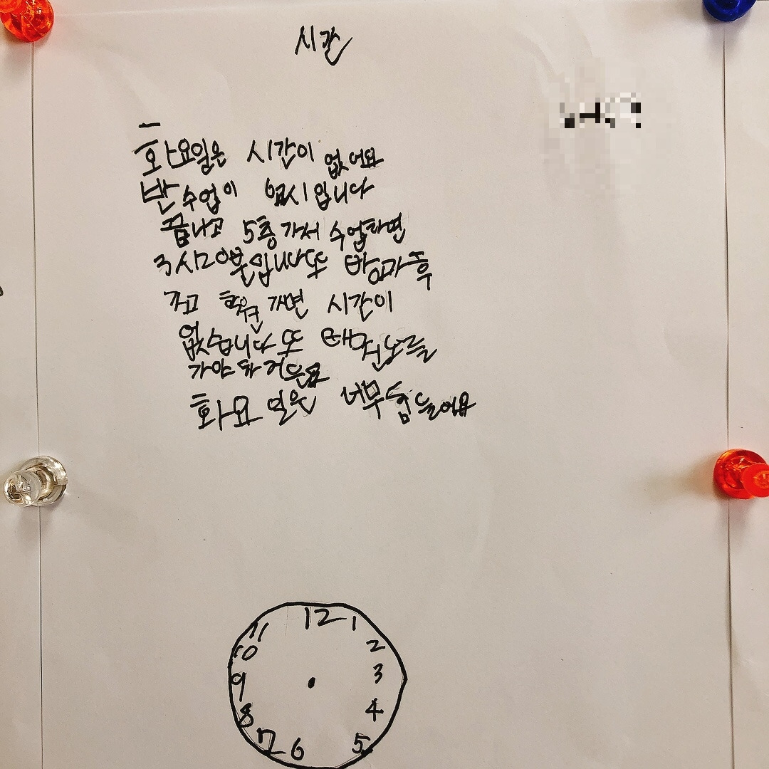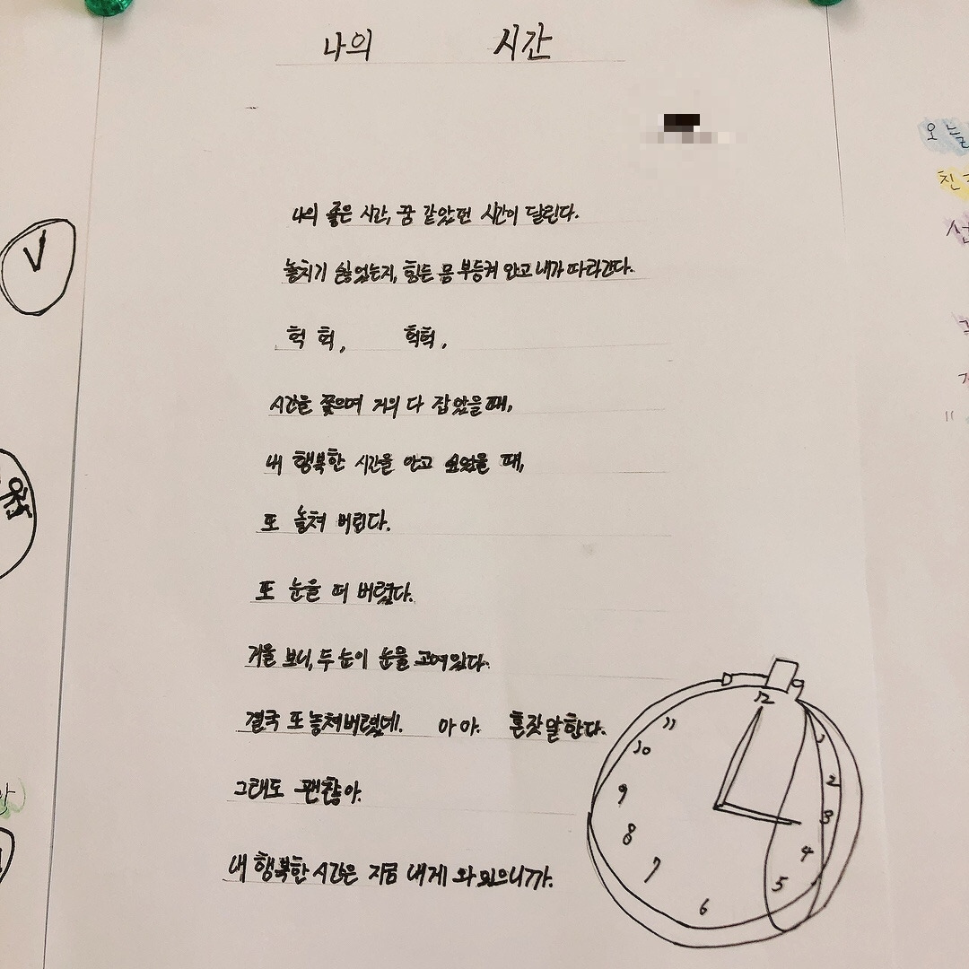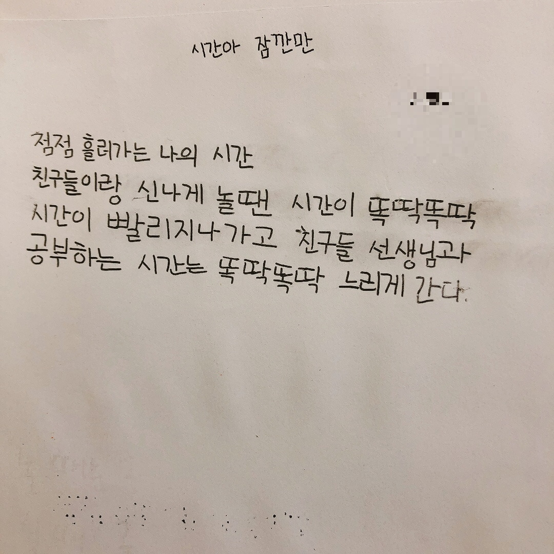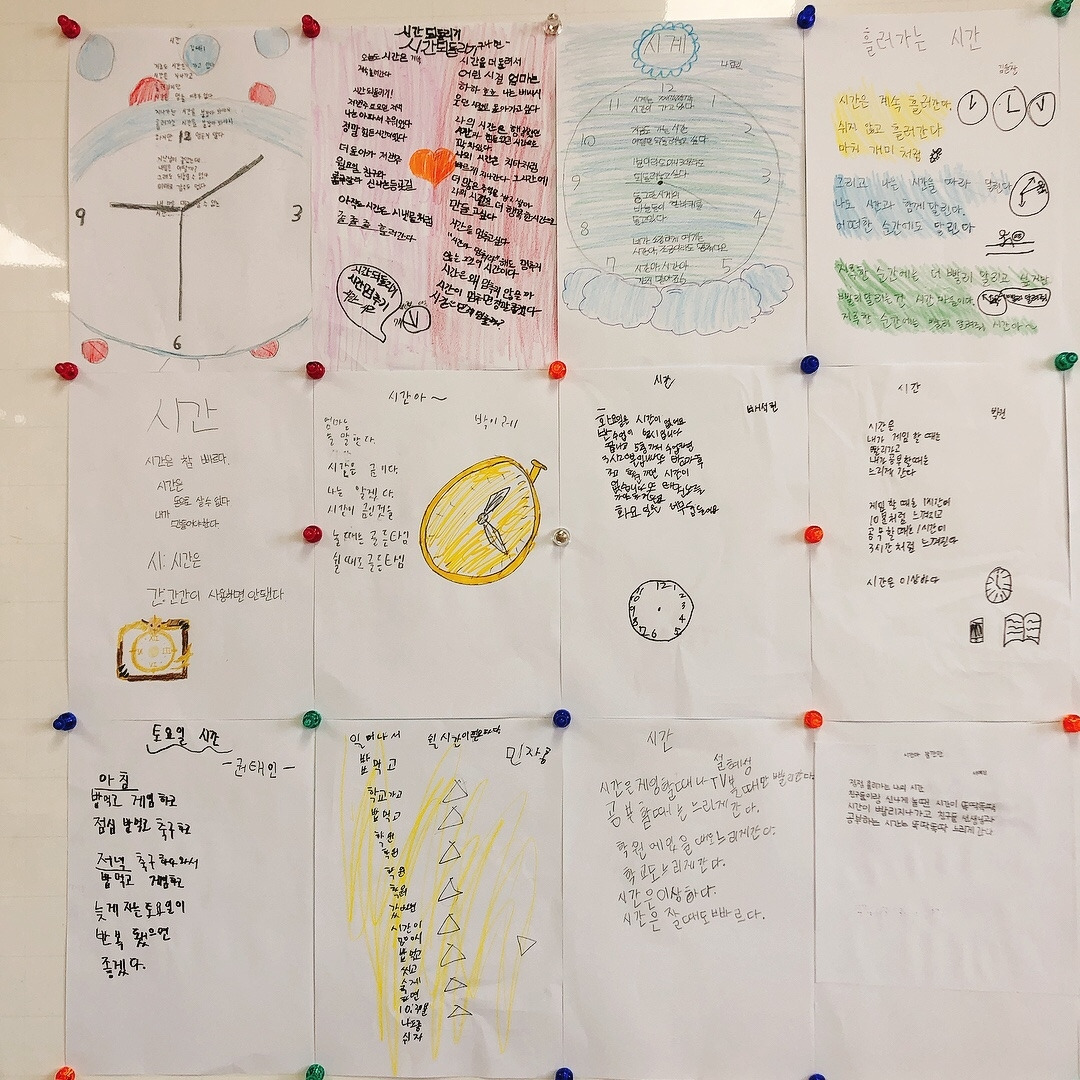 이번 주제는 ‘시간’이었다. 좋았던 시간, 힘들었던 시간, 추억하고 싶은 시간, 옛날, 지금 이 시간 모두 ‘시간’이다. 시간은 모두에게 공평하게 주어져 지금, 이 순간에도 누리고 있는 것이다. 내가 표현하고 싶은 ‘시간’에 대해 마음껏 시로 표현해보자고 했다. 이번 주제도 쓰고 싶은 내용이 많았는지 어려워하기보단 쉽게 써 내려가는 모습이 보였다.