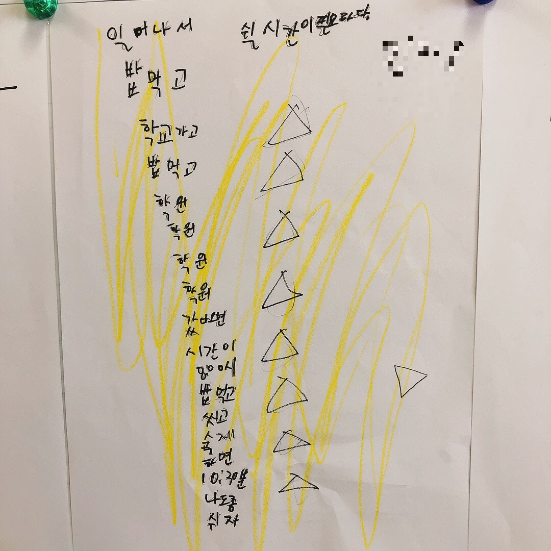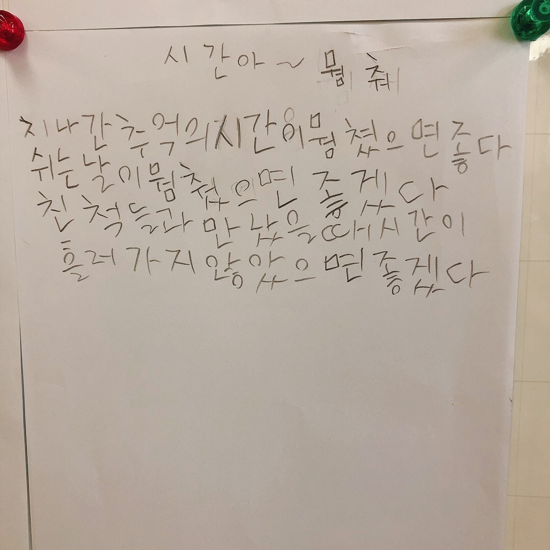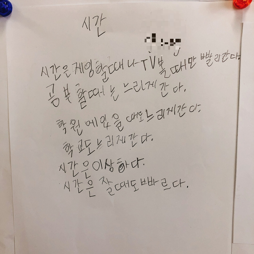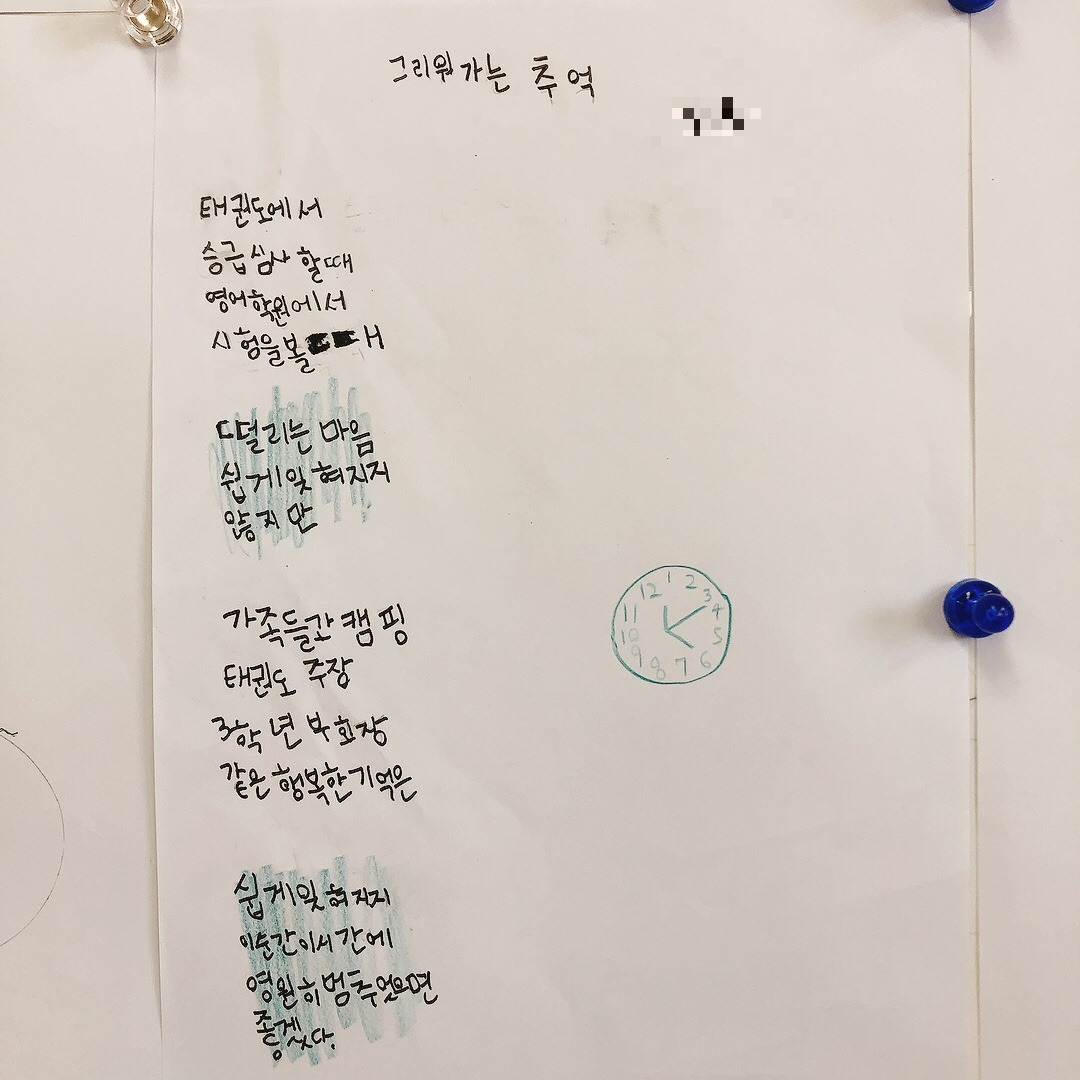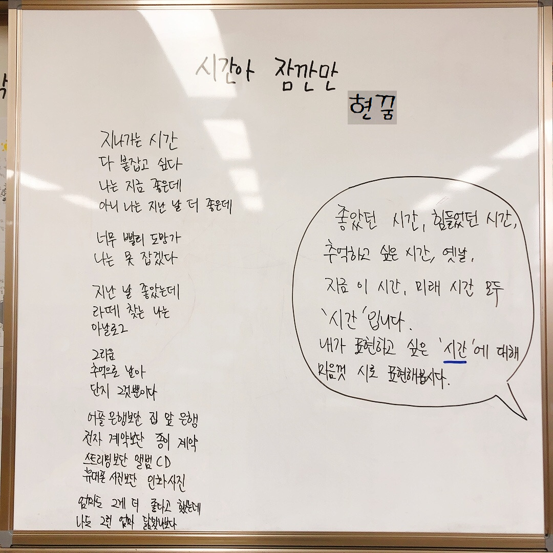 이번 주제는 ‘시간’이었다. 좋았던 시간, 힘들었던 시간, 추억하고 싶은 시간, 옛날, 지금 이 시간 모두 ‘시간’이다. 시간은 모두에게 공평하게 주어져 지금, 이 순간에도 누리고 있는 것이다. 내가 표현하고 싶은 ‘시간’에 대해 마음껏 시로 표현해보자고 했다. 이번 주제도 쓰고 싶은 내용이 많았는지 어려워하기보단 쉽게 써 내려가는 모습이 보였다.