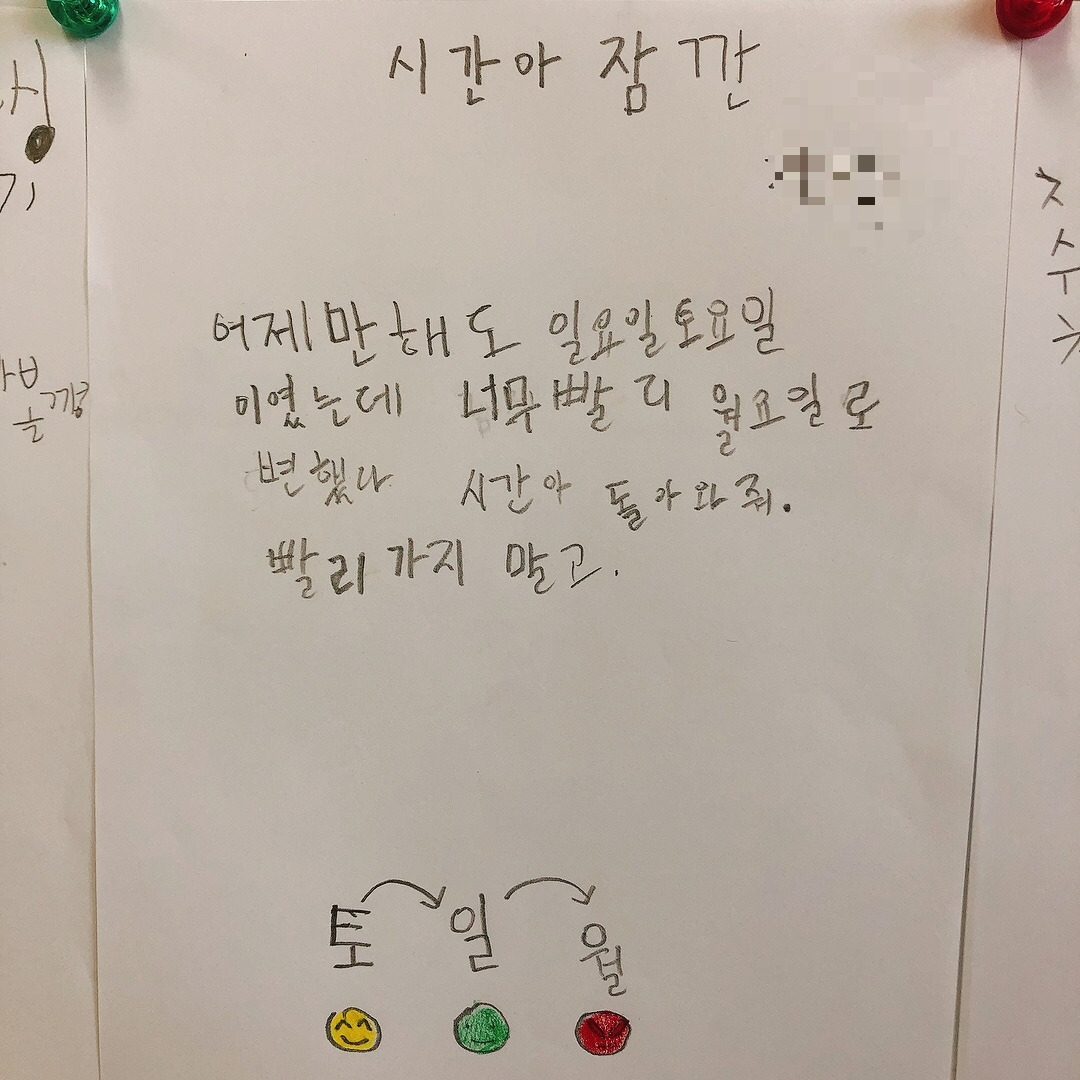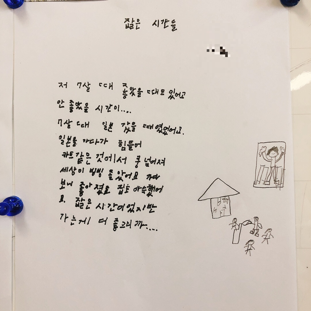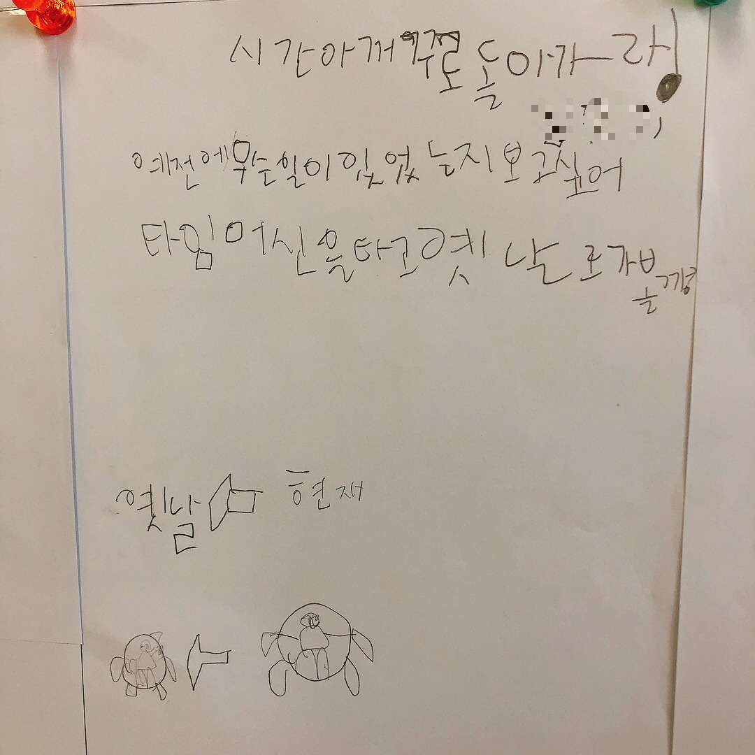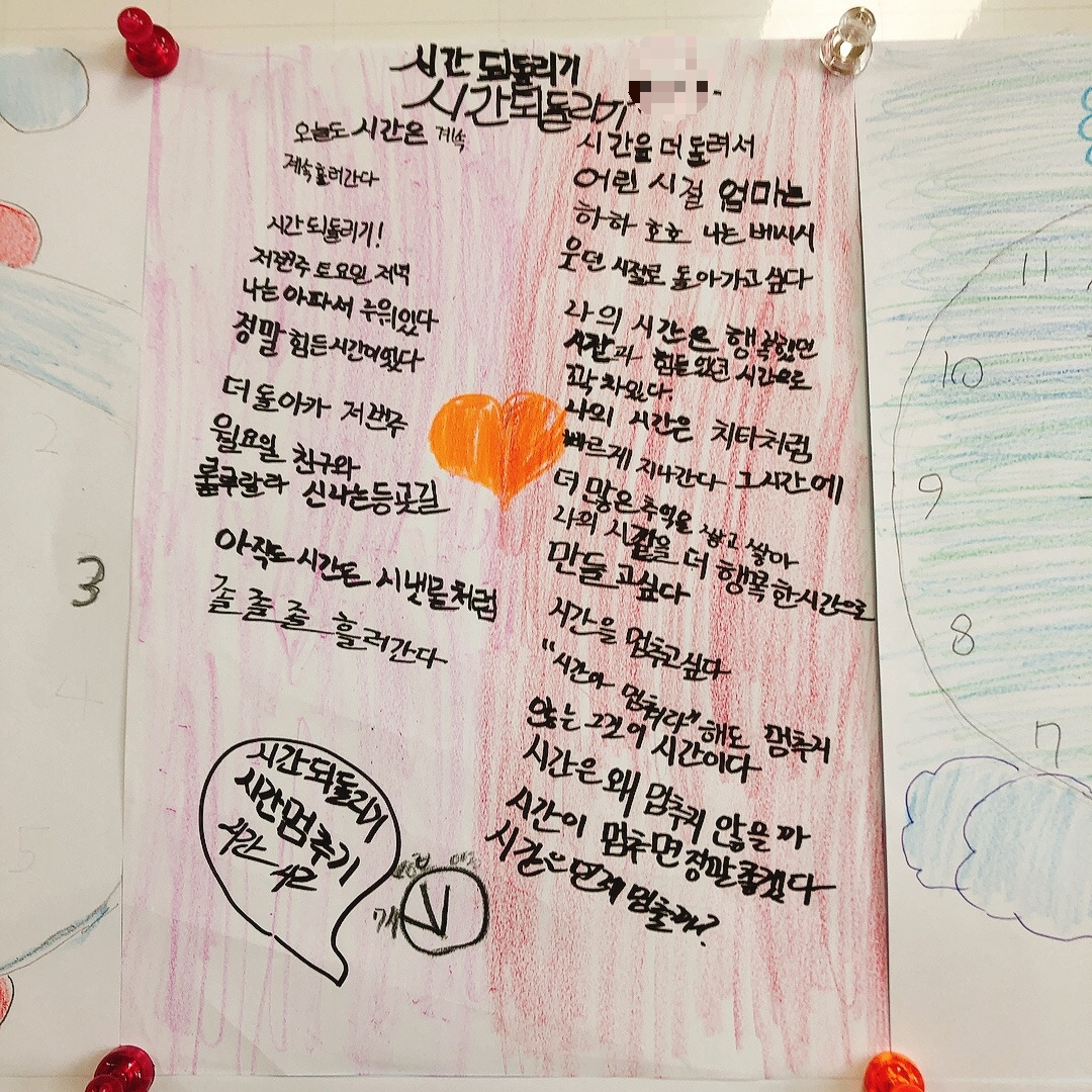 지금도 가는 시간 어떨 땐 되돌려놓고 싶다며 1분이라도, 아니 30초라도 되돌려놓고 싶다고 쓴 아이가 있었다. 소중하게 여기는 시간이 조금이라도 멈췄으면 좋겠다고 시간에게 멈춰달라고 말을 걸기도 했다. 행복했던 기억은 쉽게 잊혀 아쉽다며 이 순간 이 시간이 영원히 멈추면 좋겠다는 아이도 있었다. 시간을 더 돌려서 어린 시절 엄마는 하하 호호 나는 배시시 웃던 시절로 돌아가고 싶다는 아이도 있었다. 내 시간은 행복했던 시간과 힘들었던 시간으로 꽉 차 있다며 더 많은 추억을 쌓고 쌓아 나의 시절을 더 행복한 시간으로 만들고 싶다는 설레는 바람까지 썼다. 행복했던 시절로 돌아가고 싶고 지금 이 시간도 멈추고 싶다는 걸 보니 다들 과거에 좋은 추억이 있나 보다. 과거에 행복했었나 보다. 현재도 행복한가 보다.