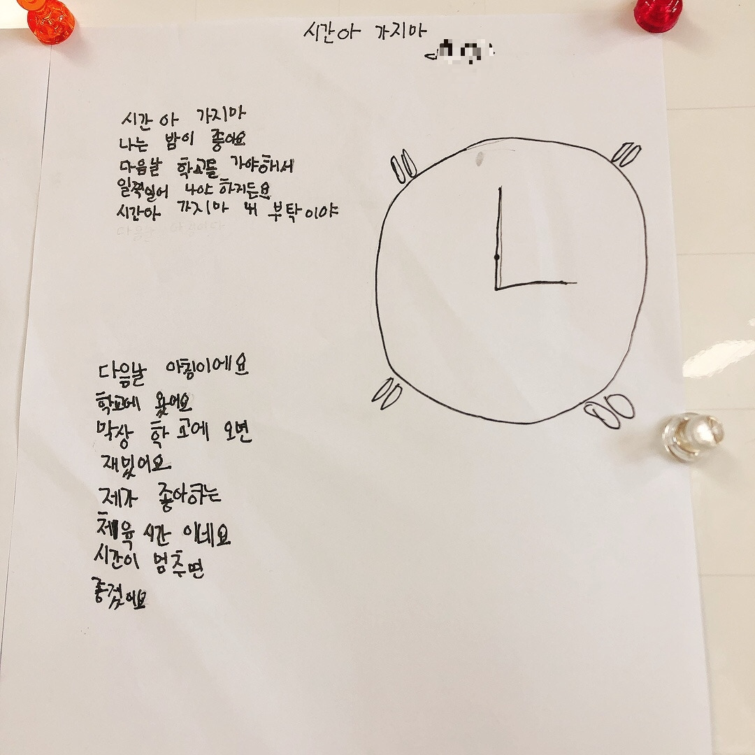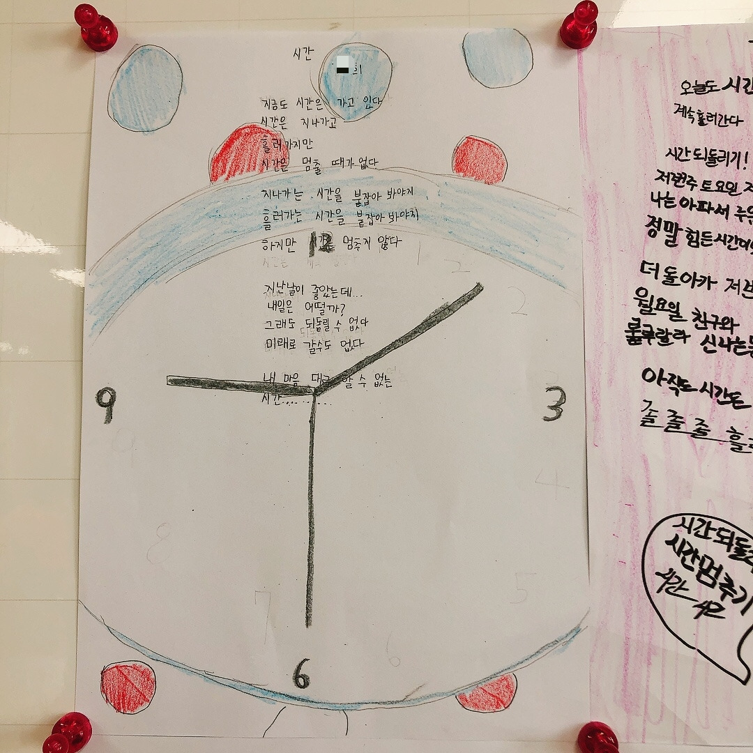 다시 돌아간다면 개학 날로 돌아가 친구들과 선생님을 다시 만나고 싶다는 시도 있었다. 1학기가 끝날 때 벌써 절반이나 시간이 흘렀다며 곧 끝날까 아쉽다 한 아이들이 많았는데 4학년 개학 날로 돌아가 우리 반이 함께하는 1년의 시간을 다시 보내고 싶나 보다. 좋아하는 사람과 함께하는 시간을 아끼고 사랑하는 마음이 크게 느껴지는 예쁜 시였다. 다음 날 일찍 일어나 학교에 가야 하기에 시간이 가지 않았으면 좋겠다더니 다음날 아침이 되어 막상 학교에 오면 재밌다는 시도 있었다. 아침에 학교 오기는 힘들어도 학교 오면 좋아 이제는 시간이 멈추면 좋겠다며 학교가 오면 즐거운 장소라 참 다행이었다.