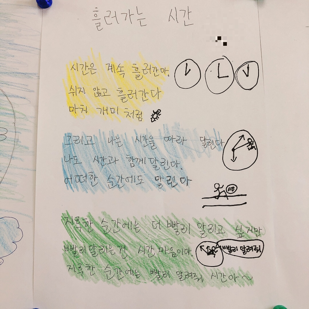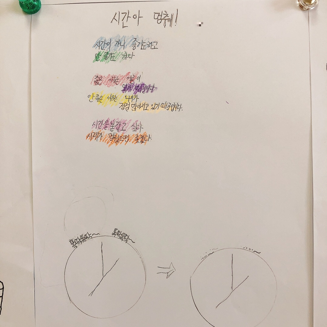 시간은 지나가고 흘러가지만 멈추지 않는다는 말에 아쉬움이 담겨있는 듯했다. 지난날이 좋았는데 되돌릴 수도 없고 미래로 갈 수도 없어 시간에 대한 안타까움과 원망이 느껴졌다. 지난날에 후회되는 일들 후회 안 되게 지나가는 시간을 붙잡고 싶다는 아이들이 많았다.