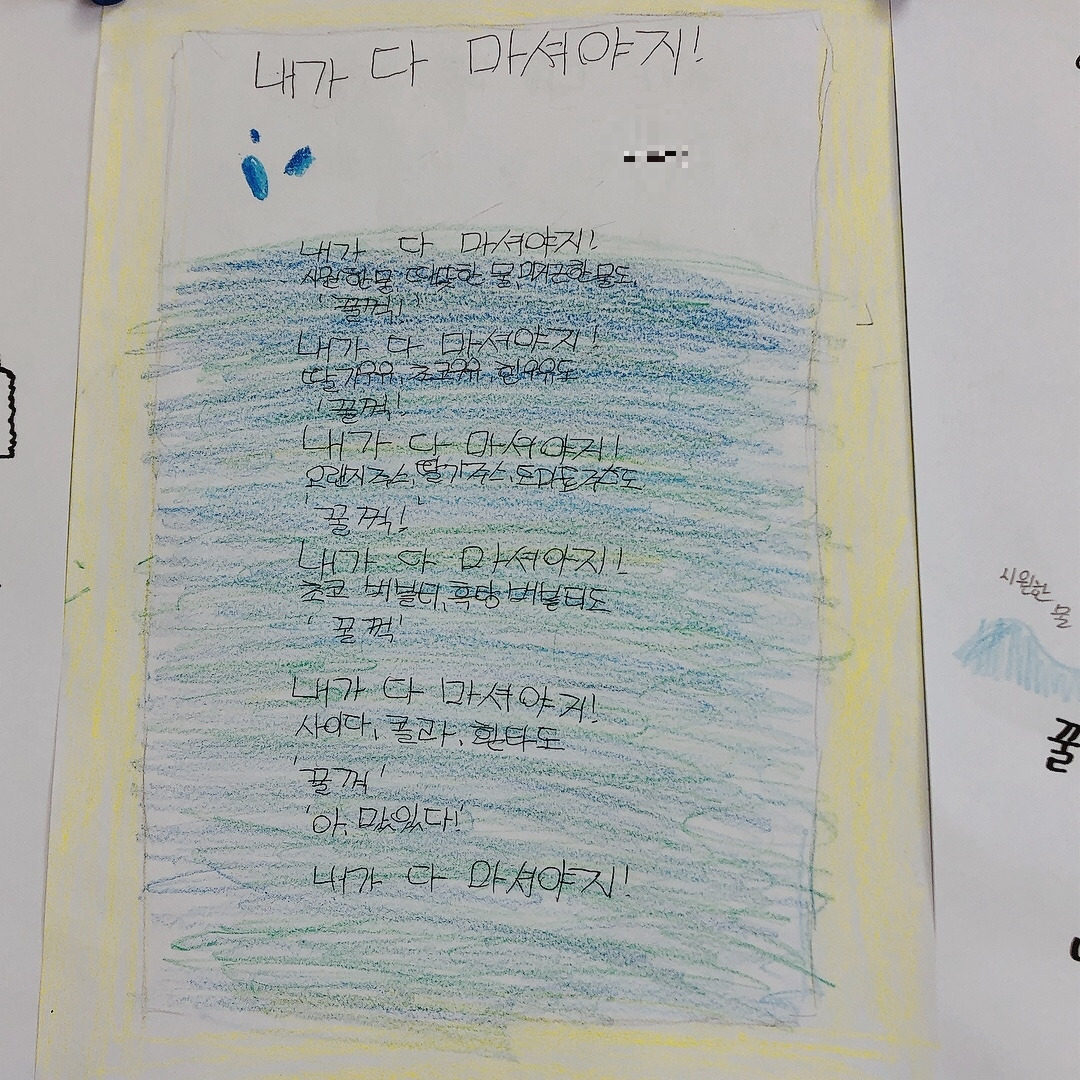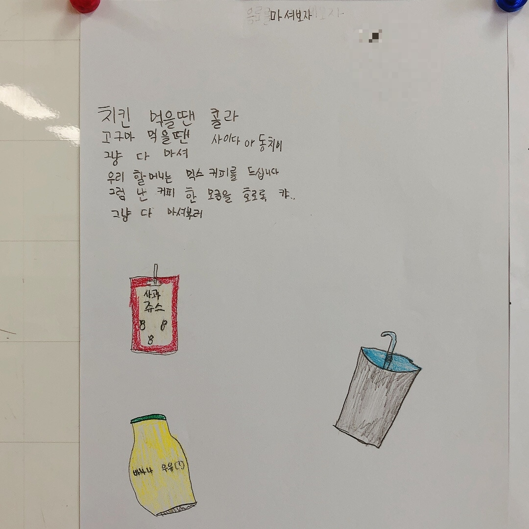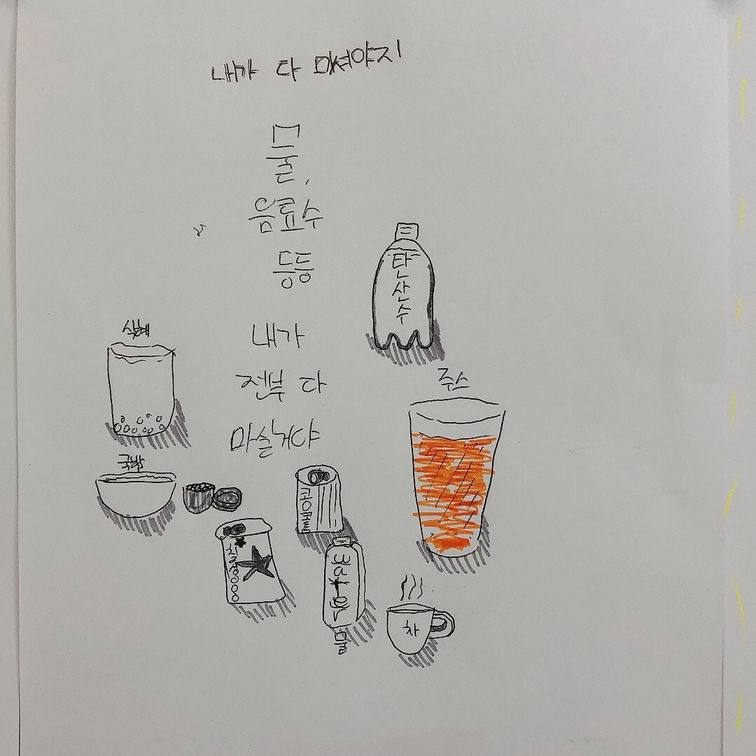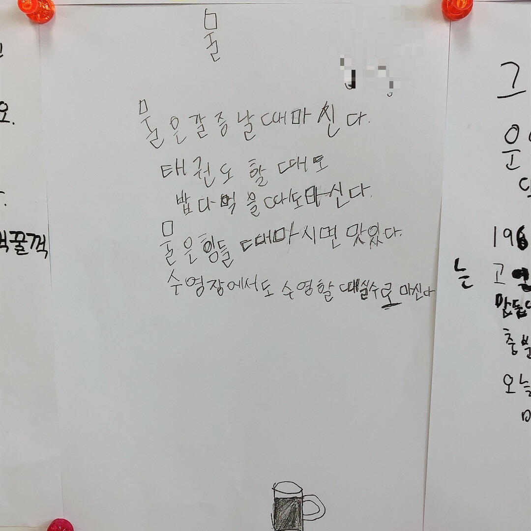 어떨 때 마시는지, 어떻게 마시는지 다양한 ‘마심’들이 있었다. 마시는 것에 대한 다양한 생각이 있었다. 안 먹어본 사람이 먹으면 계속 먹을 거라며 탄산이 너무 맛있다는 아이, 앞으로도 열심히 야무지게 마시겠다는 아이까지 자기가 좋아하는 ‘마실 것’에 대해 즐겁게 썼다. 마실 것에 대한 선호가 확실하게 있는 우리 반이었다.