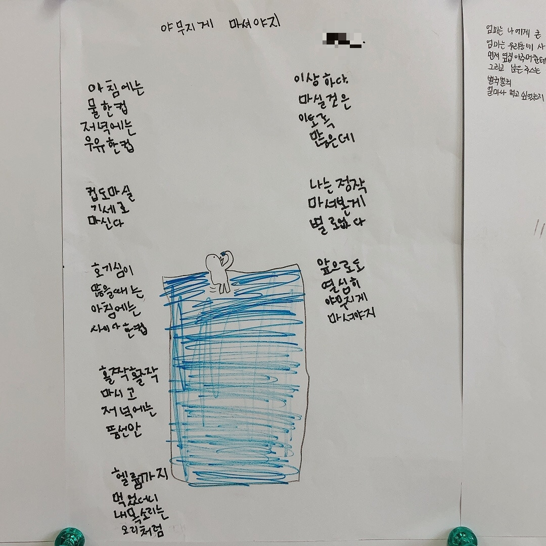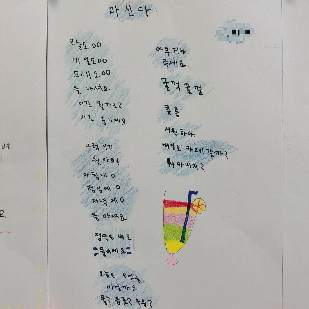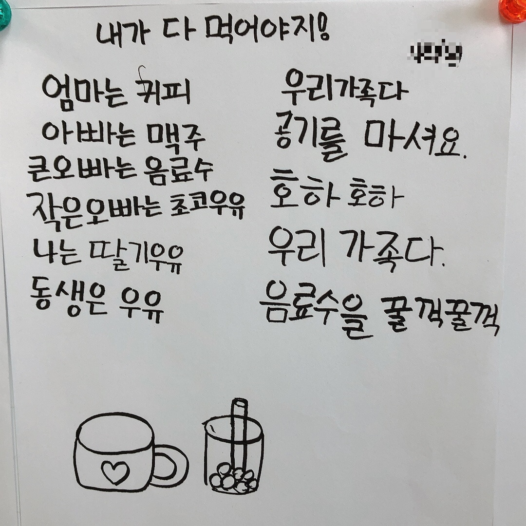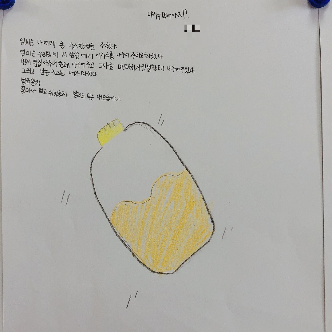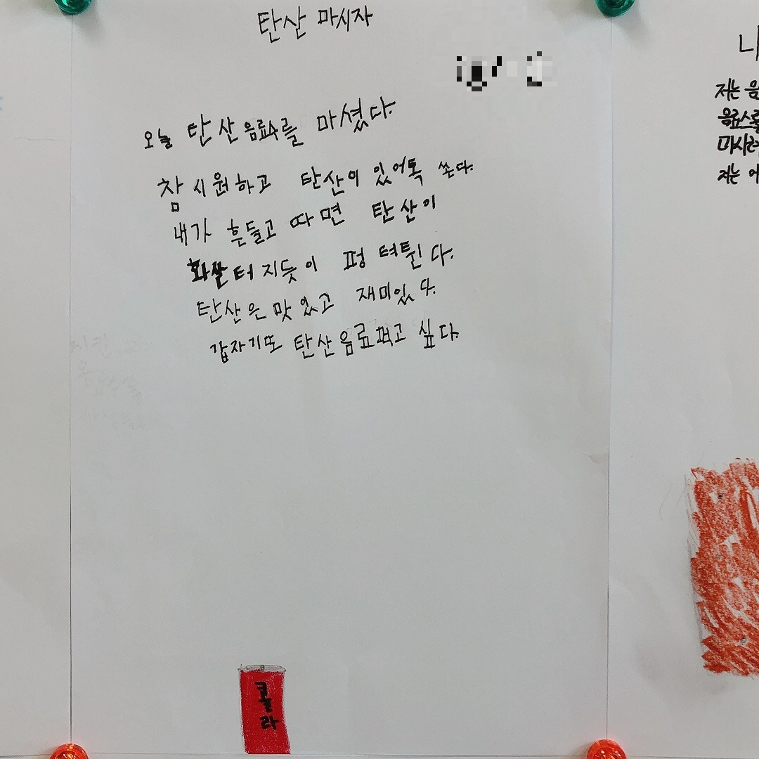 어떨 때 마시는지, 어떻게 마시는지 다양한 ‘마심’들이 있었다. 마시는 것에 대한 다양한 생각이 있었다. 안 먹어본 사람이 먹으면 계속 먹을 거라며 탄산이 너무 맛있다는 아이, 앞으로도 열심히 야무지게 마시겠다는 아이까지 자기가 좋아하는 ‘마실 것’에 대해 즐겁게 썼다. 마실 것에 대한 선호가 확실하게 있는 우리 반이었다.
