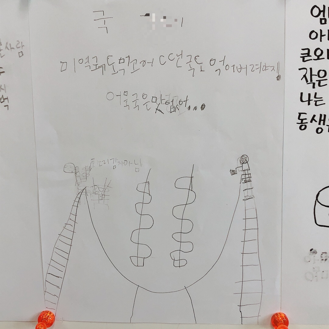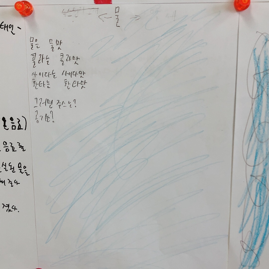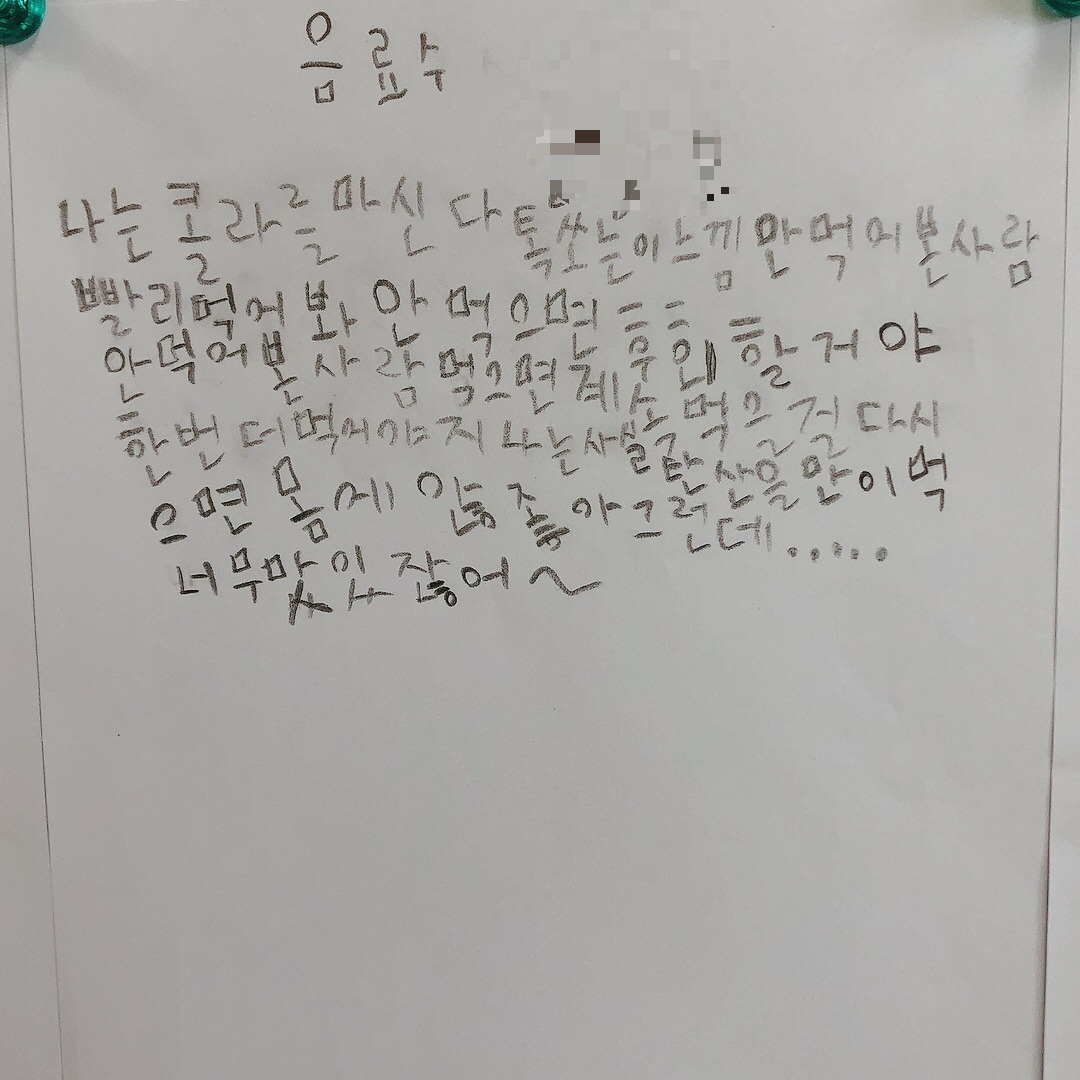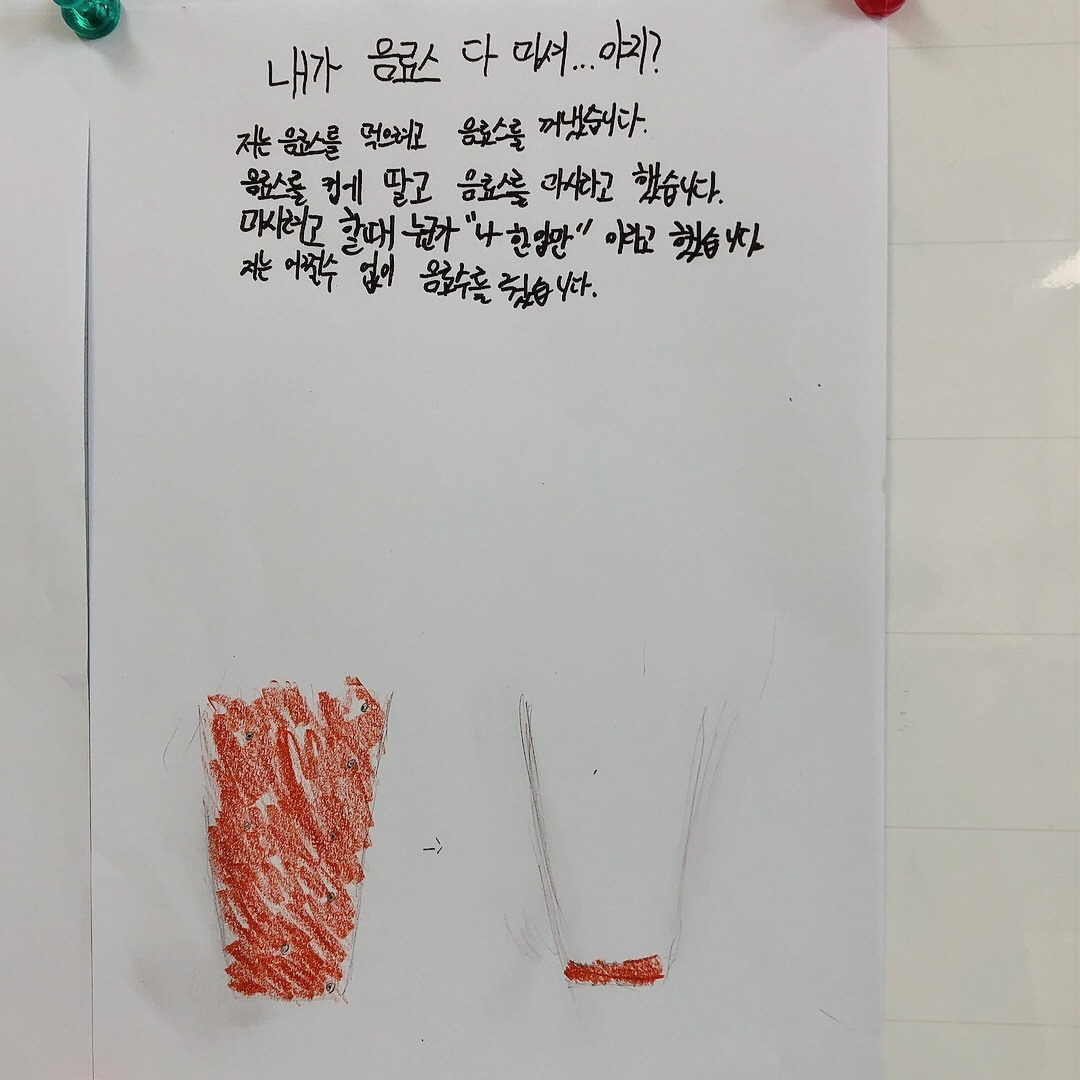 어떨 때 마시는지, 어떻게 마시는지 다양한 ‘마심’들이 있었다. 마시는 것에 대한 다양한 생각이 있었다. 안 먹어본 사람이 먹으면 계속 먹을 거라며 탄산이 너무 맛있다는 아이, 앞으로도 열심히 야무지게 마시겠다는 아이까지 자기가 좋아하는 ‘마실 것’에 대해 즐겁게 썼다. 마실 것에 대한 선호가 확실하게 있는 우리 반이었다.