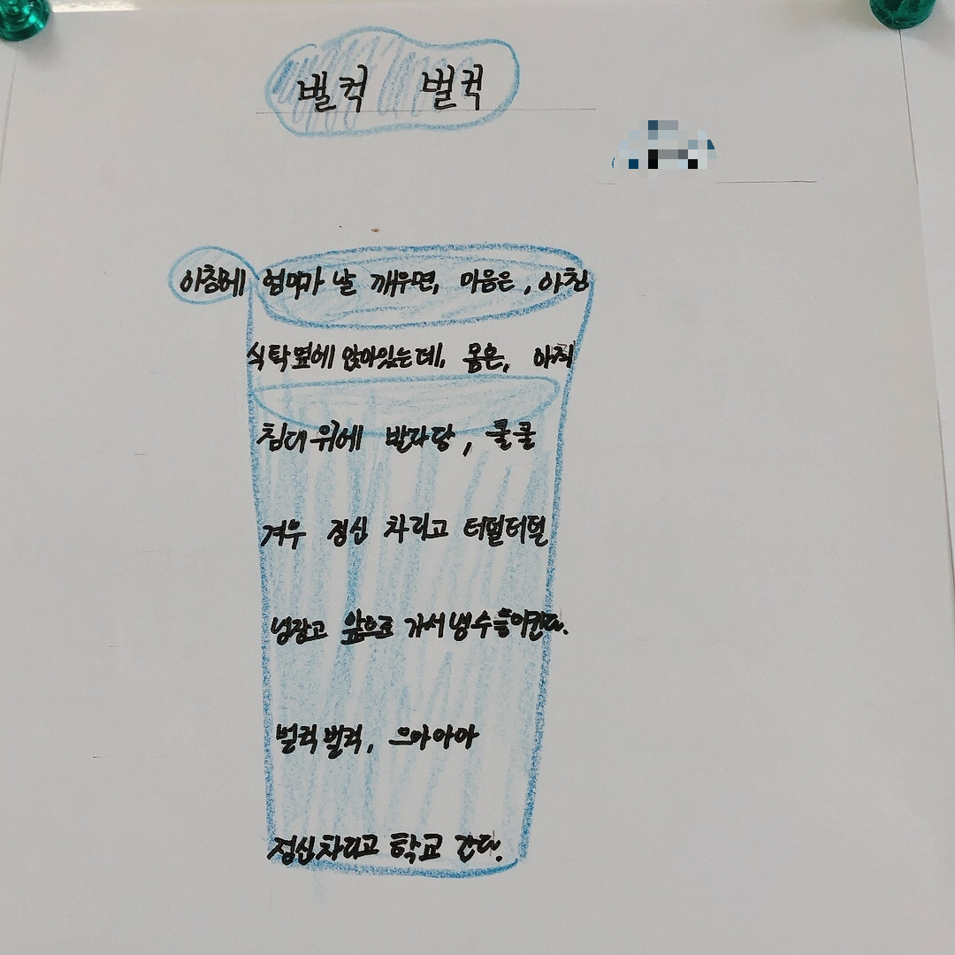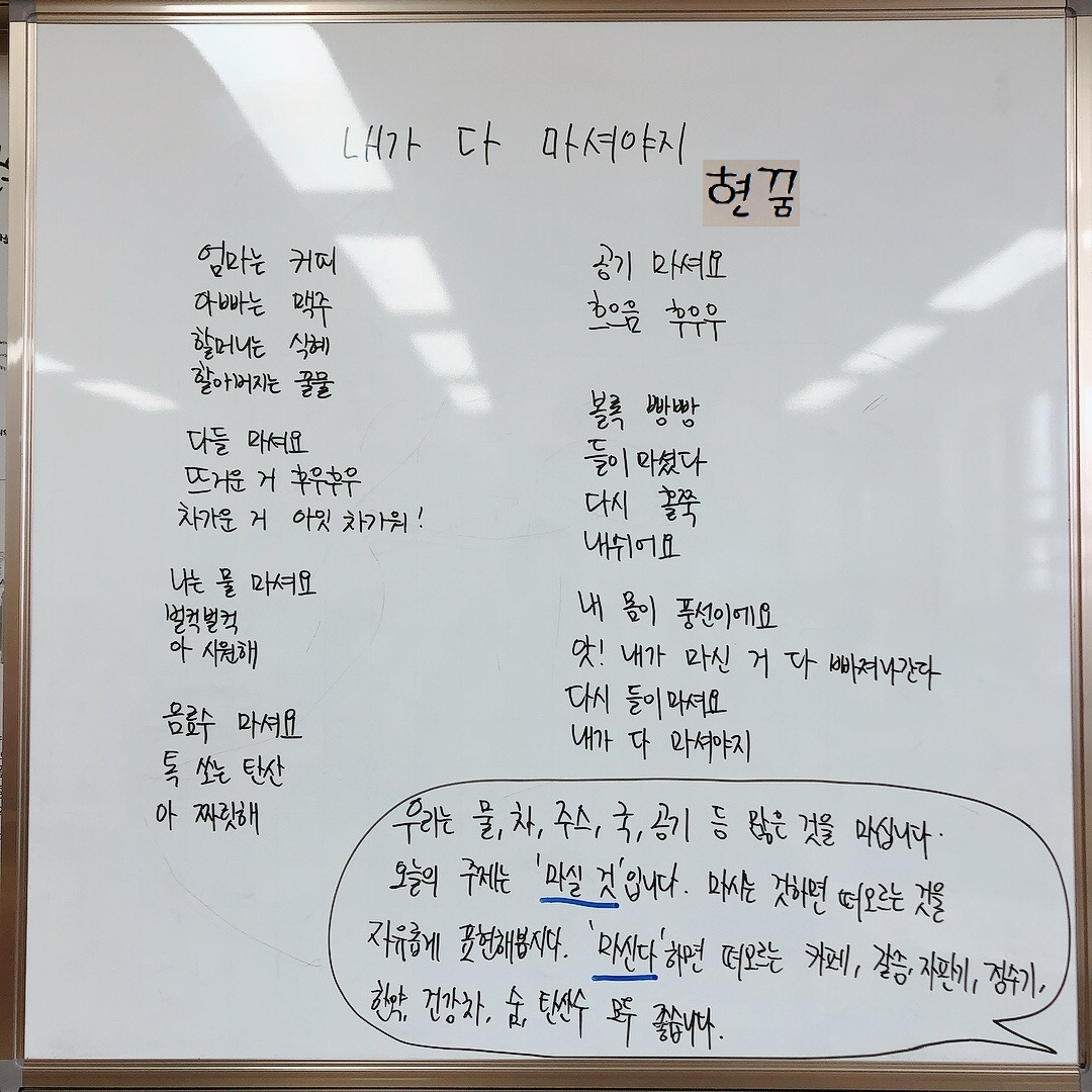 아이들에게 보여준 나의 시에는 여러 사람이 등장해 마신다. 엄마, 아빠, 할머니, 할아버지는 무엇을 마실까? 옛 기억을 더듬어 무엇을 자주 마셨는지, 무엇을 마실 때 좋아하셨는지 떠올렸다. 엄마는 커피, 아빠는 맥주, 할머니는 식혜, 할아버지는 꿀물을 마셨다. 인삼차, 대추차, 한약, 막걸리 등 많은 마실 것이 떠올랐지만 이것으로 정했다. 이렇게 뜨거운 것도 차가운 것도 마시는데 그럼 나는 무얼 마실까? 아이들의 마음이 되어 물, 음료수, 공기를 마시는 걸 표현했다. 우리 반 아이들은 가장 좋아하는 체육 시간이 끝나면 교실에 들어오자마자 물부터 찾는다. 벌컥벌컥 물을 마시곤 세상 시원한 표정으로 행복해한다. 그래. 땀 흘리고 마시는 물이니 얼마나 달까? 꿀맛은 이런 거다 싶을 거다. 음료수를 마실 때는 톡 쏘는 탄산으로 목구멍이 놀라면서도 그 짜릿함을 즐기곤 한다. 이렇게 액체로 된 것만 마실까? 우리가 하루도 안 빠지고 매 순간 가장 많이 마시는 공기를 꼭 시에 넣고 싶었다. “흐으음” 들이마시면 볼록 빵빵해졌다가 “후우우” 내쉬면 다시 홀쭉해지는 아이 배가 떠올라 입가에 미소가 지어졌다. 풍선처럼 빵빵해지지만, 다시 공기가 빠져나가면 왠지 서운한 마음이 들어 다시 힘껏 들이마시며 “내가 다 마셔야지” 소리치는 아이가 상상되어 썼다.