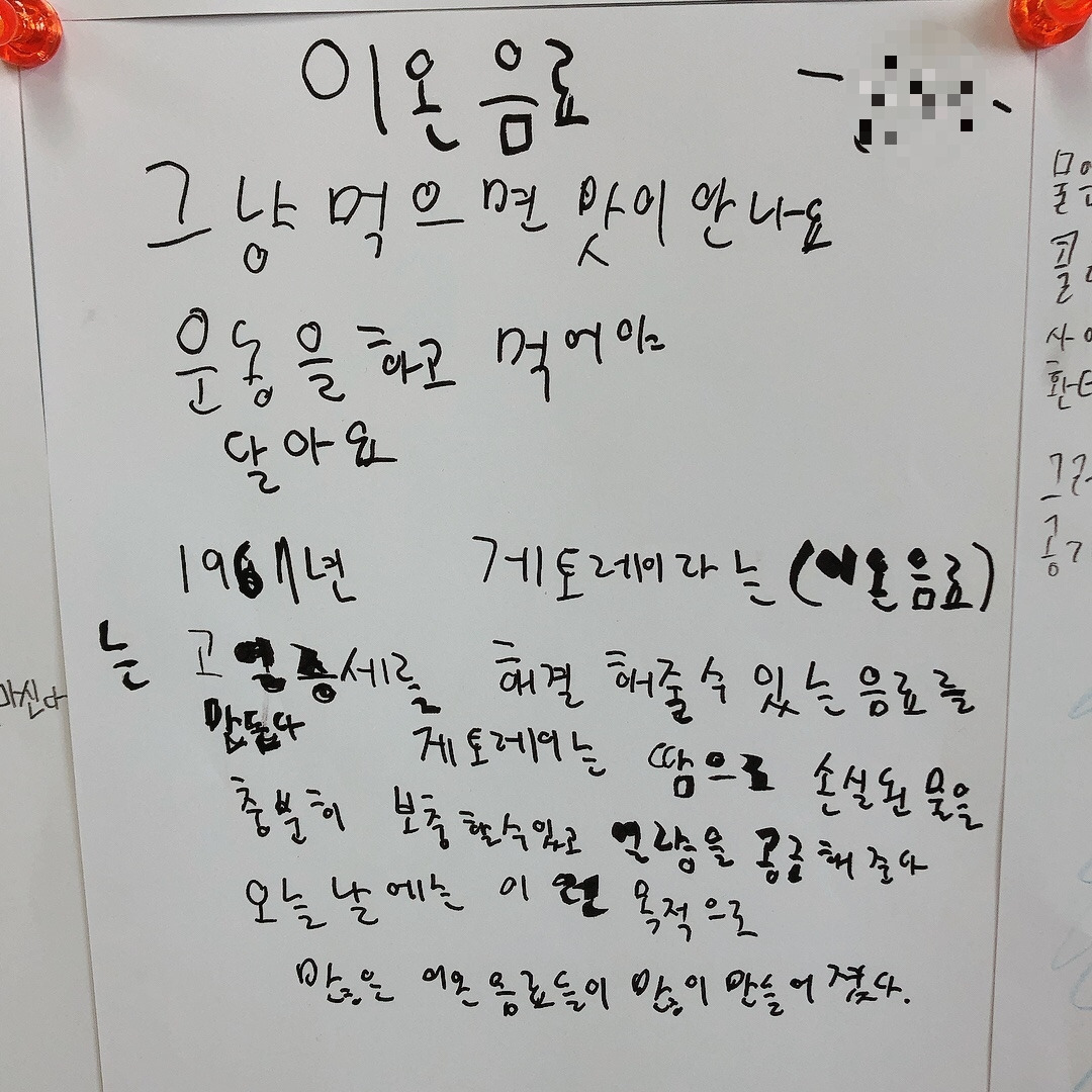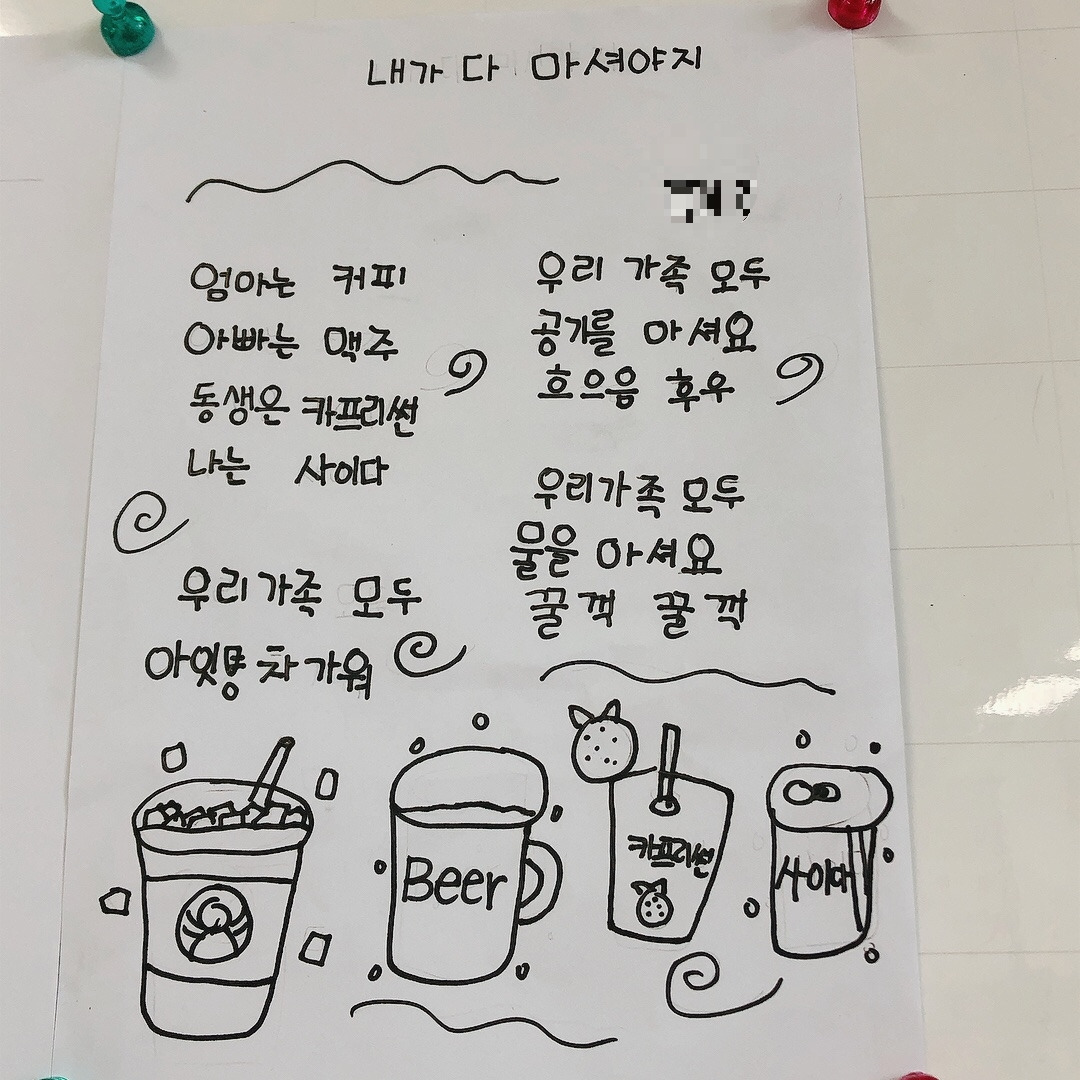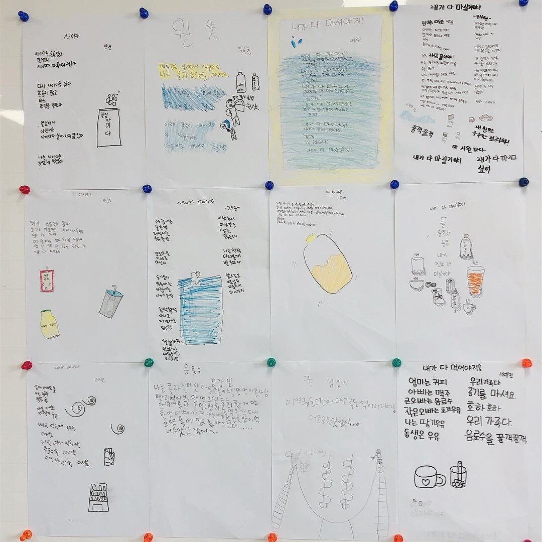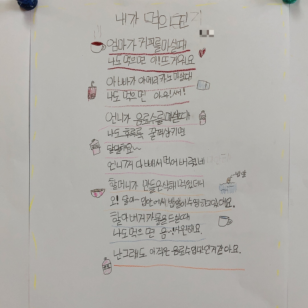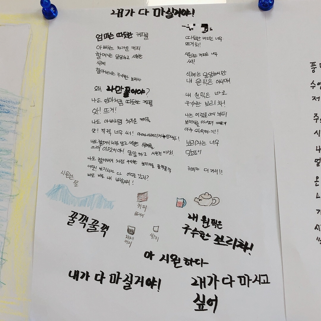 쓰디쓴 커피, 달고 시원한 식혜, 구수한 보리차, 시원한 물, 따뜻한 물, 미지근한 물, 오렌지 주스, 딸기주스, 토마토 주스, 버블티, 사이다, 콜라, 환타 등 온갖 마실 것이 아이들의 시에 등장했다. 단 식혜를 마시면 입 안에서 밥알이 수영하고 있다는 표현이 재밌었다. 오늘도 내일도 모레도 마신다며 “이건 뭘까요?” 묻고 정답을 알려주는 잠깐 퀴즈 같은 시도 있었다. 커피는 쓰다며 어른이 되면 마시겠다는 아이들이 많았다.