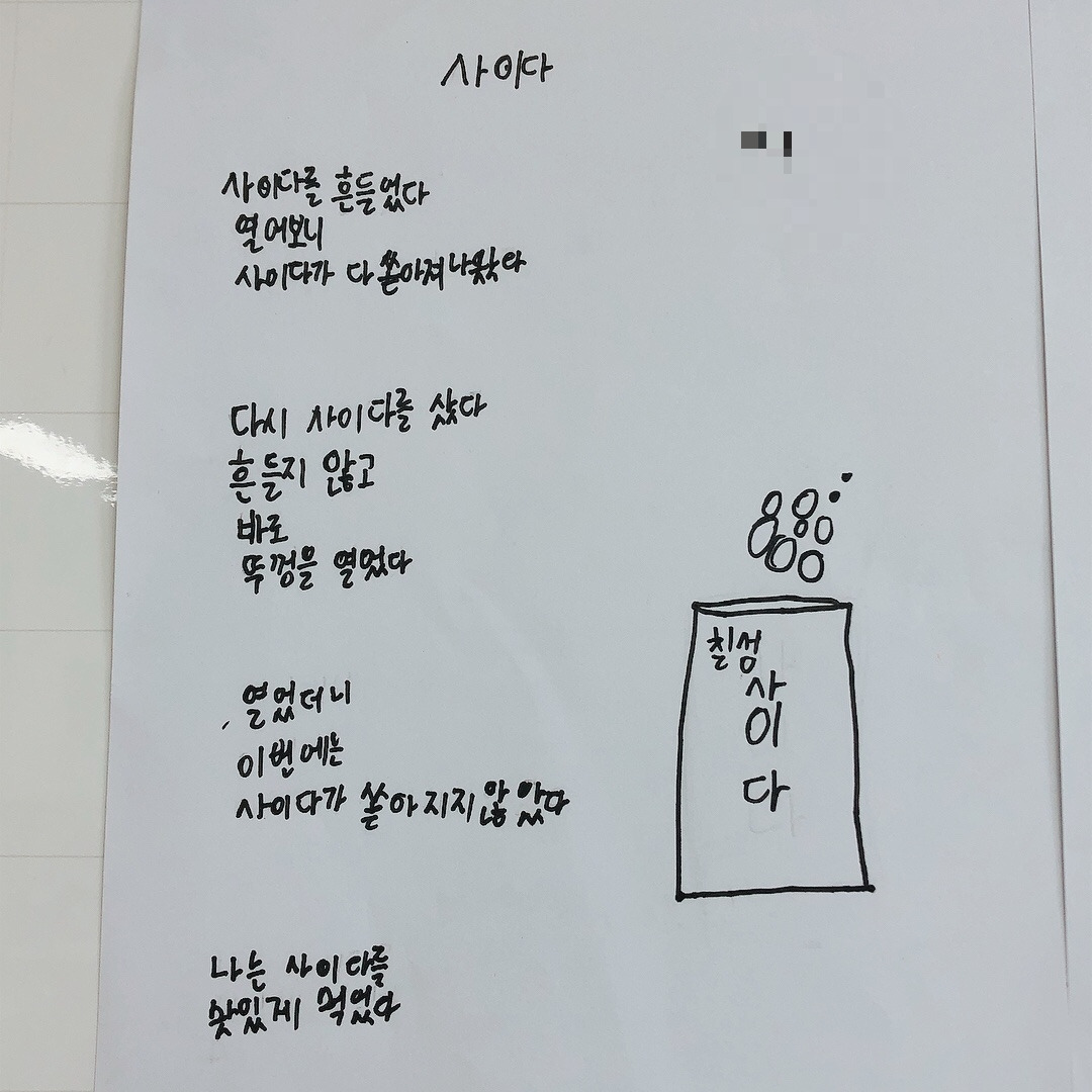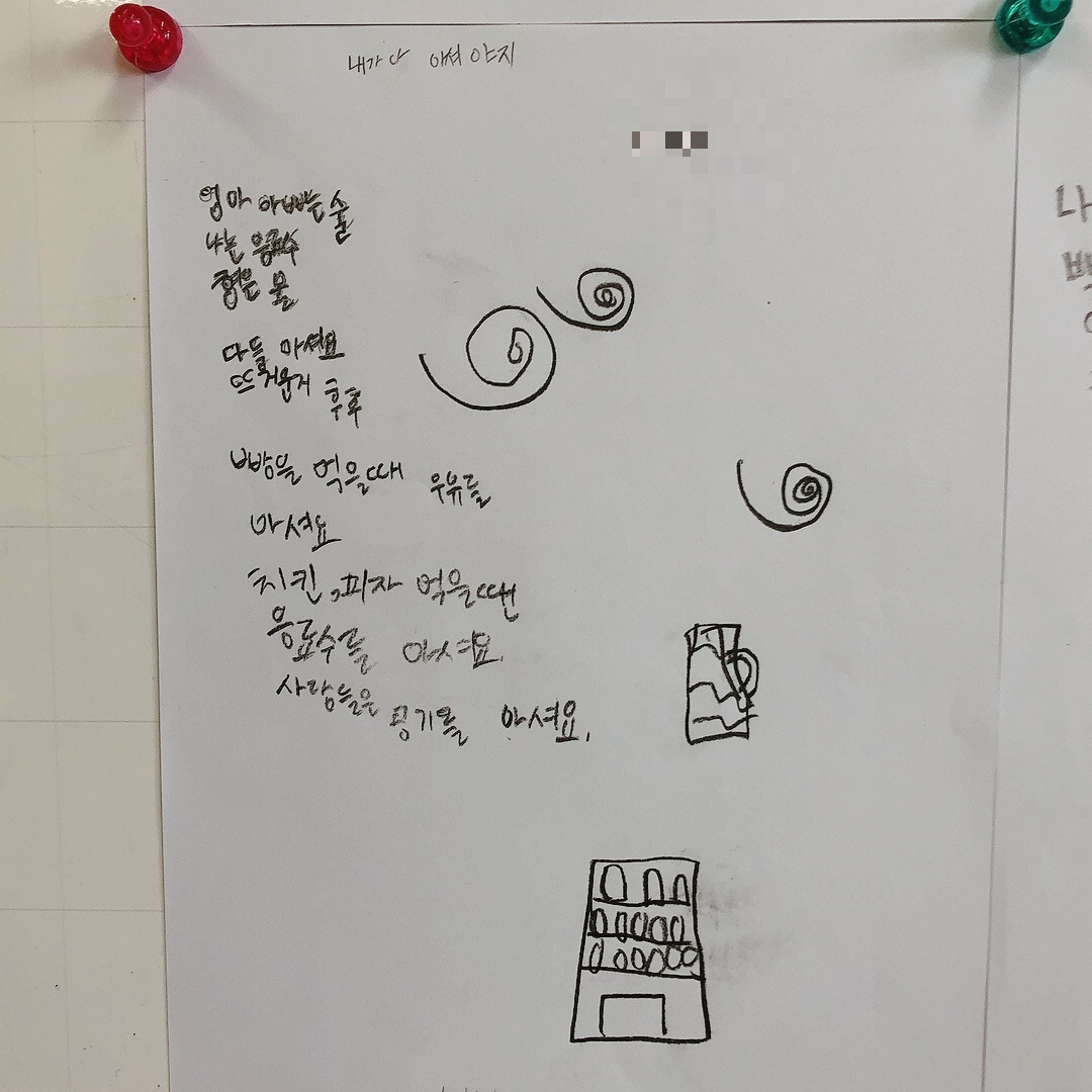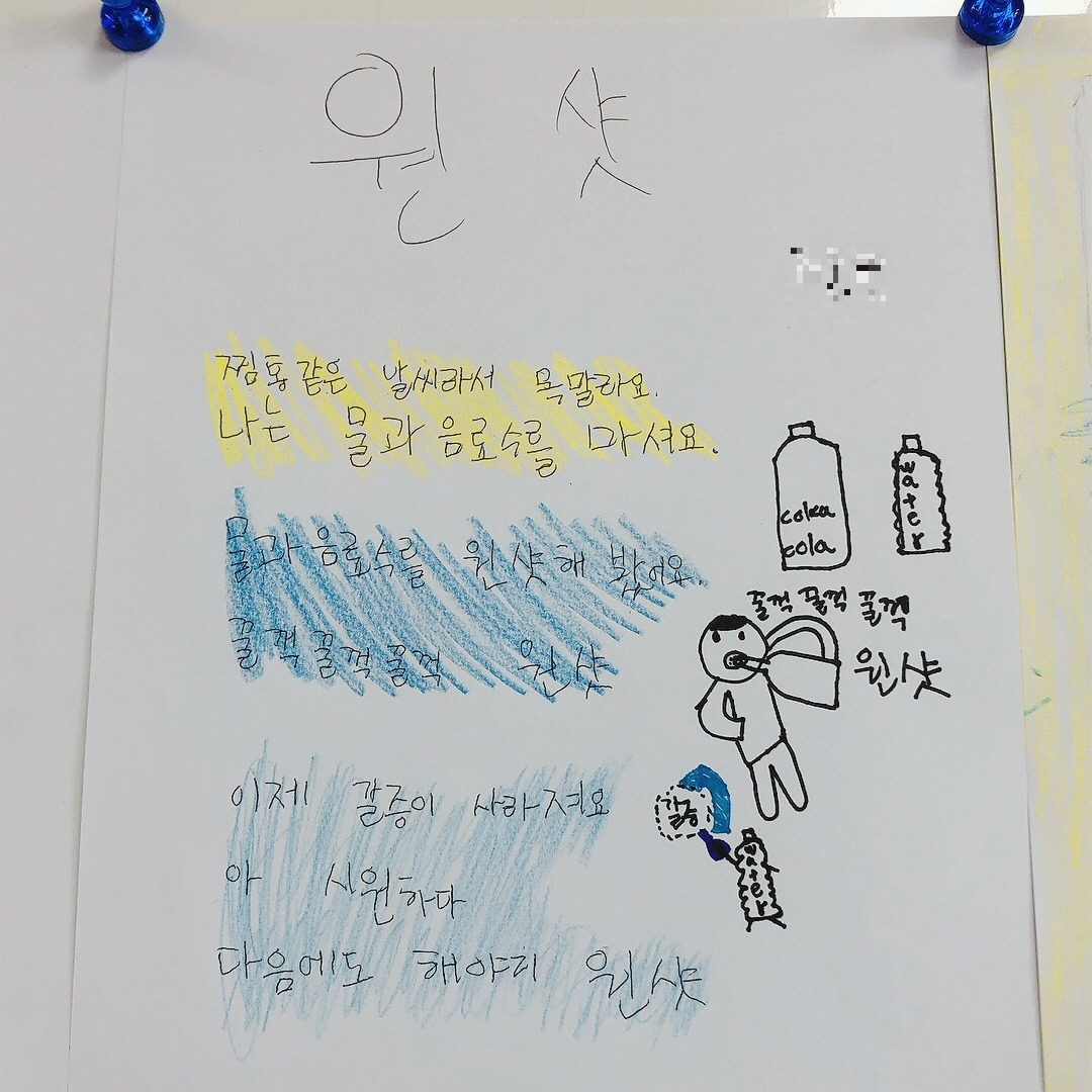 찜통 같은 날씨라서 목이 마르다며 물과 음료수를 원샷하면 갈증이 사라져 시원해 다음에도 또 원샷하겠다며 읽는 사람도 절로 시원한 원샷을 그리게 하는 시를 썼다. 사이다를 흔들고 열어보니 다 쏟아졌다며 다음에는 흔들지 않고 뚜껑을 열었다는 시를 썼다. 다른 아이는 흔들고 따면 탄산이 화산 터지듯이 펑 터진다 했다. 경험에서 우러나온 지혜가 엿보였다. “나눠 먹어야지”라는 제목의 시에서는 엄마가 주신 주스 한 병을 옆집 아주머니, 마트 가게 사장님과 나눠 마셨다. 남은 주스를 벌컥벌컥 얼마나 먹고 싶었는지 빨리도 먹으면서도 이웃과 나누는 것을 배우고 행동한 아이가 기특했다. 음료수를 컵에 따르고 마시려고 할 때 누군가 “나 한 입만”을 외쳐 어쩔 수 없이 음료수를 줬다는 아이의 시에는 배려하는 착한 마음씨가 보였다. 시는 시를 쓴 사람을 닮았나 보다. 심성이 고운 이 아이는 시에도 이런 마음이 스며들어 있었다.
