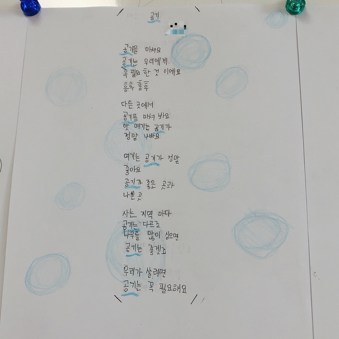 공기가 나쁜 곳과 좋은 곳이 있다? 우리가 살려면 공기는 꼭 필요한 것이다. 이런 좋은 공기를 마시기 위해 나무를 심는 등 우리의 노력이 필요하다는 것까지 일깨워주는 시였다.