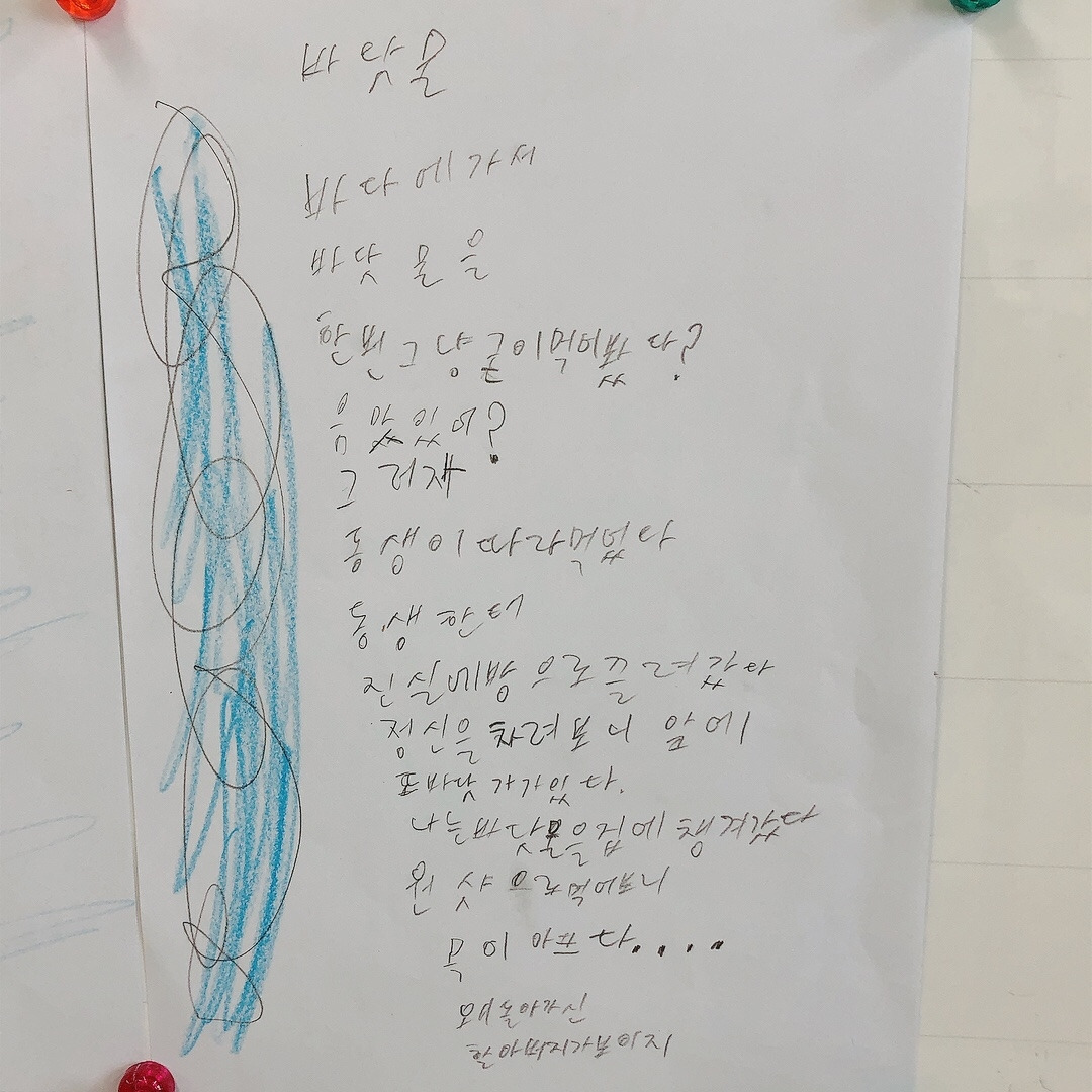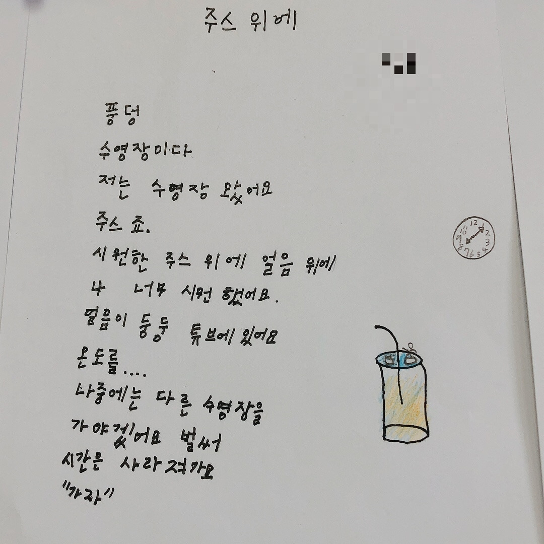 항상 열심히 시를 써 감각적인 시를 완성해내는 아이라 이번에도 어떤 시를 썼을까 기대하며 읽었다. 읽자마자 ‘설마 주스를 마시는 걸 수영장에 온 것으로 표현한 걸까?’ 하는 놀라운 마음에 “수영장이랑 주스를 어떻게 표현한 거야?”라고 하니 주스가 수영장이라고 했다. 이 작은 시인에게 시원한 주스는 수영장이었다. 주스 위에 얼음이 떠 있는 모습이 수영장에 떠 있는 튜브였다. 시 옆 그림처럼 주스 위 튜브에 떠 있는 아이가 머릿속에 그려졌다. “나 너무 시원했어요”, “나중에는 다른 수영장을 가야겠어요. 벌써 시간은 사라져 가요”라는 표현과 마지막에 “가자”라는 마무리까지 이제는 자신의 시에 비유를 쓸 수 있고 따옴표를 사용해 말하는 느낌을 표현할 수 있는 아이가 생겼다. 항상 자기만의 시를 멋지게 쓰는 아이에게 대단하다며 연신 칭찬해주며 아이의 시를 읽는 나도 기분이 좋았다.