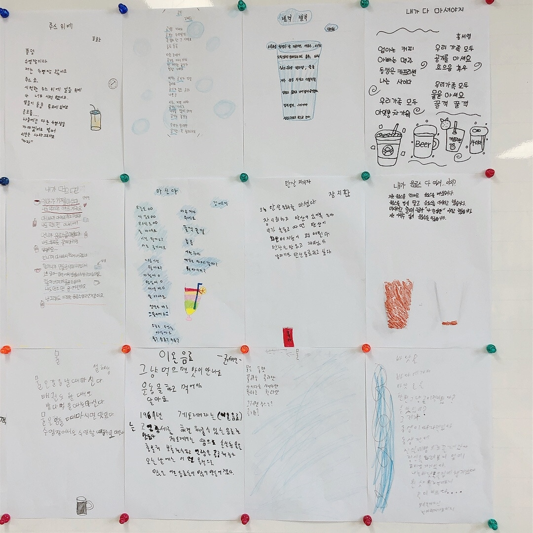 우리에게 음식(飮食)은 떼려야 뗄 수 없는 중요한 것이다. 누군가 만나면 ‘식사하셨어요?’로 안부를 묻고 ‘죽고 싶지만 떡볶이는 먹고 싶어’라는 책 제목처럼 먹기 위해 살기도 한다. 먹는 게 삶의 이유가 될 만큼 우리에겐 큰 행복이다. 이 음식(飮食)을 그대로 살펴보면 ‘마실 음’과 ‘밥 식’이 보인다. 즉, 먹는 것과 마시는 것은 떼려야 뗄 수 없다. 그렇다. 우리는 먹고 마신다. 매일 많은 것을 마신다. 물, 차, 국, 주스부터 공기까지 이렇게나 마실 것이 많다. 그런데 줄곧 먹을 것에 대해서만 생각했었다. 마시는 것보단 먹는 것을 먼저 찾았었다. 그럼 이제 마시는 것에 대해 생각해보면 어떨까? 그래서 이번 주제는 ‘마실 것’이었다. ‘마신다’ 하면 떠오르는 카페, 갈증, 자판기, 정수기, 약수, 한약, 건강 차, 탄산수, 숨 등 모든 것이 이번 시의 소재가 될 수 있었다. 마시는 것과 관련된 모든 것을 표현해도 좋다며 가능한 모든 생각을 떠올려 상상력을 마음껏 펼칠 수 있도록 했다.