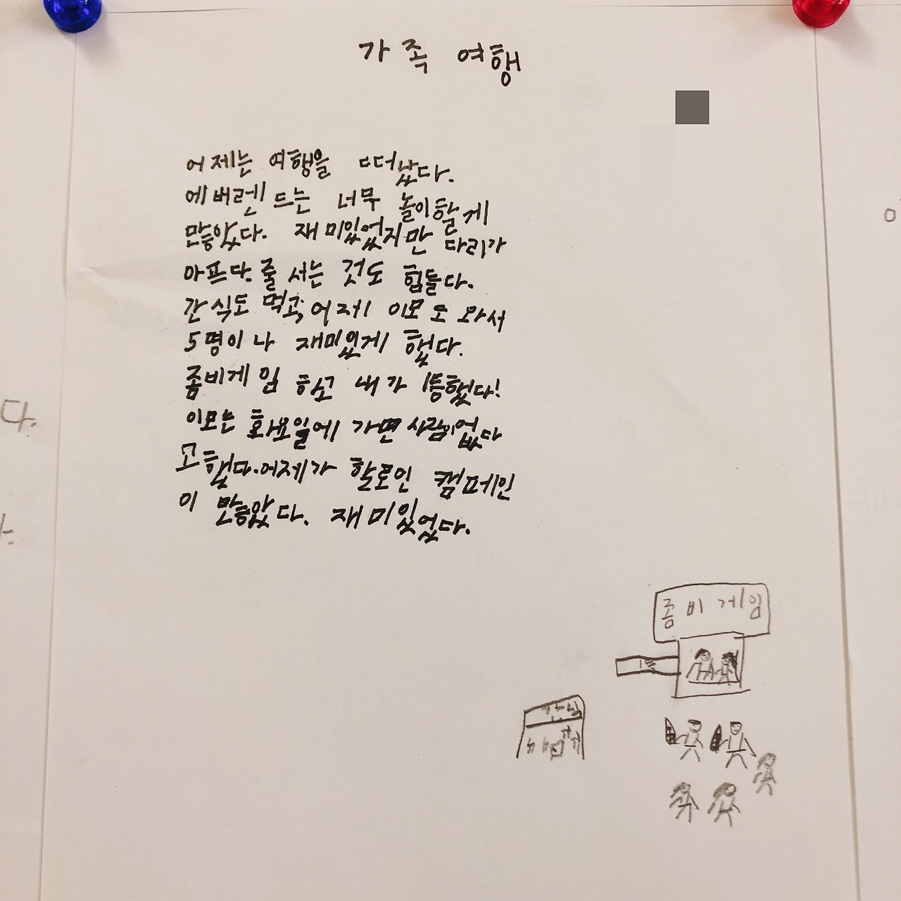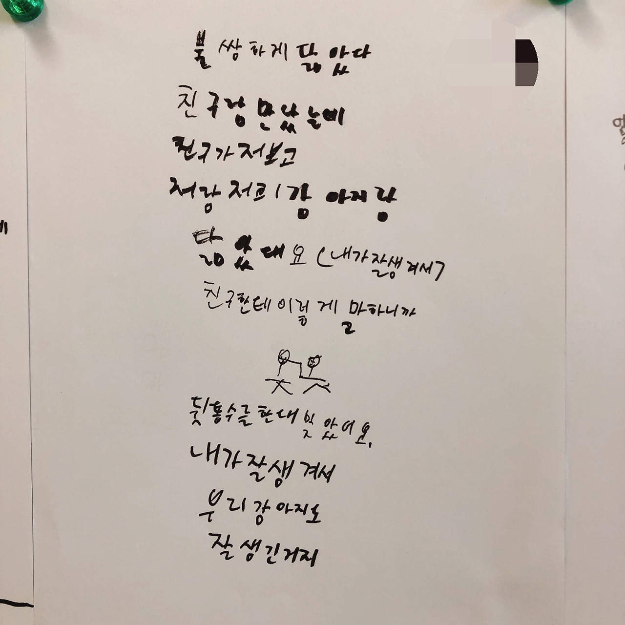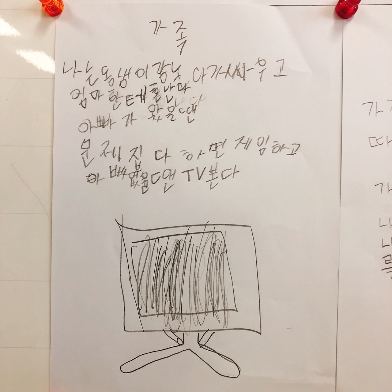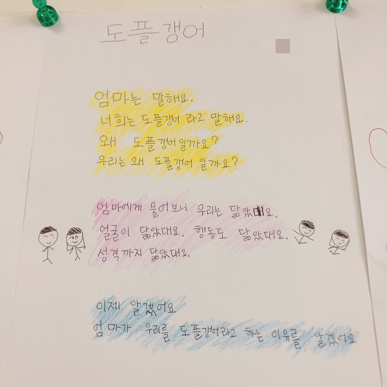엄마한테 혼나고 몰래 TV 보는 이야기, 엄마와 언니 마중을 가 눈에서 레이저 나올 정도로 유심히 지켜보다 머리를 똑같이 한 다른 언니를 보고 착각했던 경험, 아침에 일어나면 “안녕히 주무셨어요?”, 학교 끝나면 누나 만나 “누나 오늘 뭐 했어?”, 회사 끝난 아빠 만나면 “안녕하세요.”하는 내 이야기를 시로 표현한 아이도 있었다.