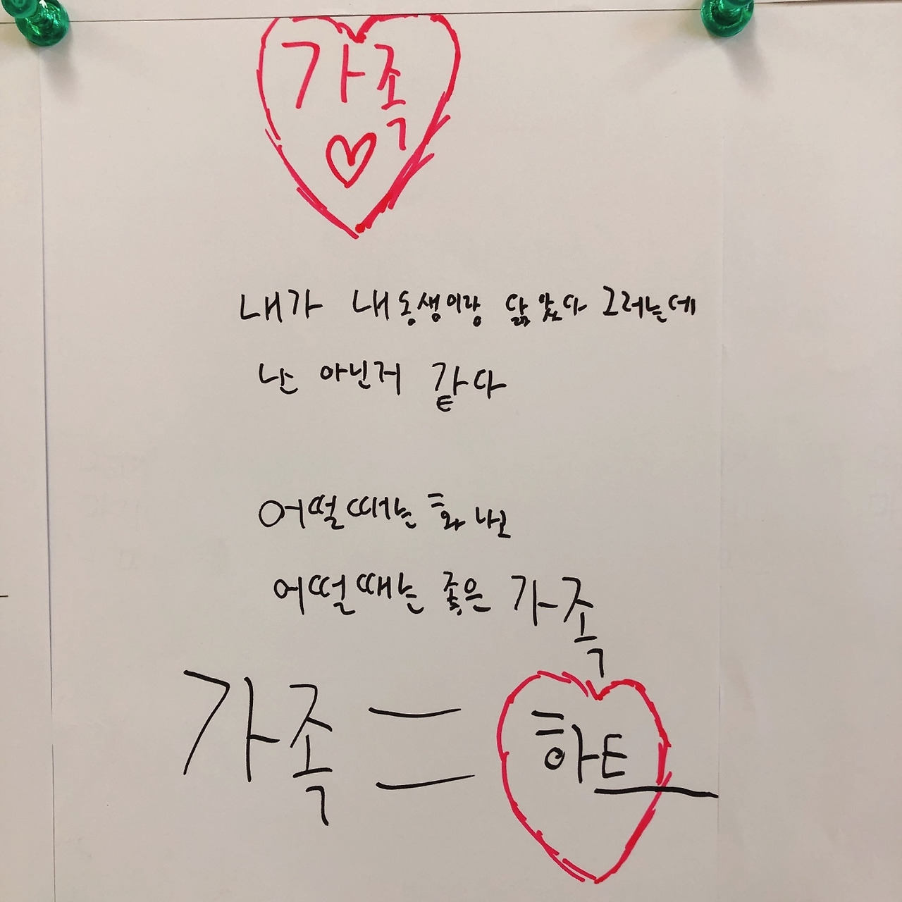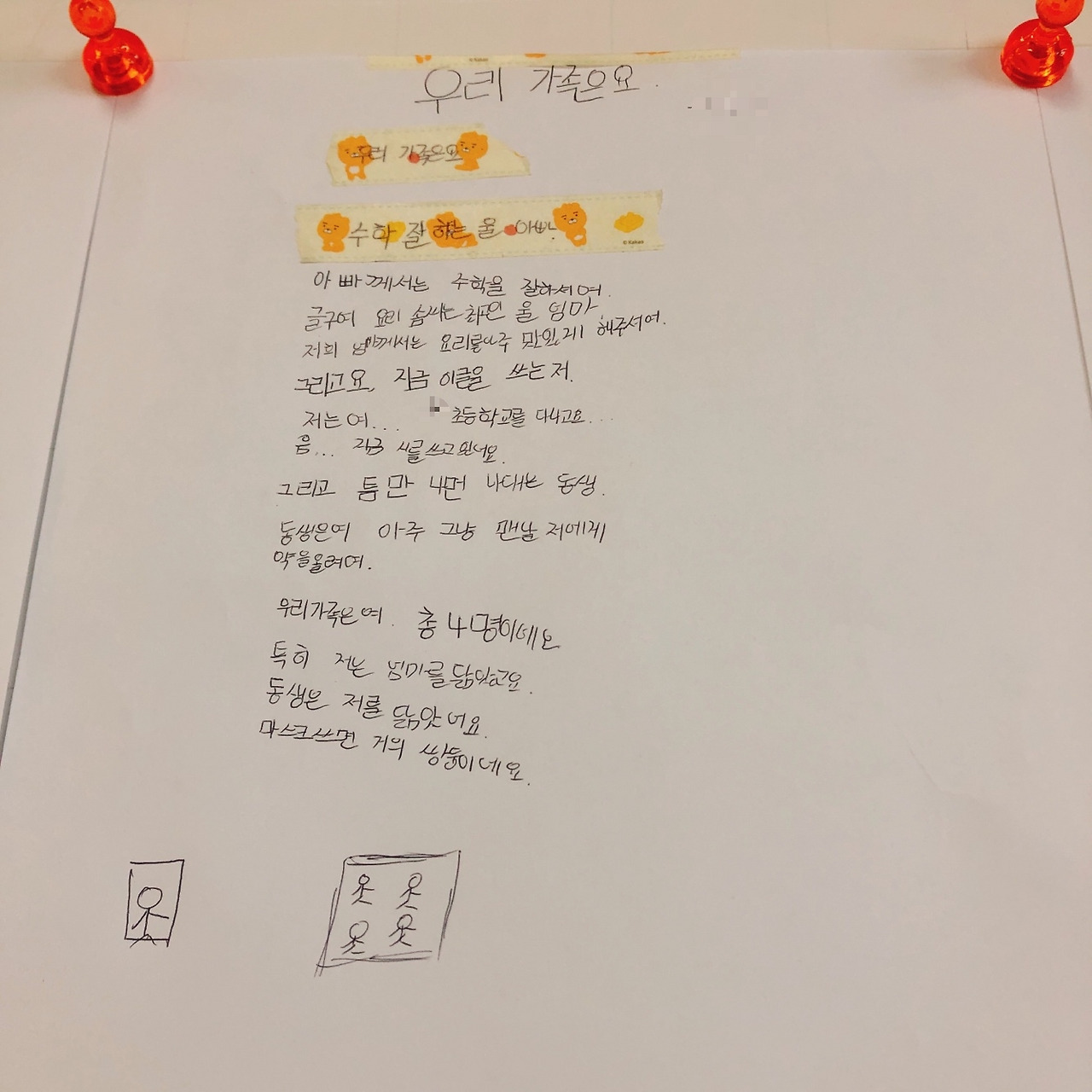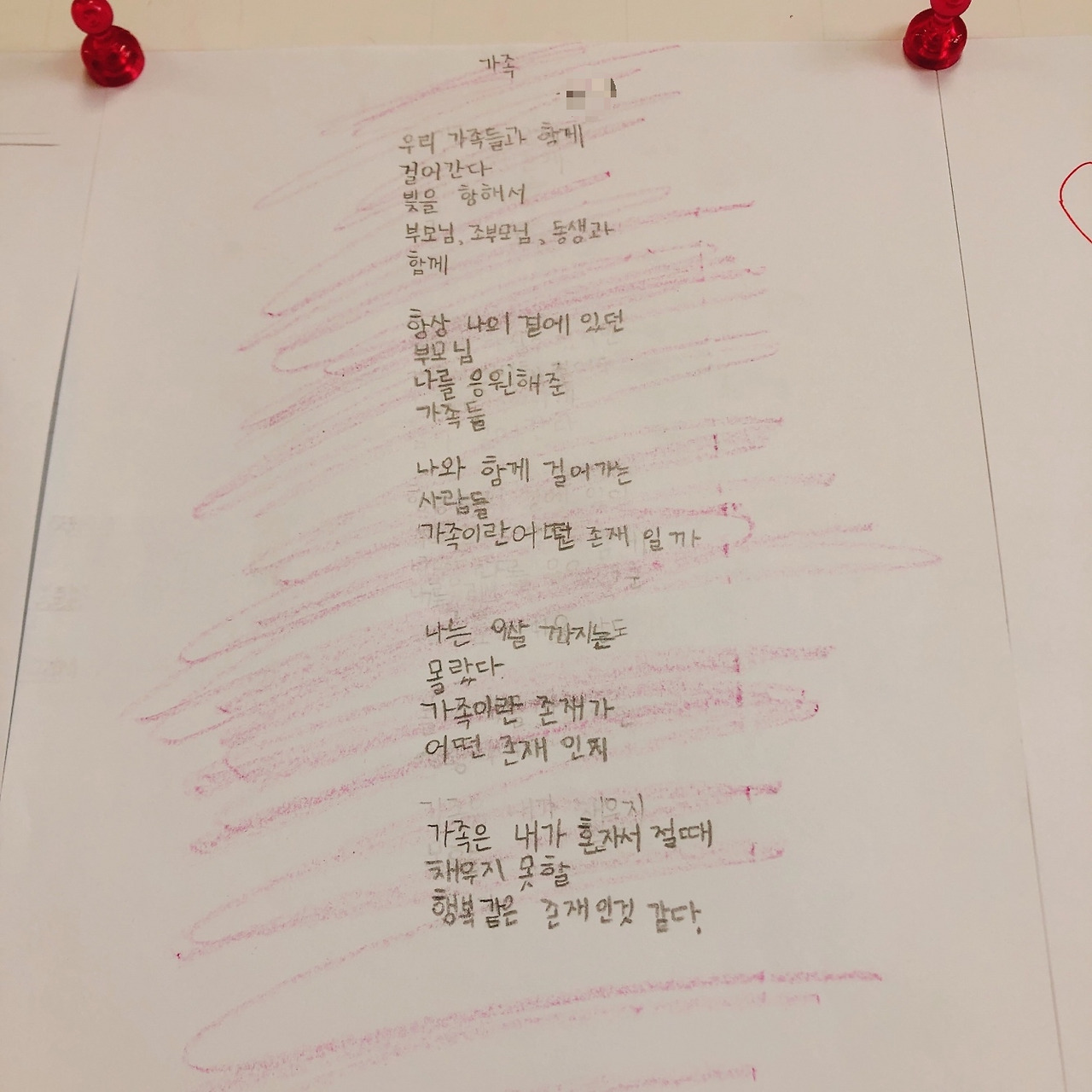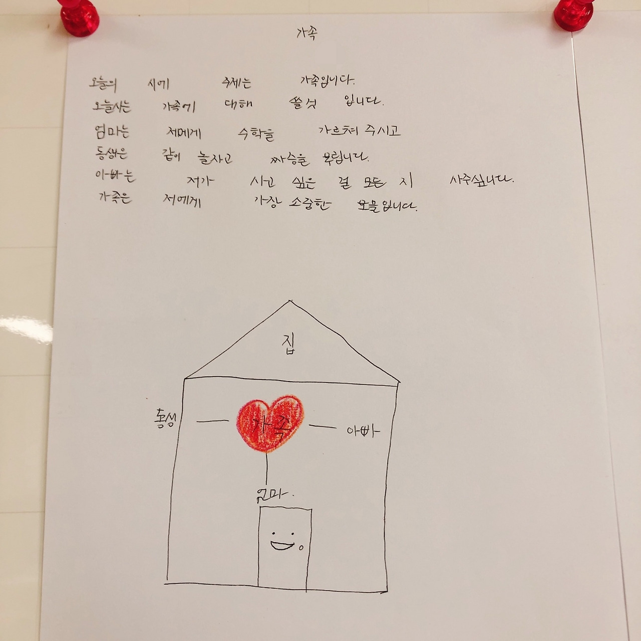 모두 가족을 떠올리며 시를 썼다. 기쁠 때도 슬플 때도 외로울 때도 옆에 있는 가족이다. 항상 나의 편이다. 영원한 나의 편, 가족이다.
