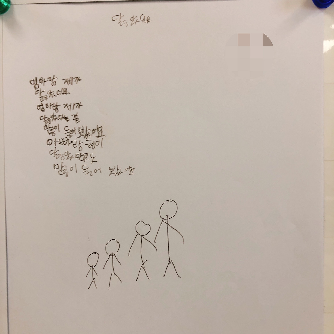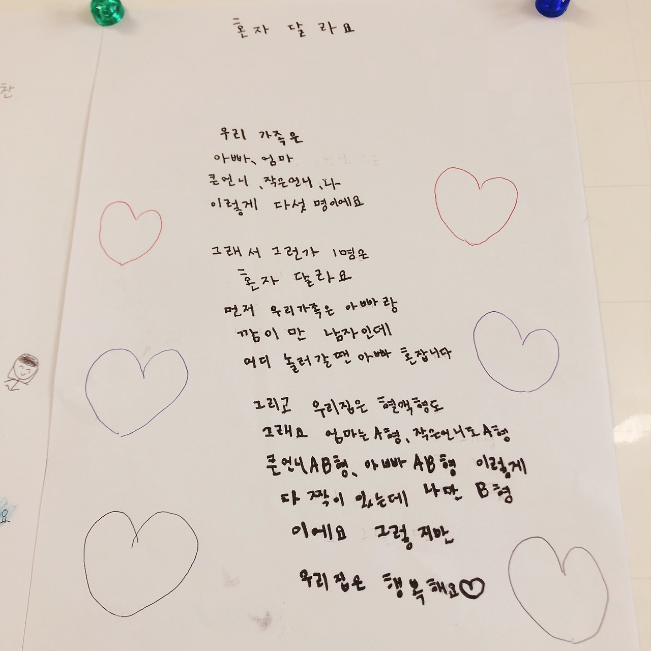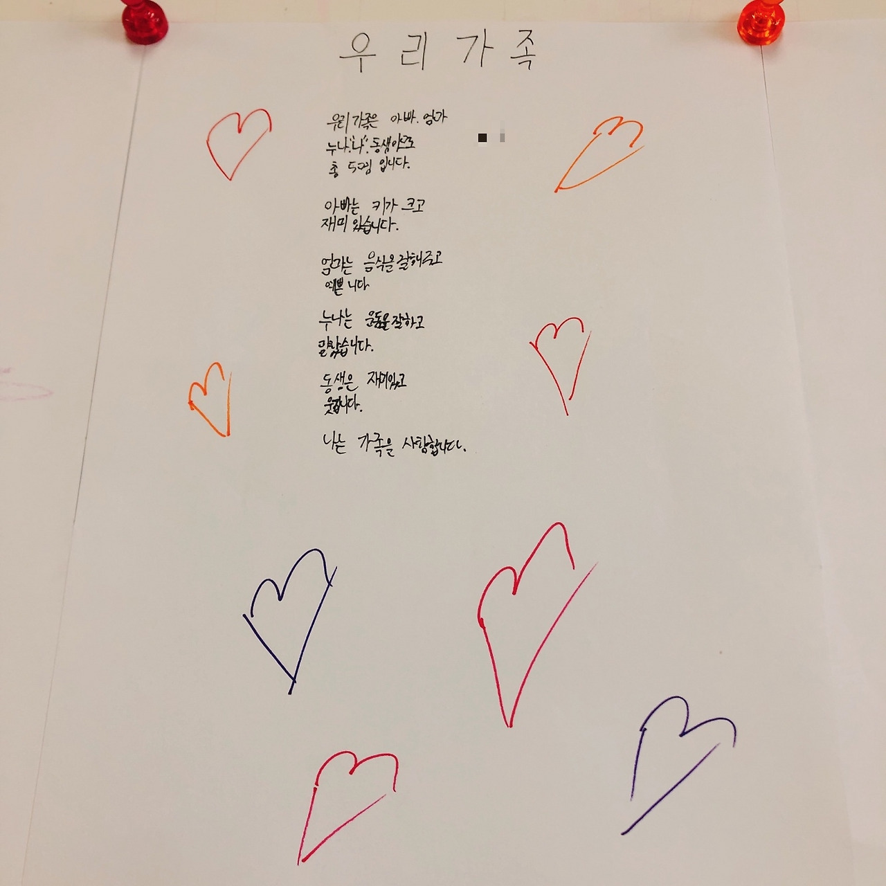 모두 가족을 떠올리며 시를 썼다. 기쁠 때도 슬플 때도 외로울 때도 옆에 있는 가족이다. 항상 나의 편이다. 영원한 나의 편, 가족이다.