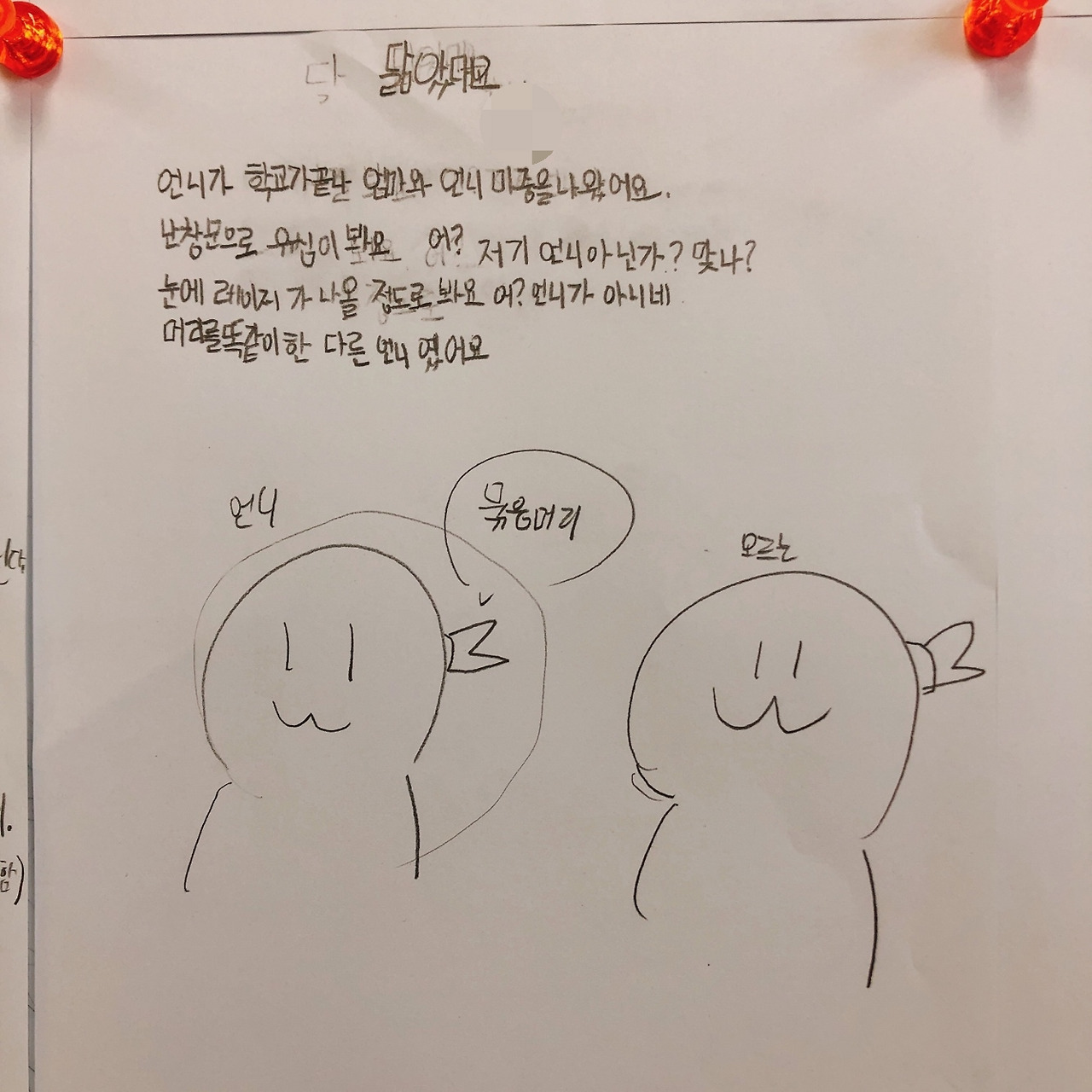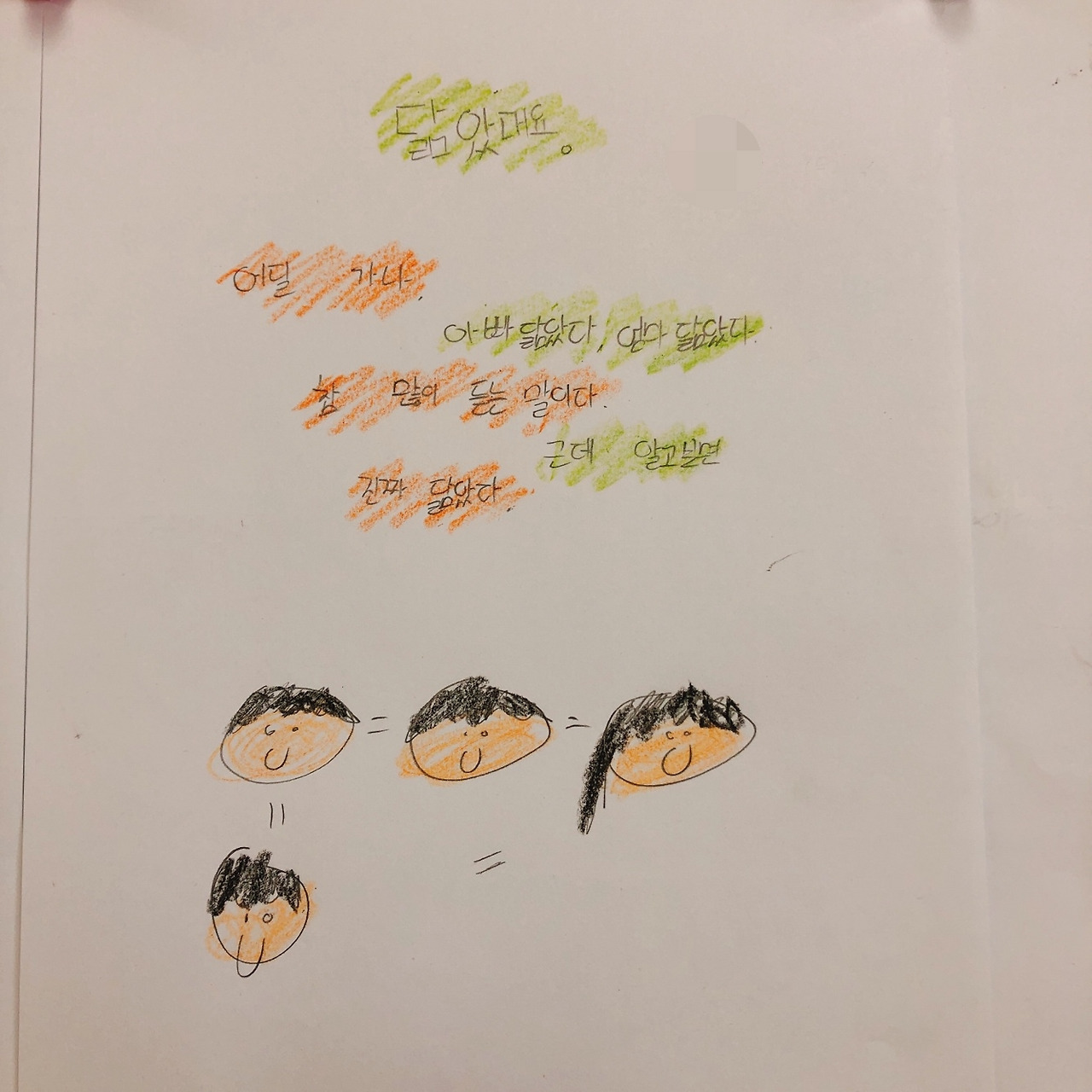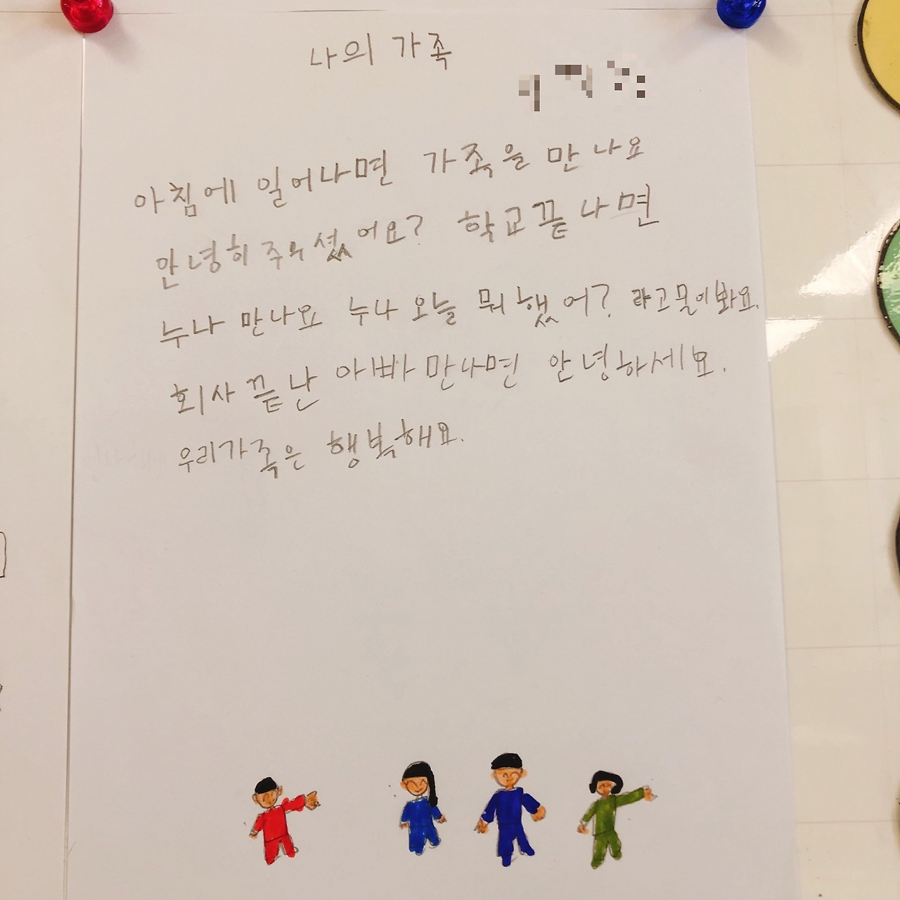 자기는 한사코 안 닮았다며 부정하는 아이도 있었다. 동생이랑 닮았다는데 자기는 아닌 거 같단다. 이 아이는 쌍둥이 동생이 옆 반에 있다. 누가 봐도 쌍둥이인데 멀리서도 똑같이 걸어오면서 안 닮았다고 한다. 똑같이 생겼는데도 말이다. 주변에서 쌍둥이라고 하면 “똑같이 생겼어?” 하는 반응을 숱하게 겪어왔겠지? 앞으로도 계속 듣겠지? 그래서 이제 그만 듣고 싶나 보다. “가족=하트”라고 크게 쓰고 빨간 하트를 그려놓은 걸 보니 닮았든 안 닮았든 그런 건 중요하지 않다. 내가 사랑하는 가족이다.