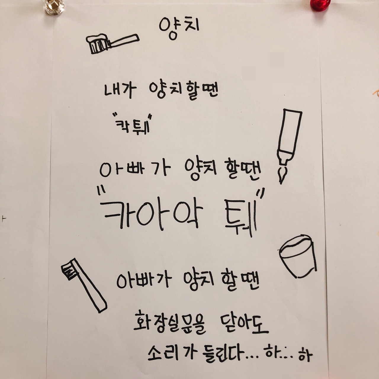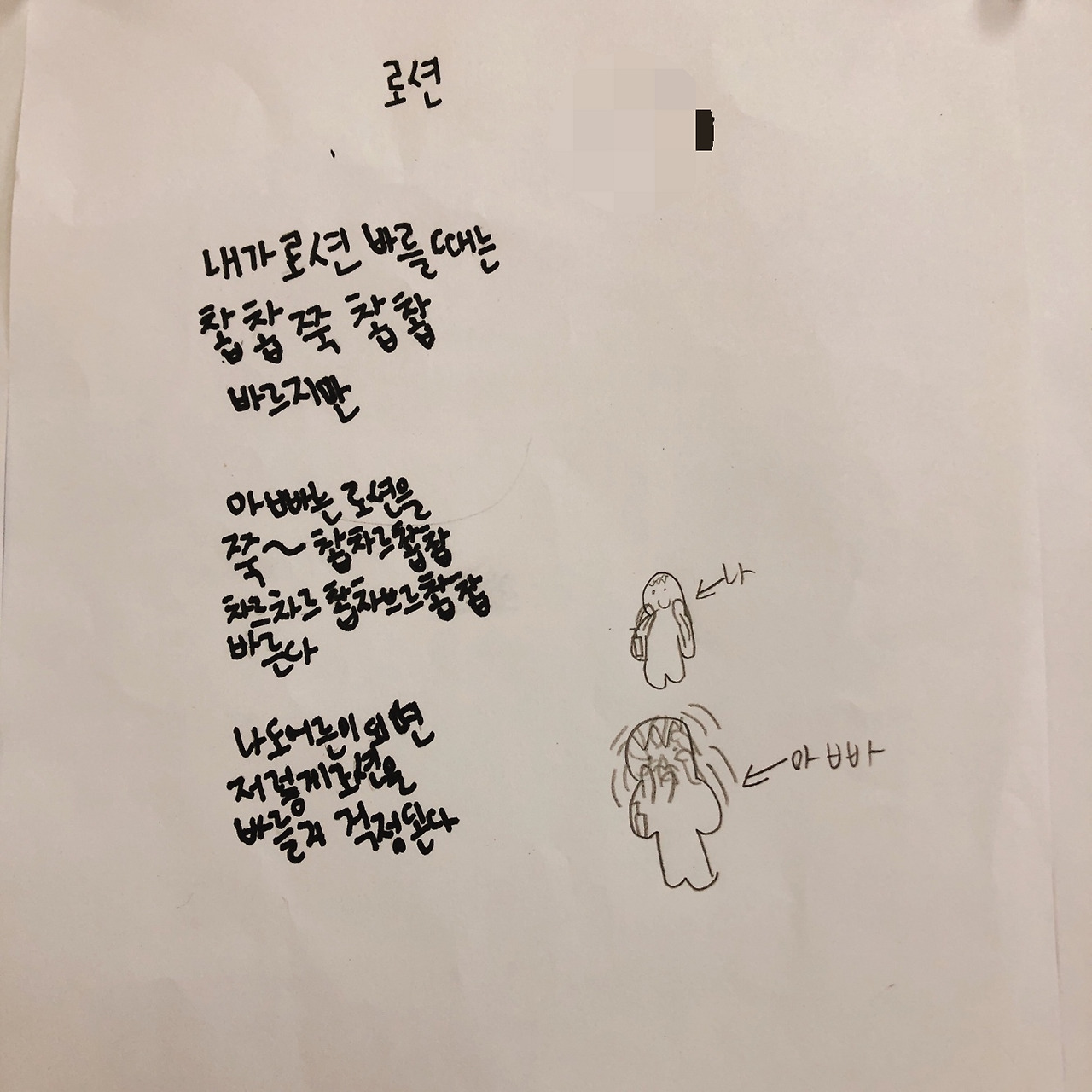 아빠는 로션을 이렇게 바른다며 몸소 시범을 보인다. 아주 소리가 리얼하다. “정말 자세히도 봤구나. 아빠가 여기 오신 줄 알았어.” 나도 어른이 되면 저렇게 로션을 바를지 걱정된다는 것도 참 재밌다. 아빠가 로션 바르는 모습을 실감 나게 연기하더니 시에도 자신과 아빠의 모습을 그려뒀다. 아빠는 로션 바를 때 행동이 크고 소리도 크다. 얼굴 닳겠다며 웃는다. 다른 아이들도 고개를 끄덕이며 격하게 공감하는 걸 보니 다들 아빠들은 그런가 보다.