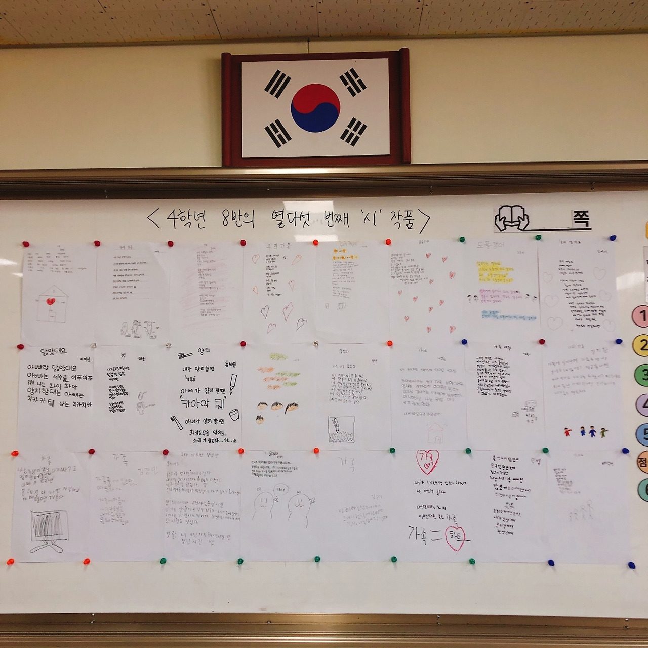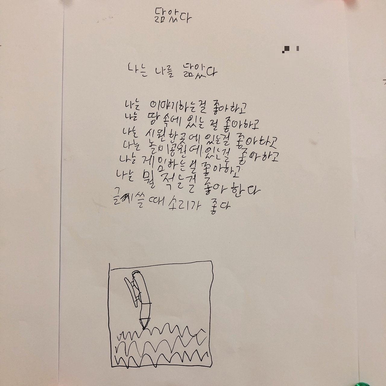 시라는 걸 통해 솔직하게 내 이야기를 할 수 있다. 시를 통해 직접 전하지 못했던 말을 할 수도 있다. 시의 매력을 아이들도 느끼고 있을까? 다 쓰고 나면 뿌듯한 표정, 다른 친구들의 시를 보며 재밌어하는 표정을 보고 있으면 시의 매력을 느끼고 있는 것도 같다. 수줍게 내밀더니 교육과정 발표회 때 내 시를 발표하고 싶다는 아이, 오늘은 시 안 쓰는 날이냐고 묻는 아이를 보니 시 쓰는데 흥미가 붙은 것도 같은데?