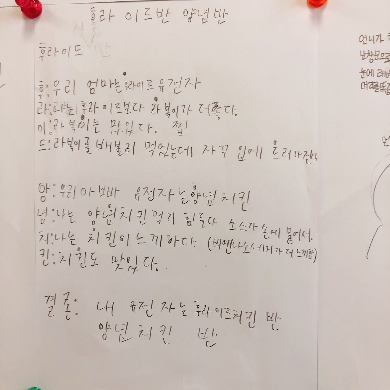 자기가 여자 버전인 게 누나란다. 너무 닮아 마스크를 쓰면 거의 쌍둥이란다. 한 아이는 한사코 자기는 아니라고 누구를 닮지 않았다고 고집한다. 나는 나를 닮았단다. 나는 나다. 틈만 나면 나대며 맨날 약을 올리는 동생 때문에 힘들다는 아이까지 모두 가족 이야기가 나오니 들떴다. 한참 신나게 가족 이야기를 늘어놓다 첫 교시 수업을 시작했다.