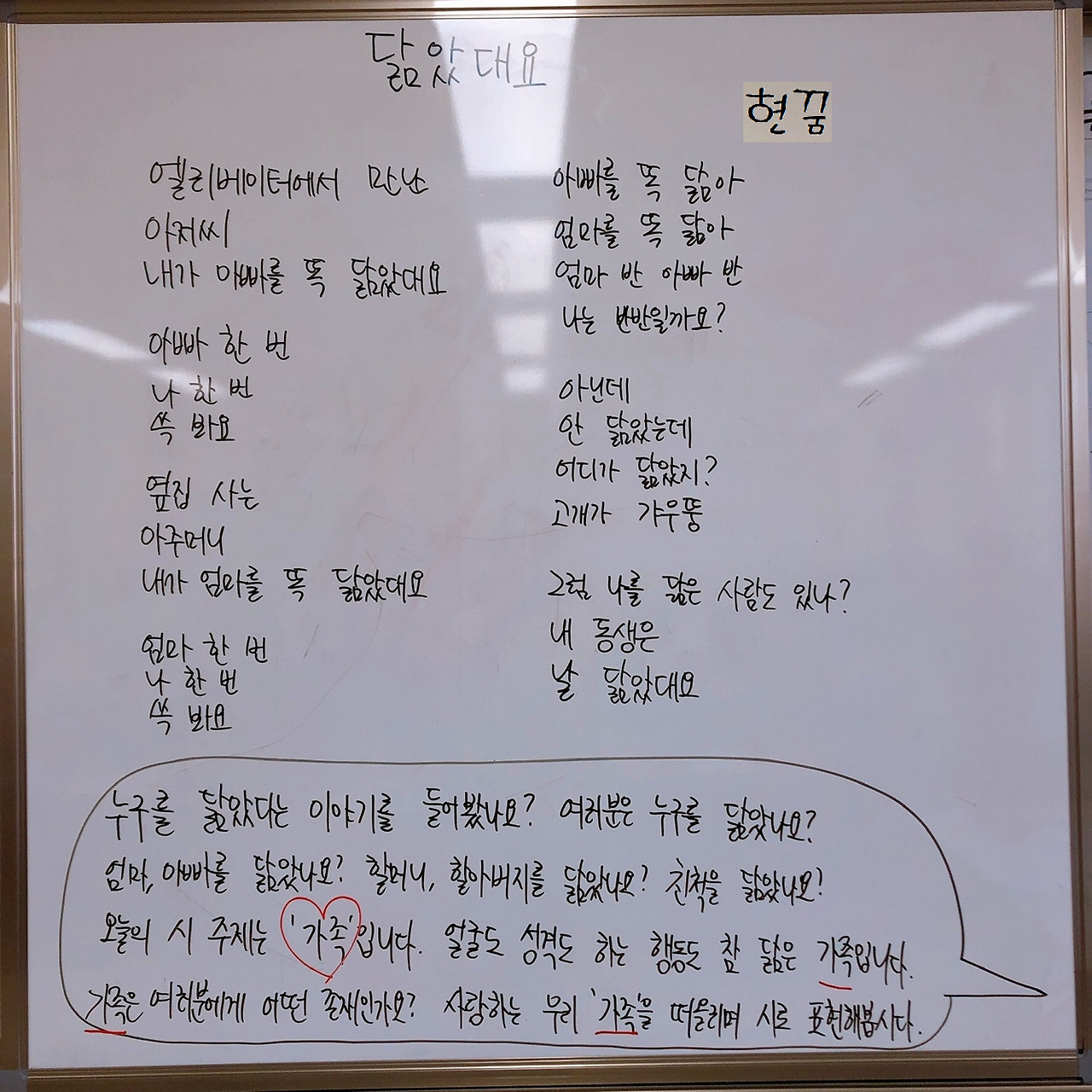 누구를 닮았다는 말 들어봤나요? 여러분은 누구를 닮았나요? 엄마, 아빠를 닮았나요? 할머니, 할아버지를 닮았나요? 친척을 닮았나요? 오늘의 시 주제는 ‘가족’입니다. 얼굴도 성격도 하는 행동도 참 닮은 가족입니다. 가족은 여러분에게 어떤 존재인가요? 사랑하는 우리 ‘가족’을 떠올리며 시로 표현해봅시다.
