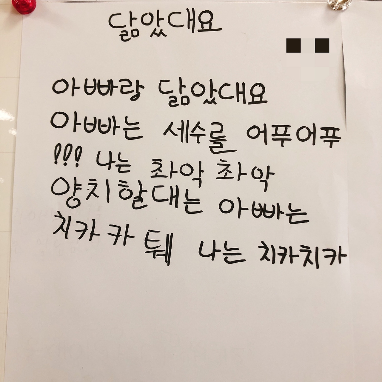 잘 때 모습이 똑같아서 놀란 적이 있다고 했다. 동생과 자는 모습이 똑같아서 엄마가 그렇게 예쁘다고 했단다. 상상된다. 옆 반에 쌍둥이 동생이 있다. 똑같이 생긴 아이 둘이 자는 모습까지 똑같으니 얼마나 예쁠까? 모습도 하는 행동도 똑 닮은 가족이다.