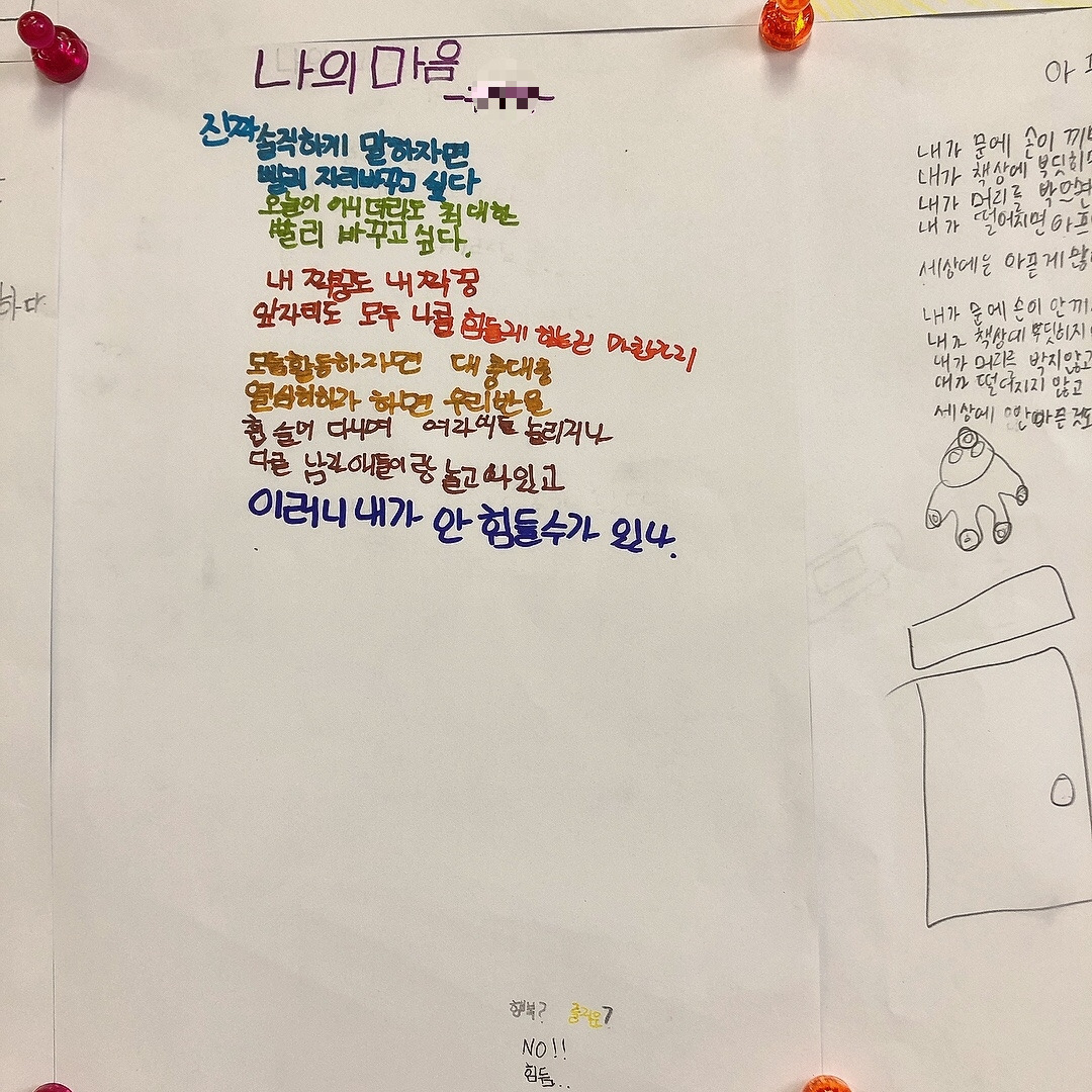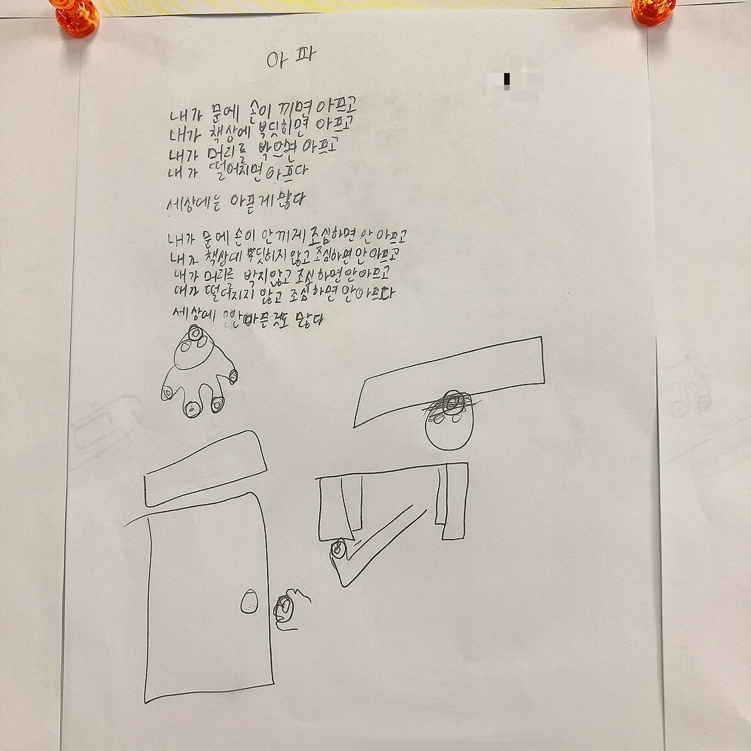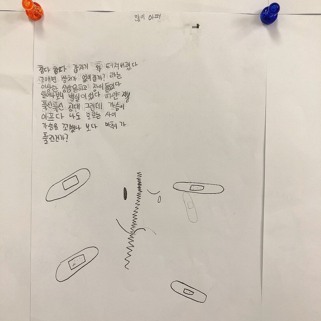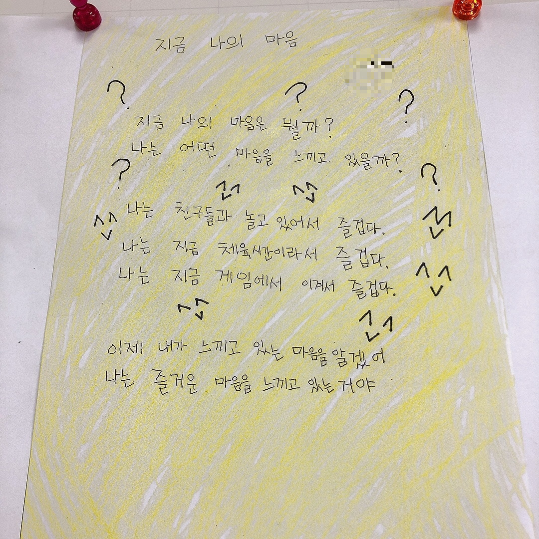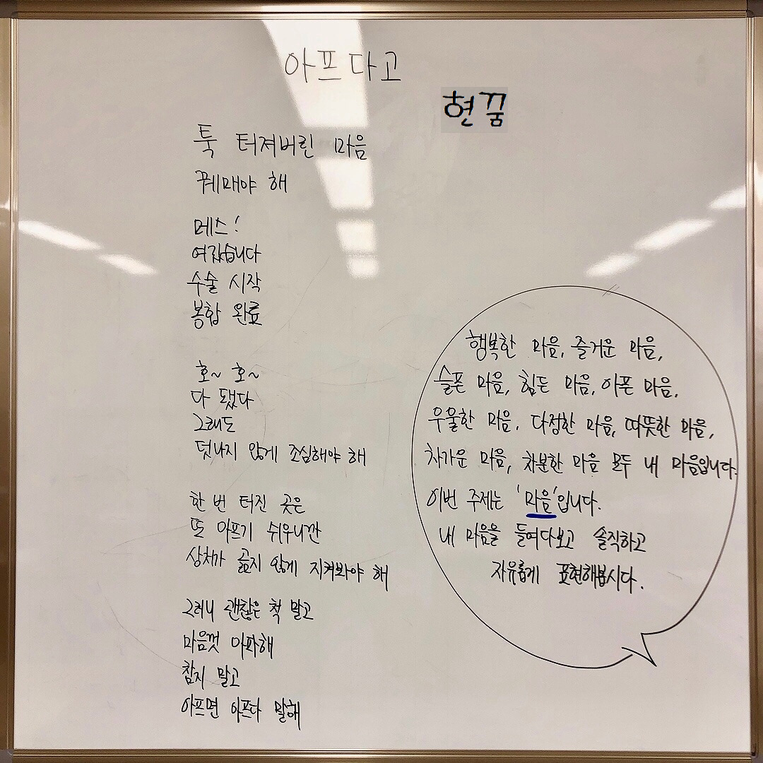 행복한 마음을 표현한 시도 많았지만 힘들었거나 아팠던 마음을 표현한 아이도 많았다. ‘참다 참다 갑자기 확 터져버렸다. 꿰매면 상처가 없어질까?라는 이상한 상상을 하고 잠이 들었다. 일어나 보니 병실이었다. 하얀 지붕 푹신푹신한 침대 그런데 가슴이 아프다. 나도 모르는 사이 가슴을 꿰맸나 보다. 마취가 풀린 건가?’, ‘툭 터져버린 마음 꿰매야 해. 나의 마음이 버텨야 해. 꿰매고 꿰매 봐도 풀어진다. 슬픈 마음이 넘치나 봐.’