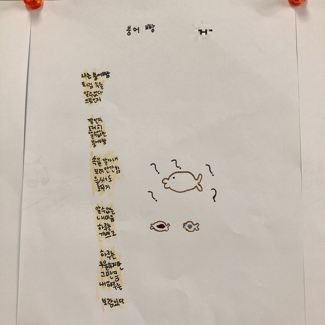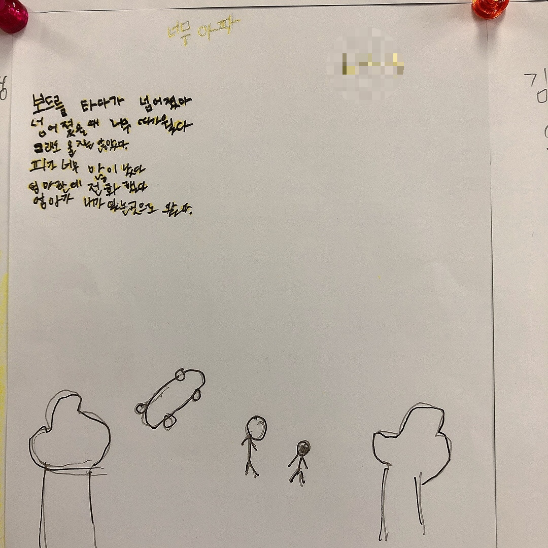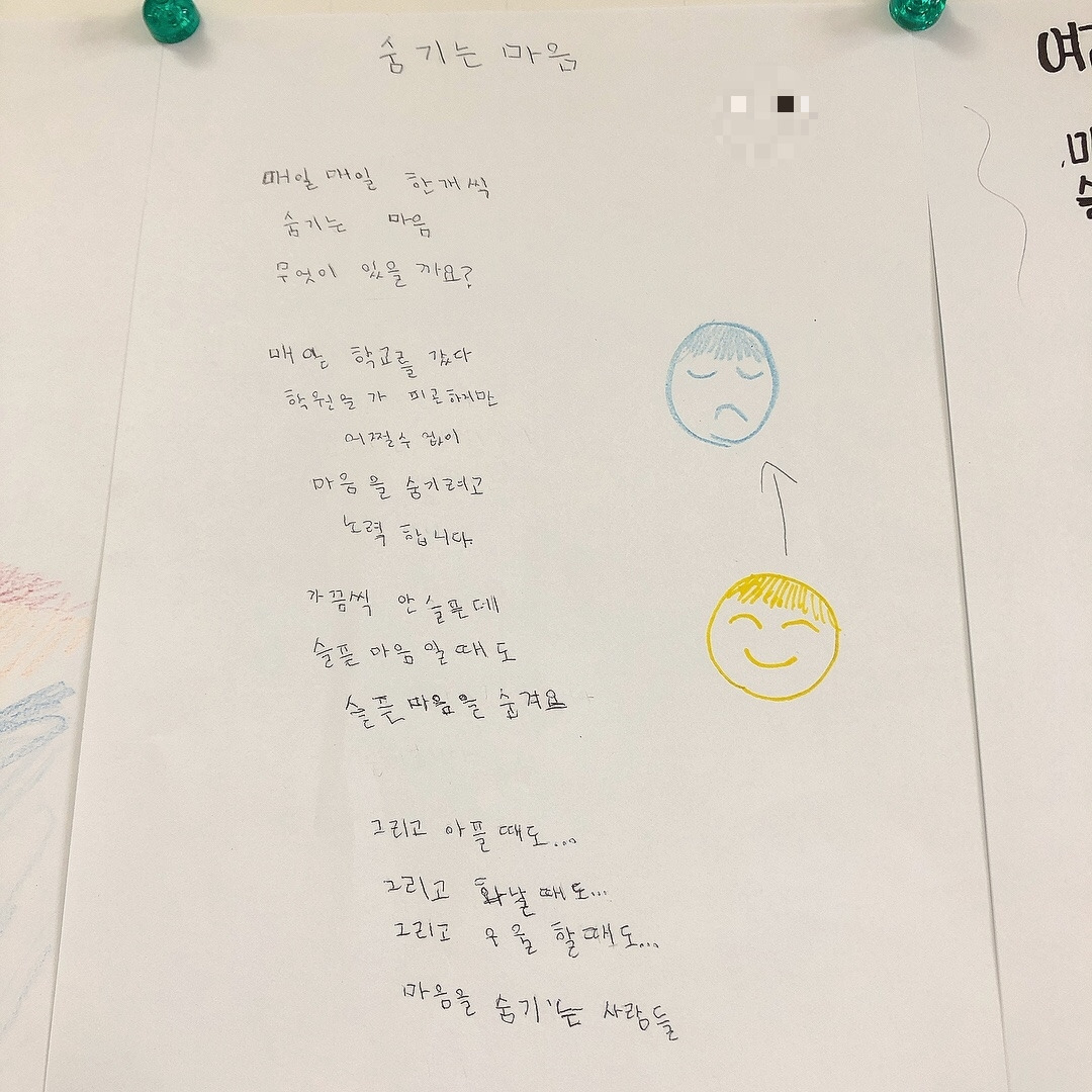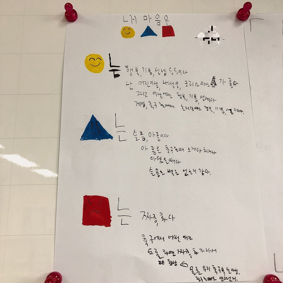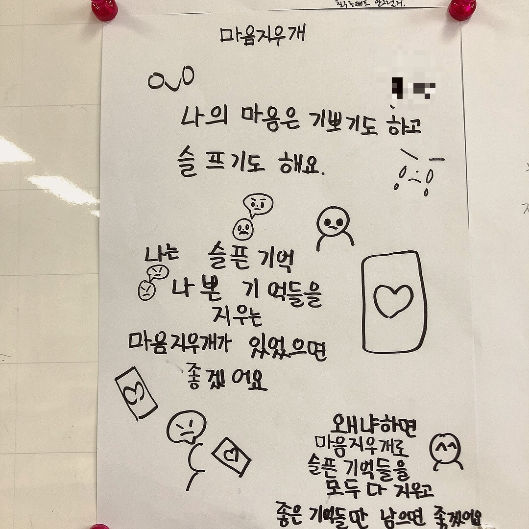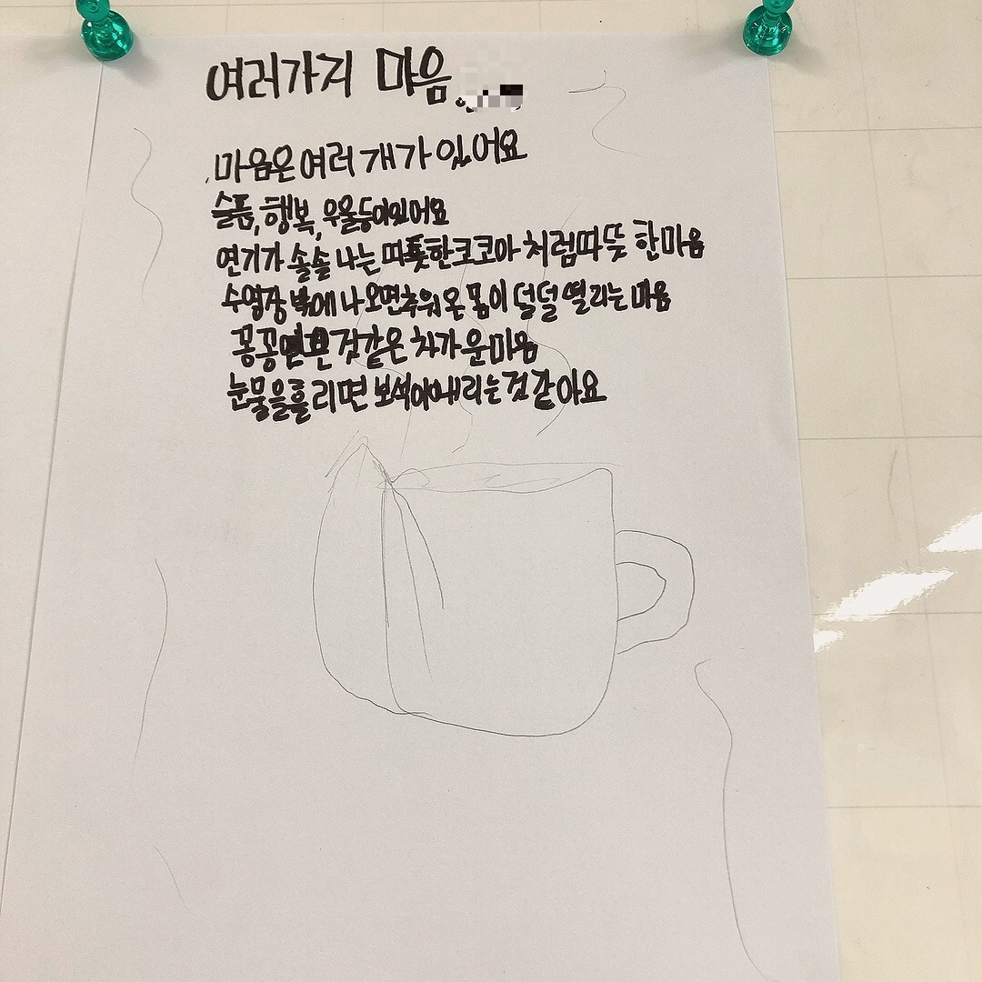 행복한 마음을 표현한 시도 많았지만 힘들었거나 아팠던 마음을 표현한 아이도 많았다. ‘참다 참다 갑자기 확 터져버렸다. 꿰매면 상처가 없어질까?라는 이상한 상상을 하고 잠이 들었다. 일어나 보니 병실이었다. 하얀 지붕 푹신푹신한 침대 그런데 가슴이 아프다. 나도 모르는 사이 가슴을 꿰맸나 보다. 마취가 풀린 건가?’, ‘툭 터져버린 마음 꿰매야 해. 나의 마음이 버텨야 해. 꿰매고 꿰매 봐도 풀어진다. 슬픈 마음이 넘치나 봐.’