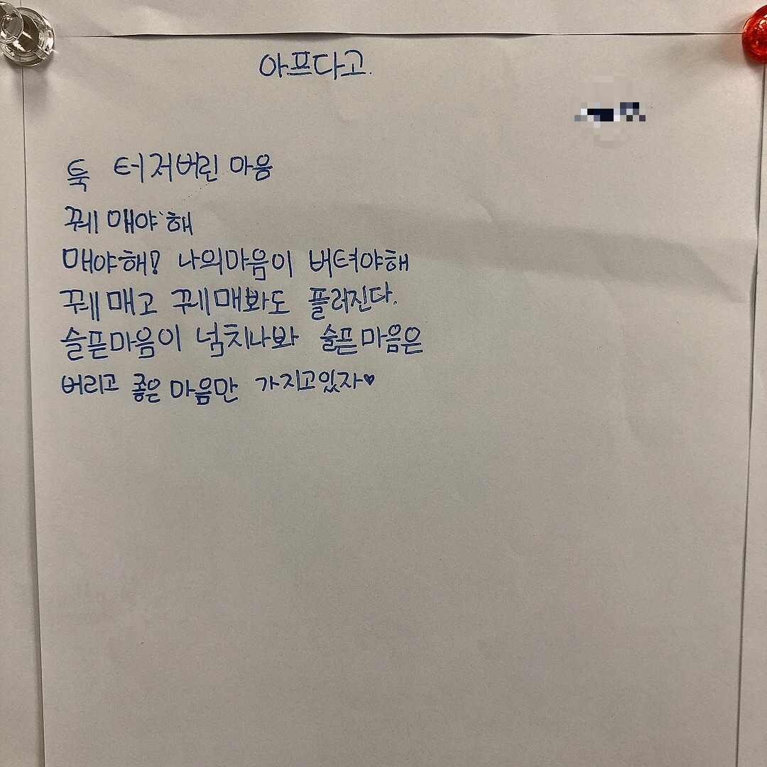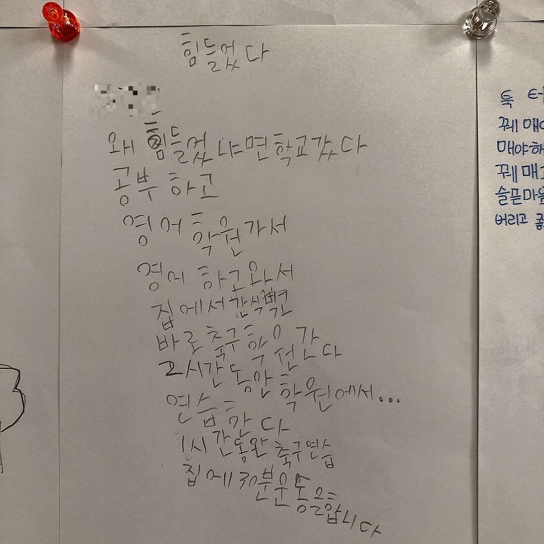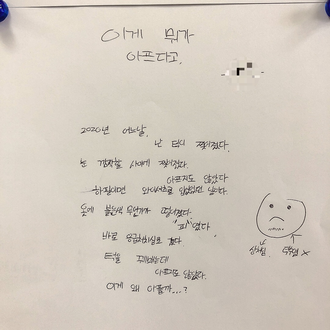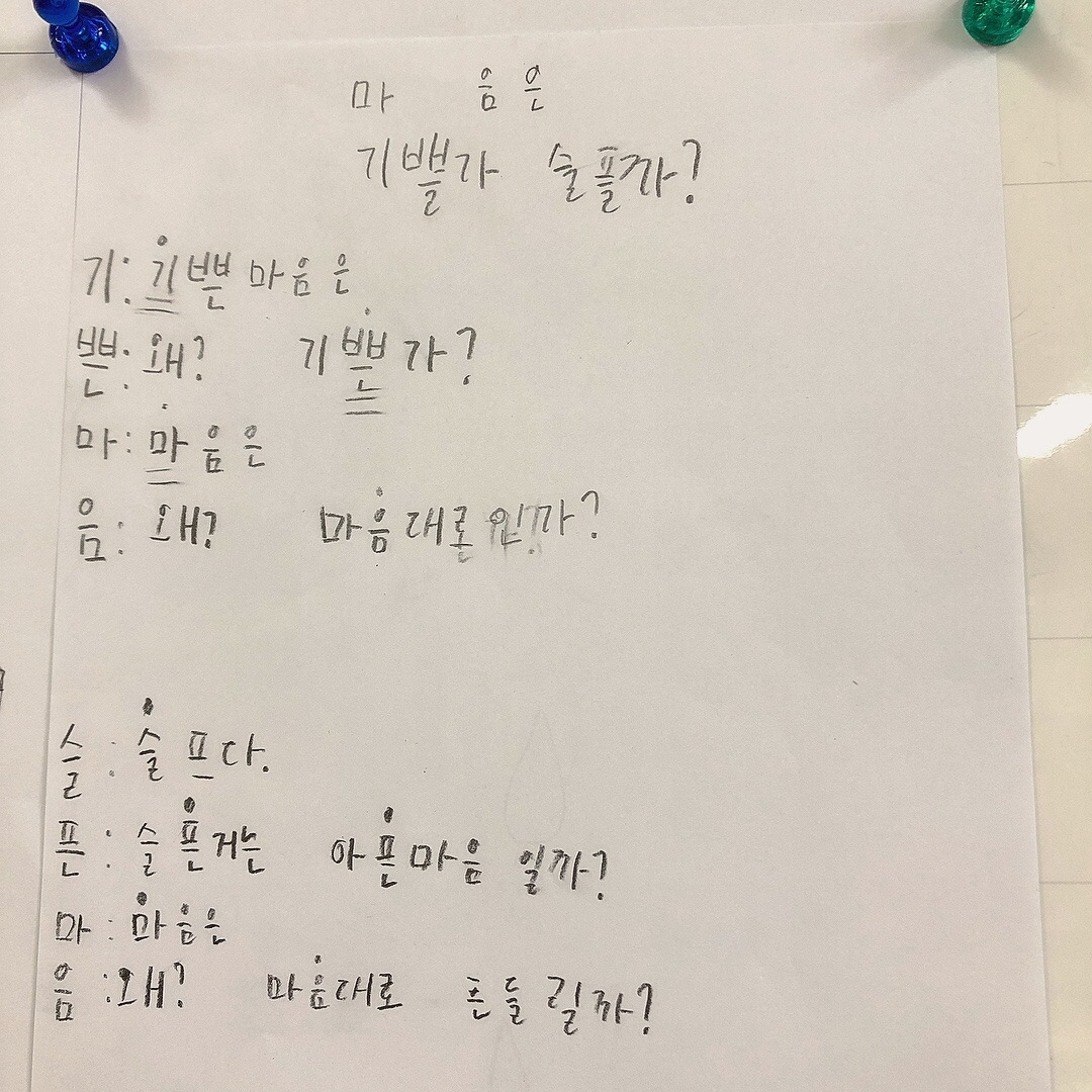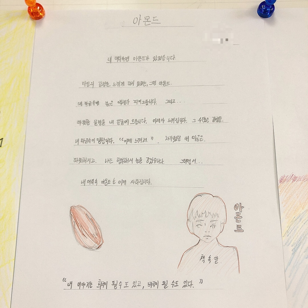 행복한 마음을 표현한 시도 많았지만 힘들었거나 아팠던 마음을 표현한 아이도 많았다. ‘참다 참다 갑자기 확 터져버렸다. 꿰매면 상처가 없어질까?라는 이상한 상상을 하고 잠이 들었다. 일어나 보니 병실이었다. 하얀 지붕 푹신푹신한 침대 그런데 가슴이 아프다. 나도 모르는 사이 가슴을 꿰맸나 보다. 마취가 풀린 건가?’, ‘툭 터져버린 마음 꿰매야 해. 나의 마음이 버텨야 해. 꿰매고 꿰매 봐도 풀어진다. 슬픈 마음이 넘치나 봐.’