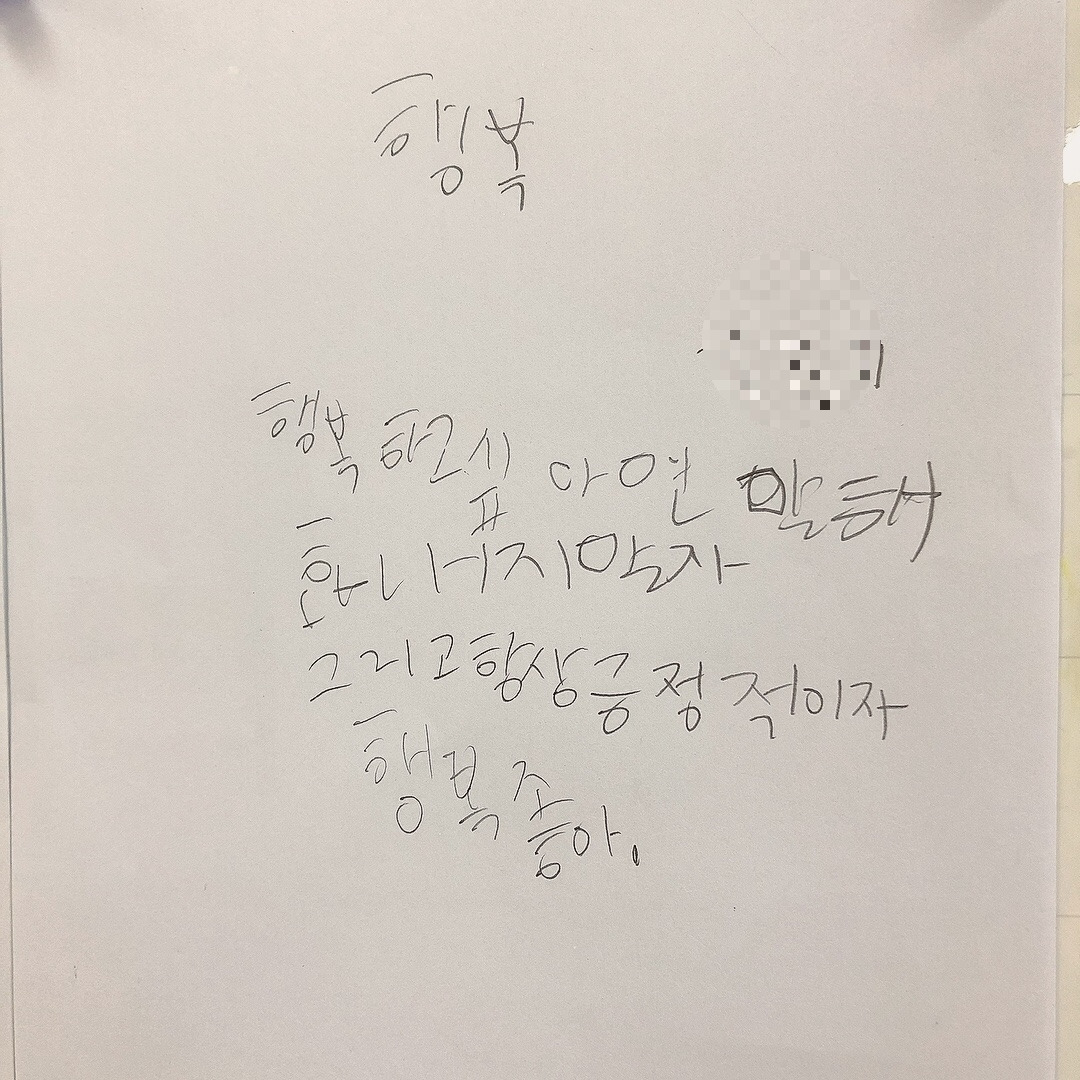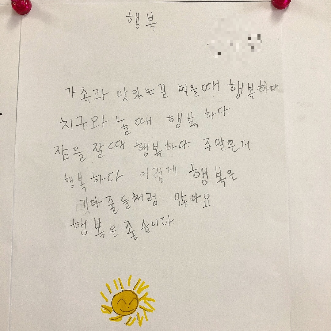 다른 아이들은 어떨 때 행복할까? 즐거울까? 내일 생존 수영 수업하러 가는 것이 너무 좋고 떨린단다. 벌써부터 내일을 기대하며 신나게 학교에 오는 아이다. 내일 아침도 큰 목소리로 밝게 인사하며 등장하겠구나. 가족과 맛있는 걸 먹을 때, 친구와 놀 때, 잠을 잘 때, 주말에 행복을 느끼는 아이도 있었다. ‘이렇게 행복은 기타 줄들처럼 많아요. 행복은 좋습니다.’ 어떻게 기타 줄이란 생각을 했을까? “00아 혹시 기타 칠 줄 알아?” 아니란다. “근데 기타 줄이 생각 난 거야?” 이유는 없고 생각이 났단다. 신나게 기타 치는 베짱이를 생각했을까? 기타 치는 모습이 행복해 보여서? 행복과 기타가 닮았을까? 아이들의 생각은 어디로 튈지 모르는 예측 불가의 매력이 있다. 통통 튀는 아이들의 생각은 아이들을 닮았다. 오늘은 또 어떤 재미난 생각을 했을까? 아이들의 생각을 기대하며 오늘도 시 쓰는 시간이 행복하다. 행복이 기타 줄처럼 많다는 아이가 또 나를 빙긋 웃음 짓게 한다.