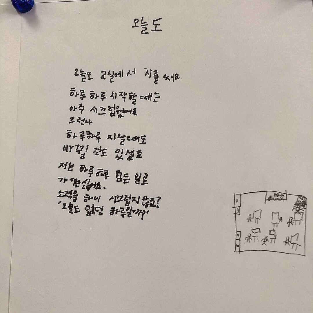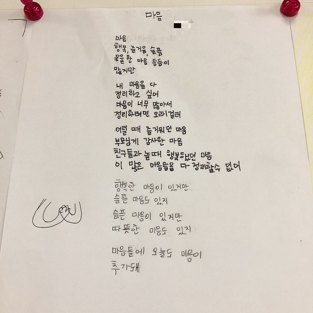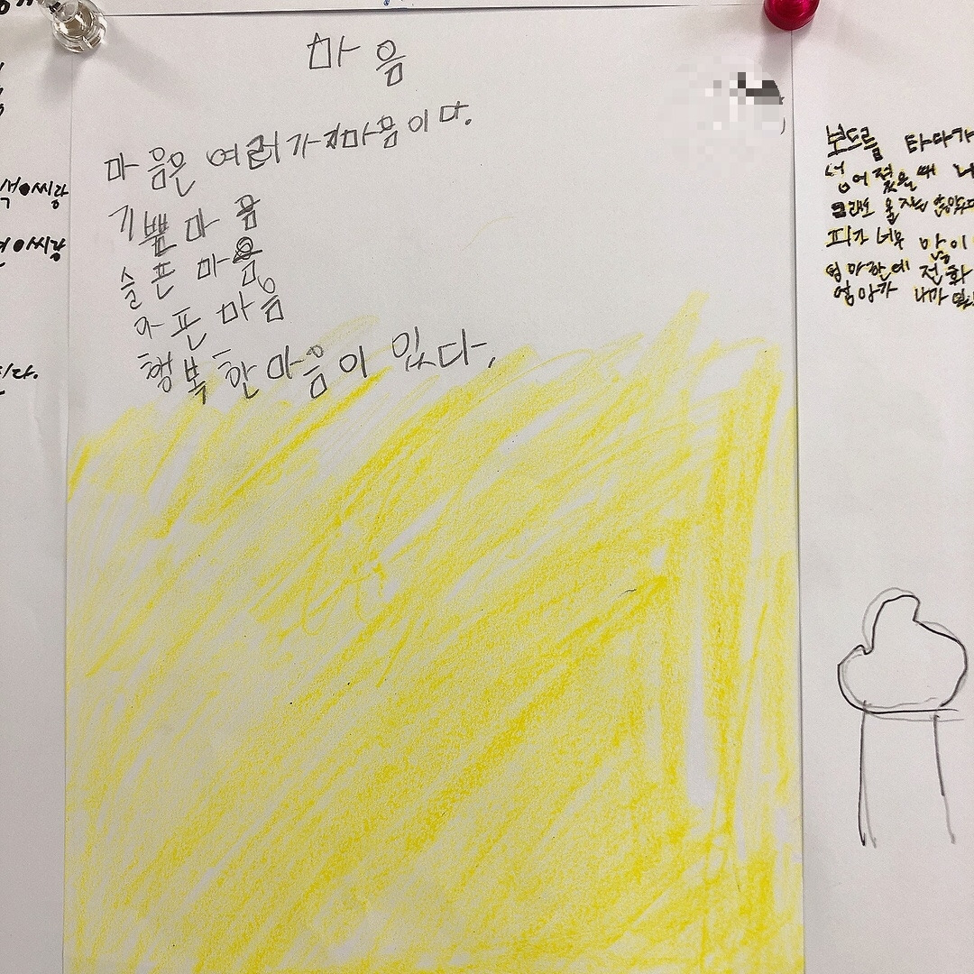 그래서 이번 시 주제인 ‘마음’에 대해 써보며 아이들은 무엇을 느꼈을까? ‘이제 내가 느끼고 있는 마음을 알겠어. 나는 즐거운 마음을 느끼고 있는 거야’라고 썼다. 자신의 마음을 알겠다니 이 시를 쓰며 아이에게 나타난 변화에 행복했다. 즐거운 게 가득한 지금 마음을 계속 이어 나갈 수 있으면 좋겠다. 시를 읽고 쓰면 나도 모르게 감성적으로 변한다. 어느덧 감수성이 풍부한 사람이 된다. 영혼의 살이 찐다. 시를 읽고 쓰며 우리 반 교실이 서로의 마음들로 채워지고 있다. 시로써 아이들의 영혼이 따뜻하게 채워지면 나는 더 바랄 게 없다.