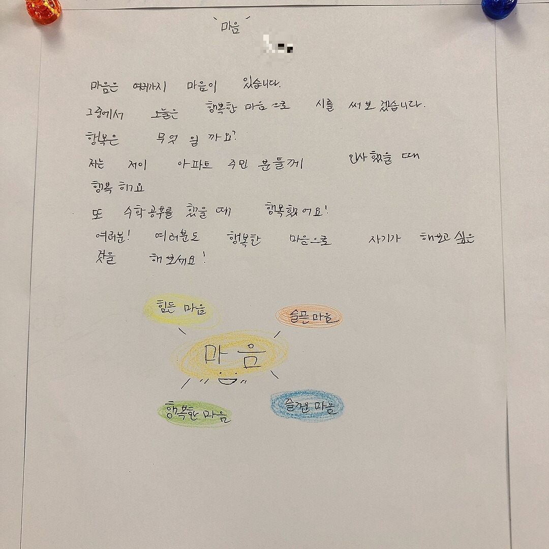 행복한 마음, 즐거운 마음, 슬픈 마음, 힘든 마음, 아픈 마음, 우울한 마음, 다정한 마음, 따뜻한 마음, 차가운 마음, 차분한 마음 모두 내 마음입니다. 이번 주제는 ‘마음’입니다. 내 마음을 들여다보고 솔직하고 자유롭게 표현해봅시다.