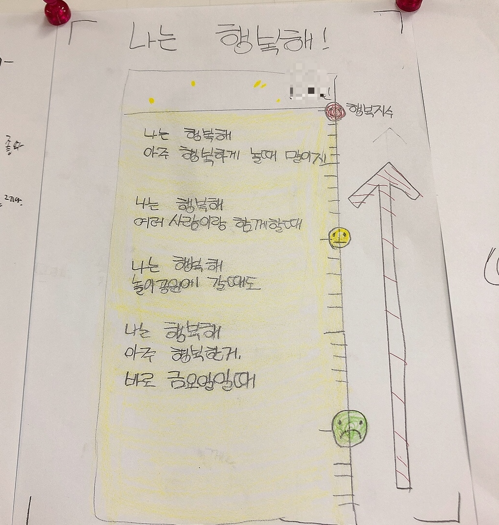 어떨 때 행복한가요? 얼마나 행복한가요? 행복감을 행복지수로 표현했다. 아주 행복하게 놀 때, 여러 사람과 함께할 때, 놀이공원에 갈 때 행복하단다. 아주 행복할 때는 바로 금요일일 때라며 ‘나는 행복해!’라는 시 제목처럼 행복한 일이 가득한 아이의 시였다. 하늘 높이 치솟는 행복지수의 화살표처럼 아이의 행복이 항상 저 높은 지붕을 뚫었으면 좋겠다.