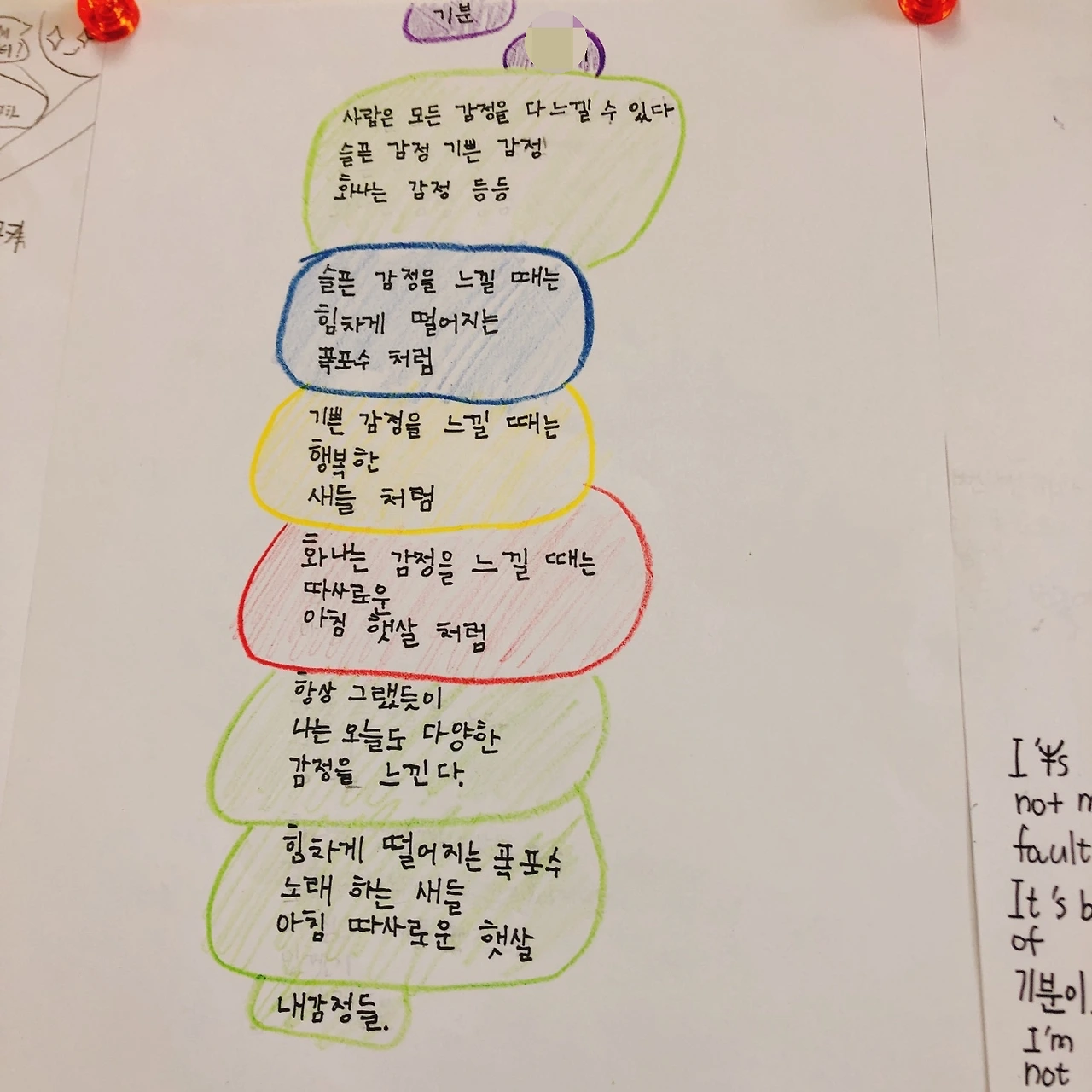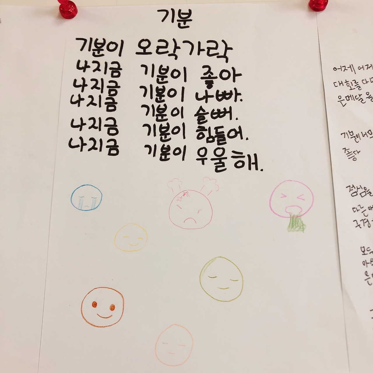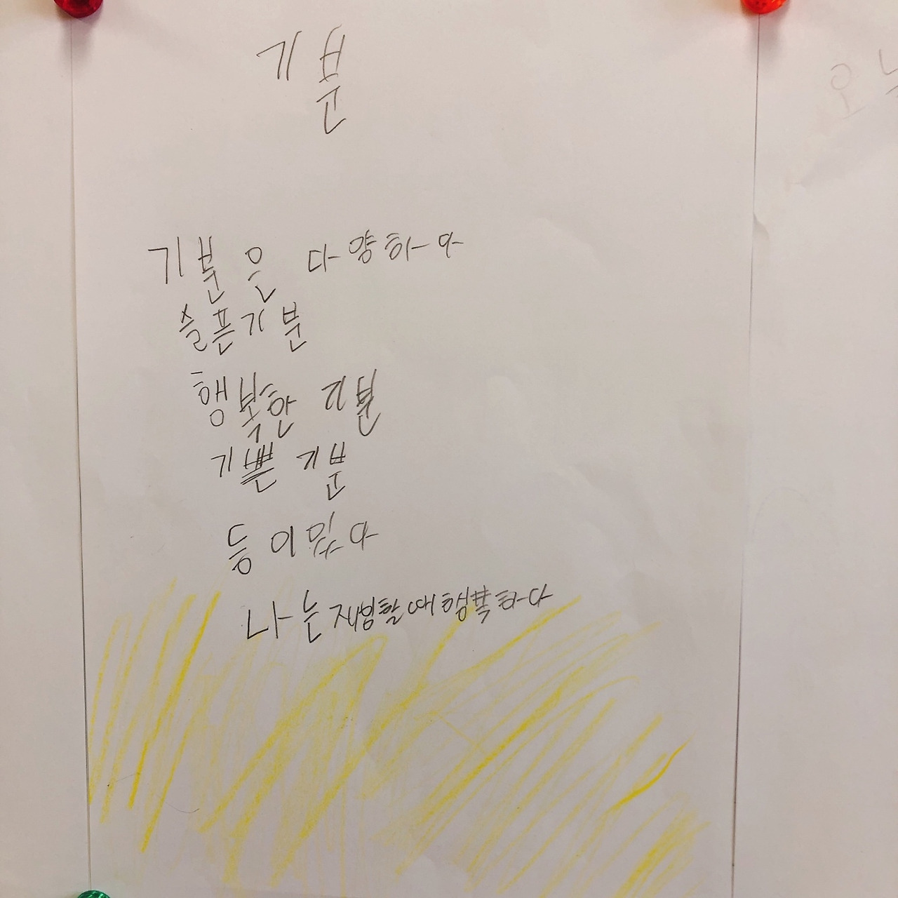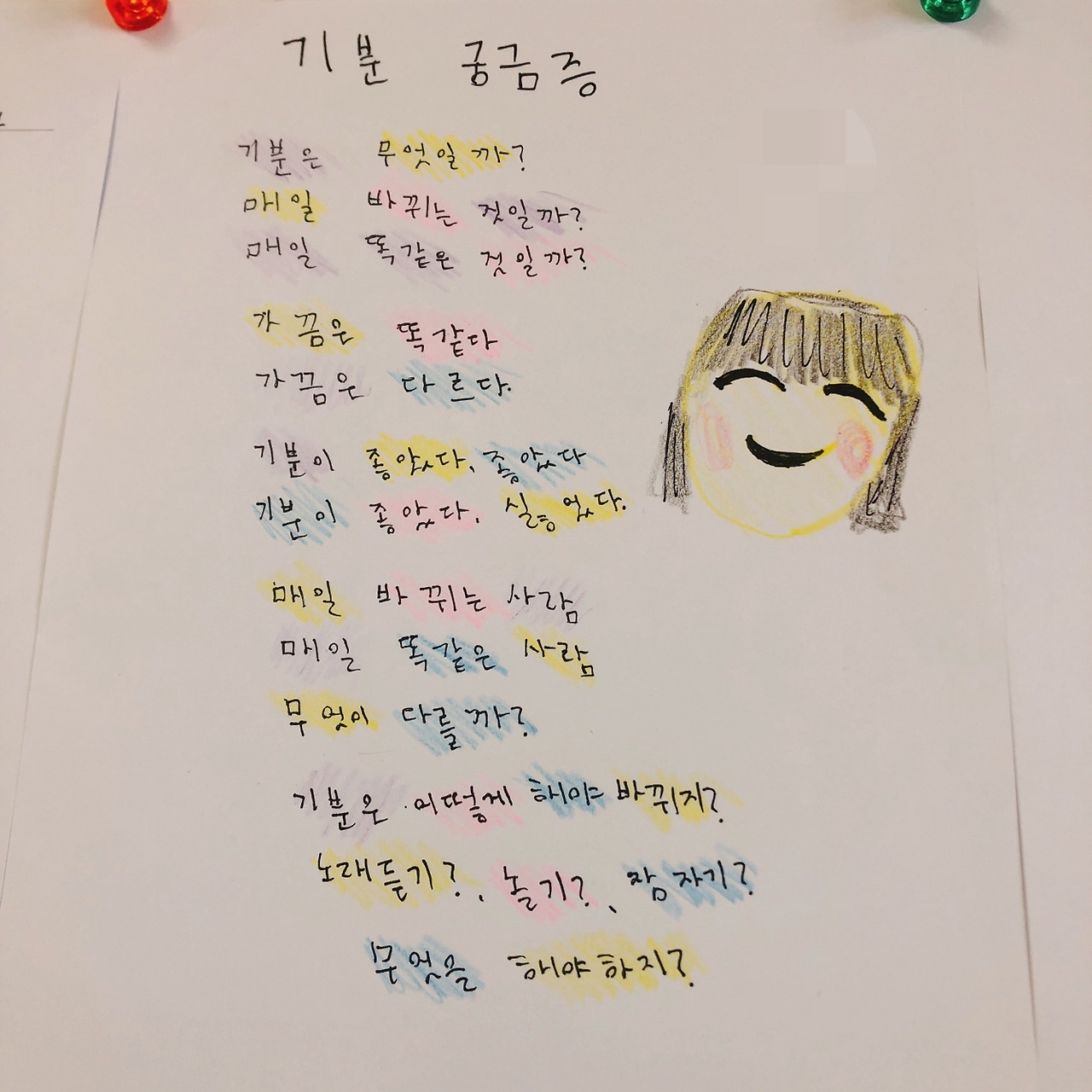 모두의 이런저런 기분이 담겼다. 기분에 대한 시를 쓰며 왜 이런 감정을 느끼는지 나를 살펴볼 수 있었다. 인생은 희로애락으로 이뤄진다고 하는데, 기쁨, 노여움, 슬픔, 즐거움 모두 필요하다. 화가 나면 아이들은 화를 주체하지 못하고 거세게 표출하는 경우가 많다. ‘화남’은 자기가 원하는 것이 충족되지 않을 때 생기는 강한 감정이라고 한다. 강한 감정을 다루기 위해 스스로 그 감정을 잘 표현하도록 도와야 한다. 시를 쓰며 아이들이 내 마음 한 번 더 들여다보고 내 마음에 솔직해지길 바란다. 내 감정을 알고 표현할 줄 알고 다스릴 줄도 알았으면 한다. 감정에는 다 이유가 있다. 왜 그런 감정이 생겼을까? 상황과 맥락이 있다. 왜 그랬는지 그 상황과 그때 느낀 감정을 물어봐 주는 것을 잊지 않아야겠다.