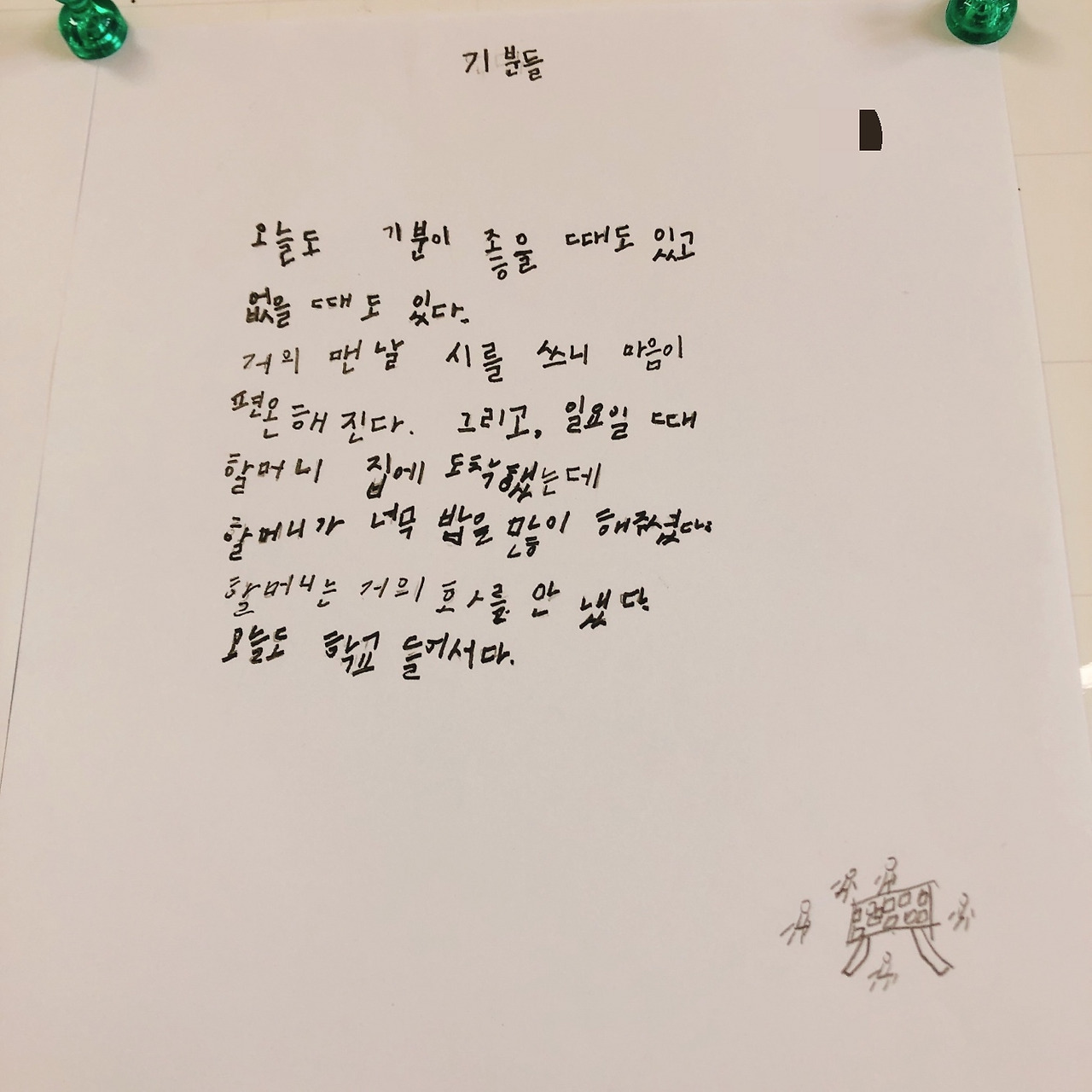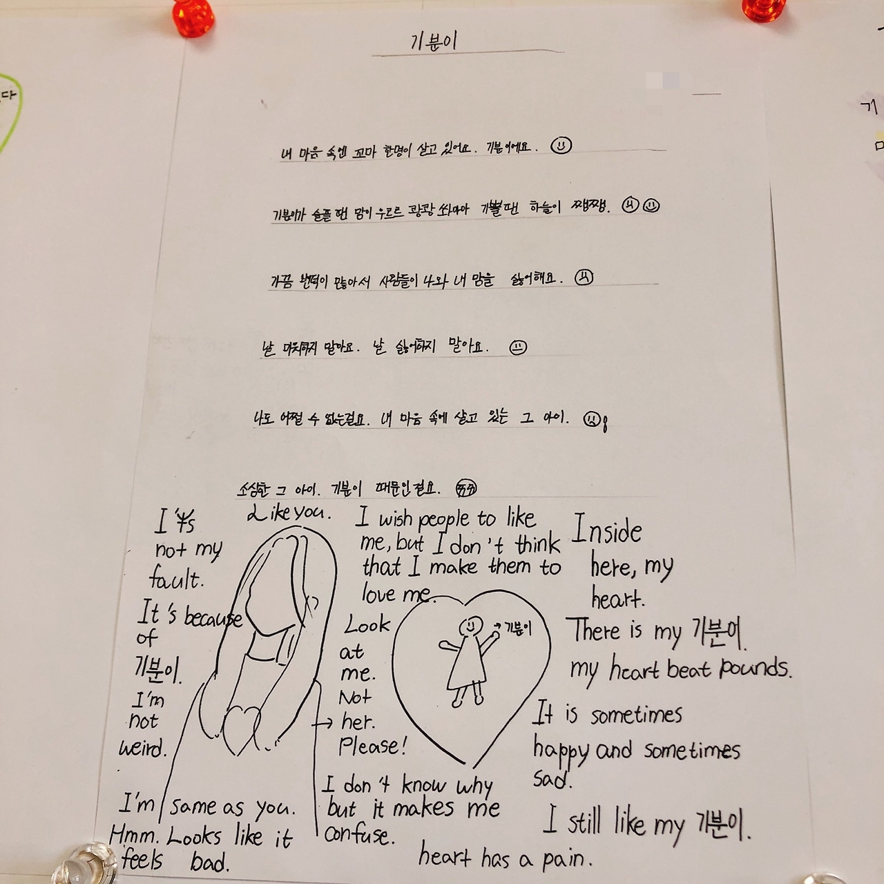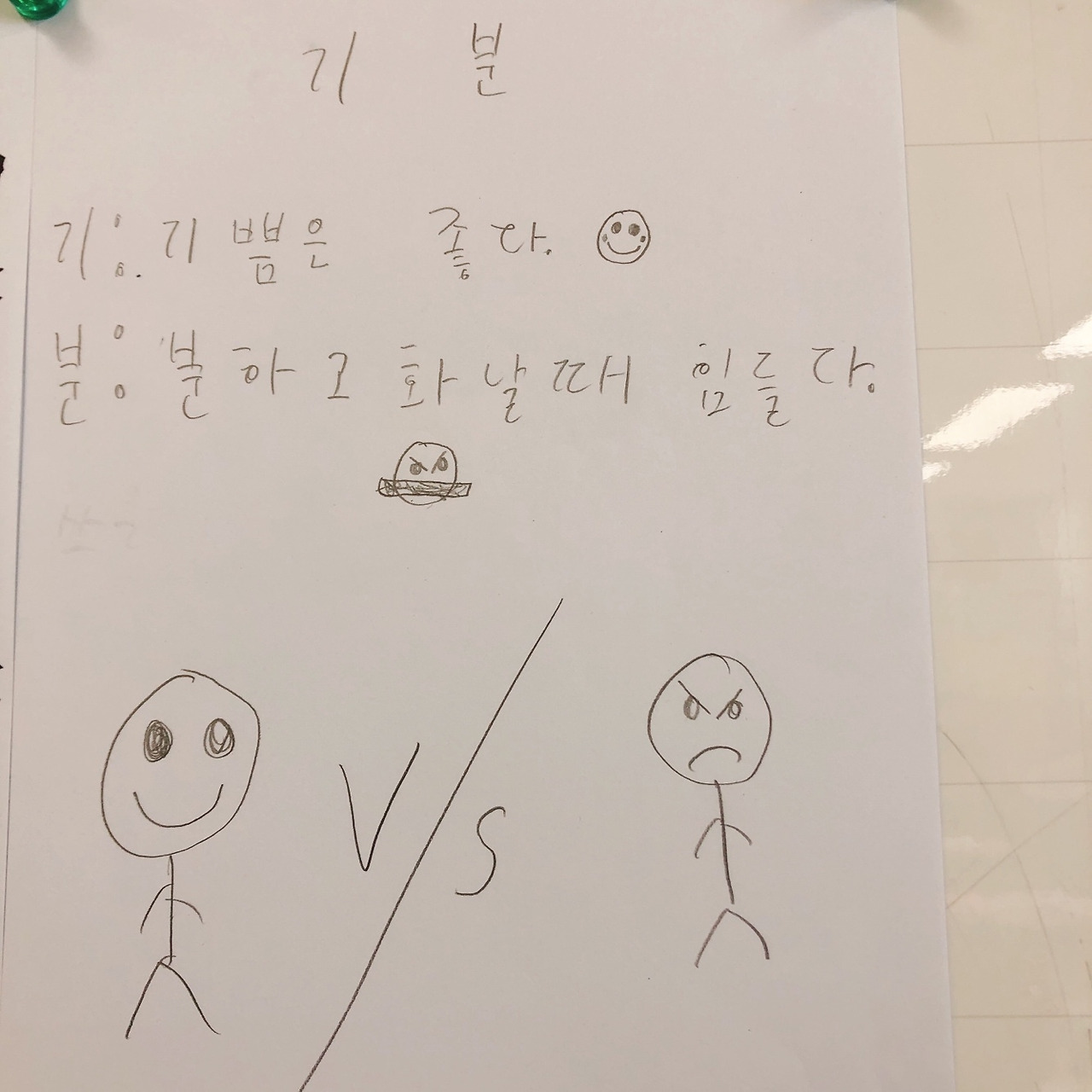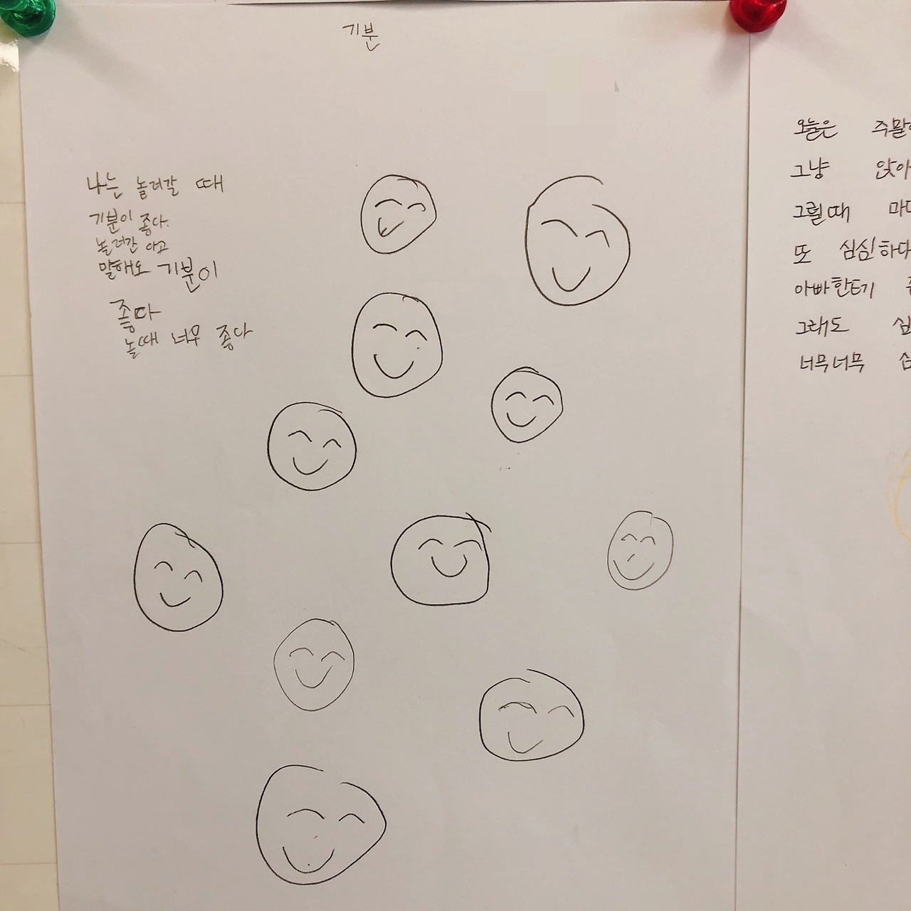 모두의 이런저런 기분이 담겼다. 기분에 대한 시를 쓰며 왜 이런 감정을 느끼는지 나를 살펴볼 수 있었다. 인생은 희로애락으로 이뤄진다고 하는데, 기쁨, 노여움, 슬픔, 즐거움 모두 필요하다. 화가 나면 아이들은 화를 주체하지 못하고 거세게 표출하는 경우가 많다. ‘화남’은 자기가 원하는 것이 충족되지 않을 때 생기는 강한 감정이라고 한다. 강한 감정을 다루기 위해 스스로 그 감정을 잘 표현하도록 도와야 한다. 시를 쓰며 아이들이 내 마음 한 번 더 들여다보고 내 마음에 솔직해지길 바란다. 내 감정을 알고 표현할 줄 알고 다스릴 줄도 알았으면 한다. 감정에는 다 이유가 있다. 왜 그런 감정이 생겼을까? 상황과 맥락이 있다. 왜 그랬는지 그 상황과 그때 느낀 감정을 물어봐 주는 것을 잊지 않아야겠다.