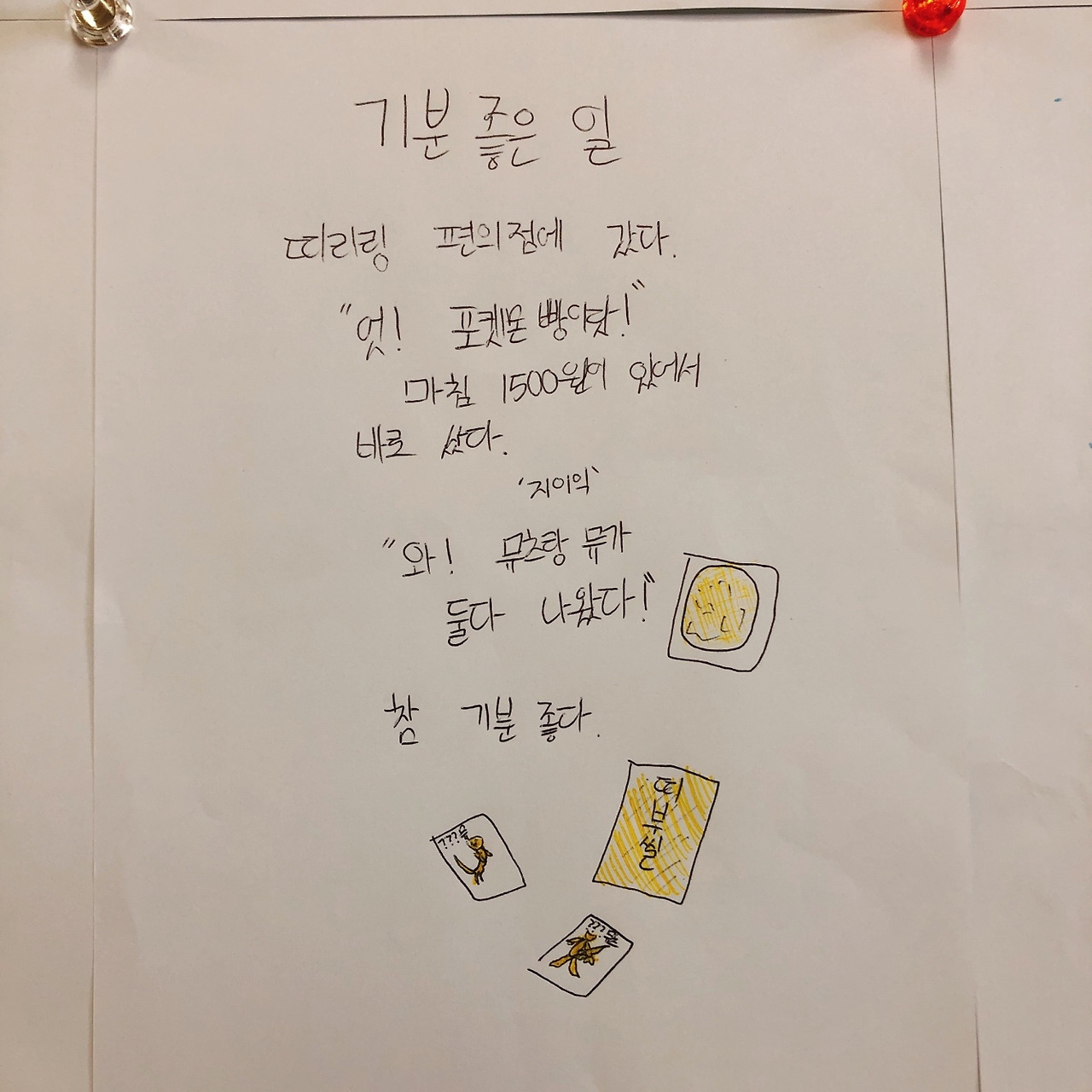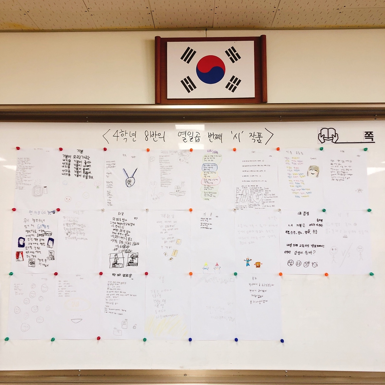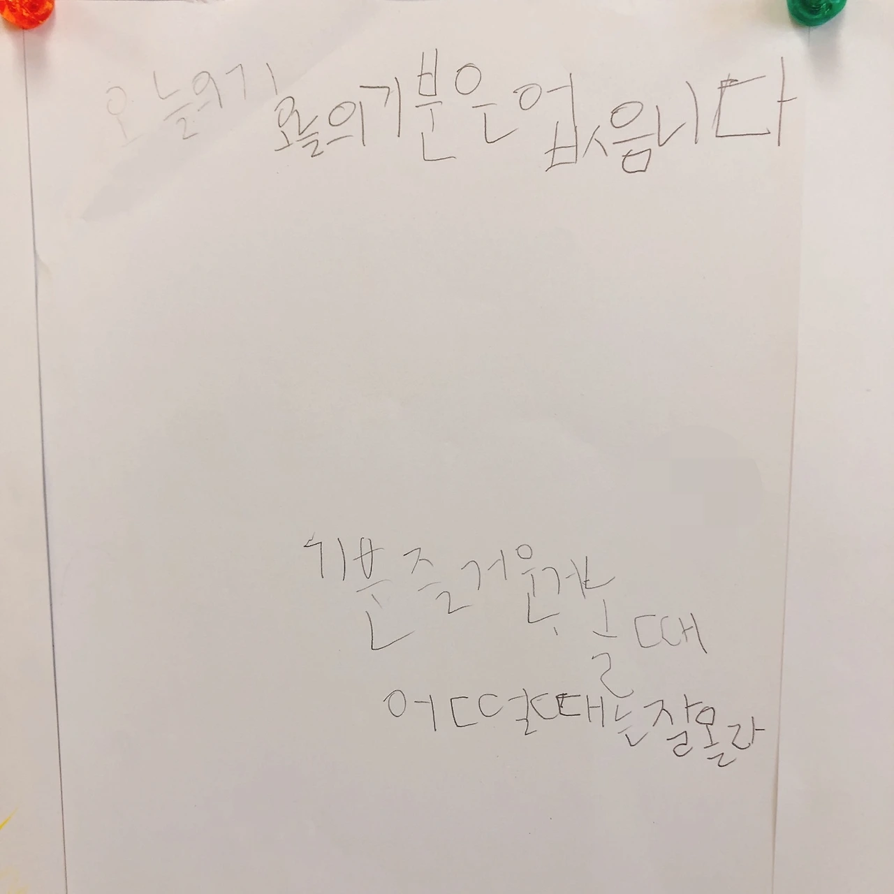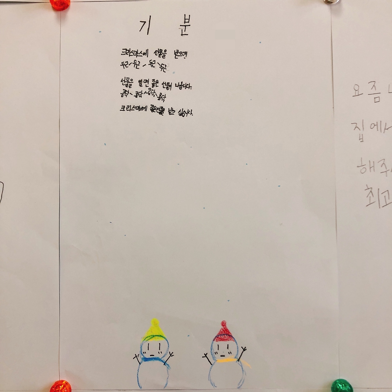 모두의 이런저런 기분이 담겼다. 기분에 대한 시를 쓰며 왜 이런 감정을 느끼는지 나를 살펴볼 수 있었다. 인생은 희로애락으로 이뤄진다고 하는데, 기쁨, 노여움, 슬픔, 즐거움 모두 필요하다. 화가 나면 아이들은 화를 주체하지 못하고 거세게 표출하는 경우가 많다. ‘화남’은 자기가 원하는 것이 충족되지 않을 때 생기는 강한 감정이라고 한다. 강한 감정을 다루기 위해 스스로 그 감정을 잘 표현하도록 도와야 한다. 시를 쓰며 아이들이 내 마음 한 번 더 들여다보고 내 마음에 솔직해지길 바란다. 내 감정을 알고 표현할 줄 알고 다스릴 줄도 알았으면 한다. 감정에는 다 이유가 있다. 왜 그런 감정이 생겼을까? 상황과 맥락이 있다. 왜 그랬는지 그 상황과 그때 느낀 감정을 물어봐 주는 것을 잊지 않아야겠다.