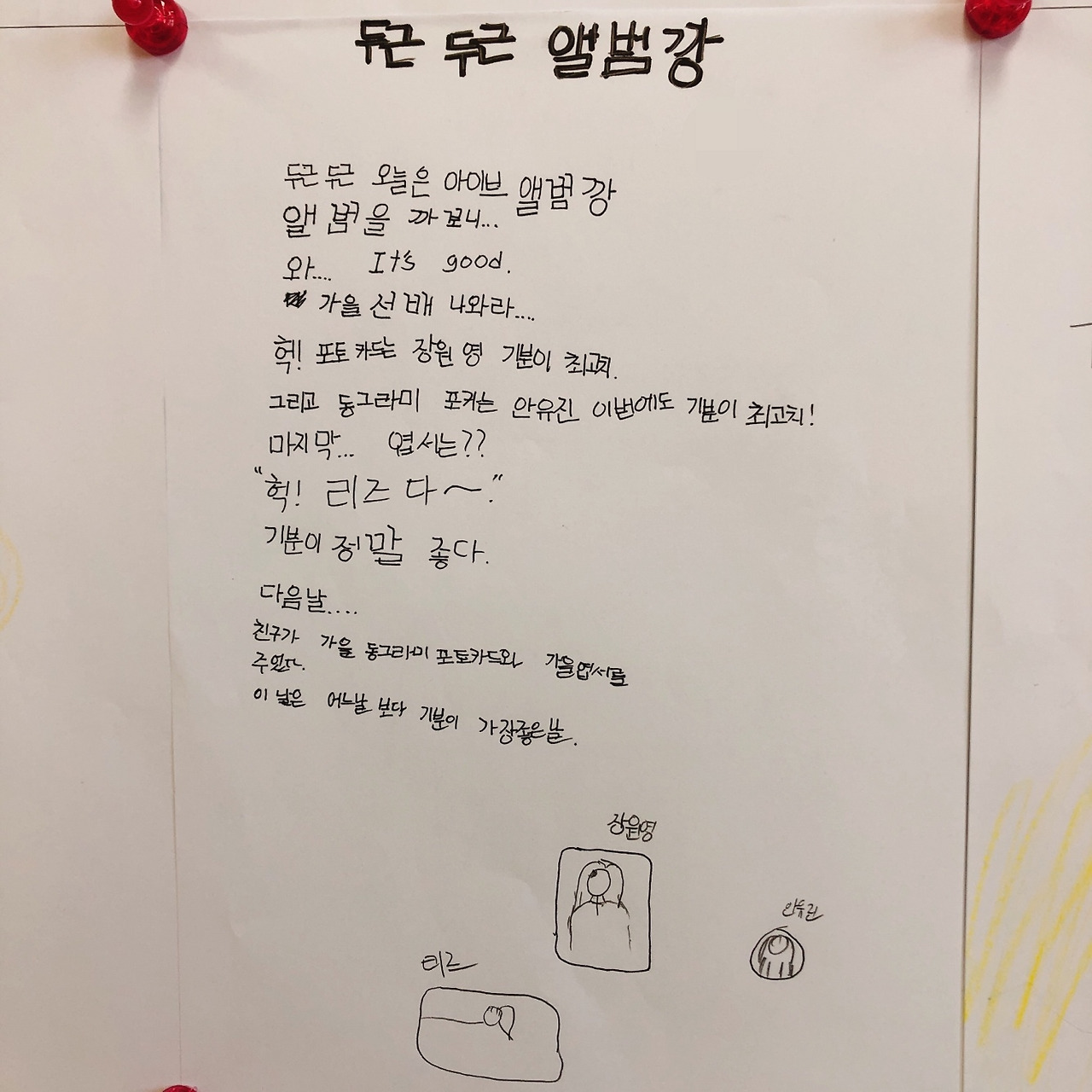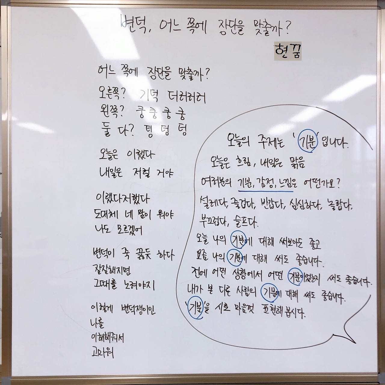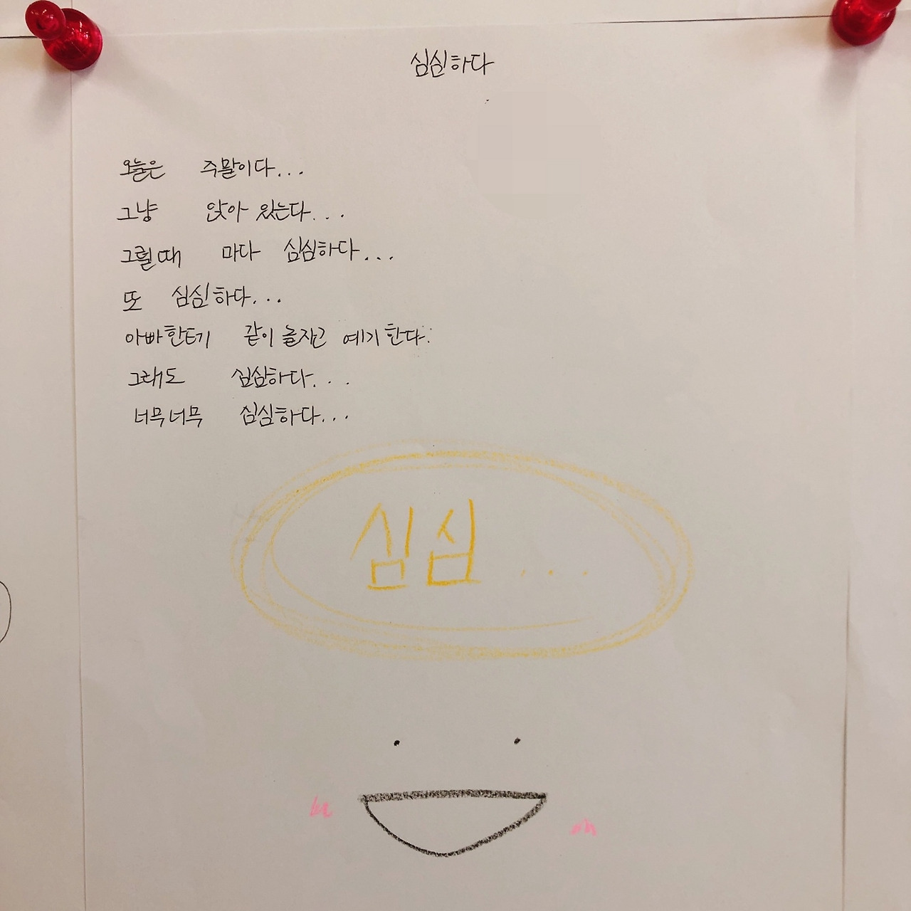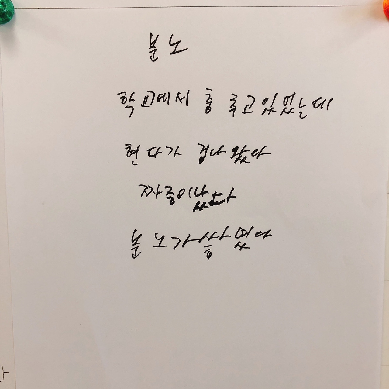 모두의 이런저런 기분이 담겼다. 기분에 대한 시를 쓰며 왜 이런 감정을 느끼는지 나를 살펴볼 수 있었다. 인생은 희로애락으로 이뤄진다고 하는데, 기쁨, 노여움, 슬픔, 즐거움 모두 필요하다. 화가 나면 아이들은 화를 주체하지 못하고 거세게 표출하는 경우가 많다. ‘화남’은 자기가 원하는 것이 충족되지 않을 때 생기는 강한 감정이라고 한다. 강한 감정을 다루기 위해 스스로 그 감정을 잘 표현하도록 도와야 한다. 시를 쓰며 아이들이 내 마음 한 번 더 들여다보고 내 마음에 솔직해지길 바란다. 내 감정을 알고 표현할 줄 알고 다스릴 줄도 알았으면 한다. 감정에는 다 이유가 있다. 왜 그런 감정이 생겼을까? 상황과 맥락이 있다. 왜 그랬는지 그 상황과 그때 느낀 감정을 물어봐 주는 것을 잊지 않아야겠다.
