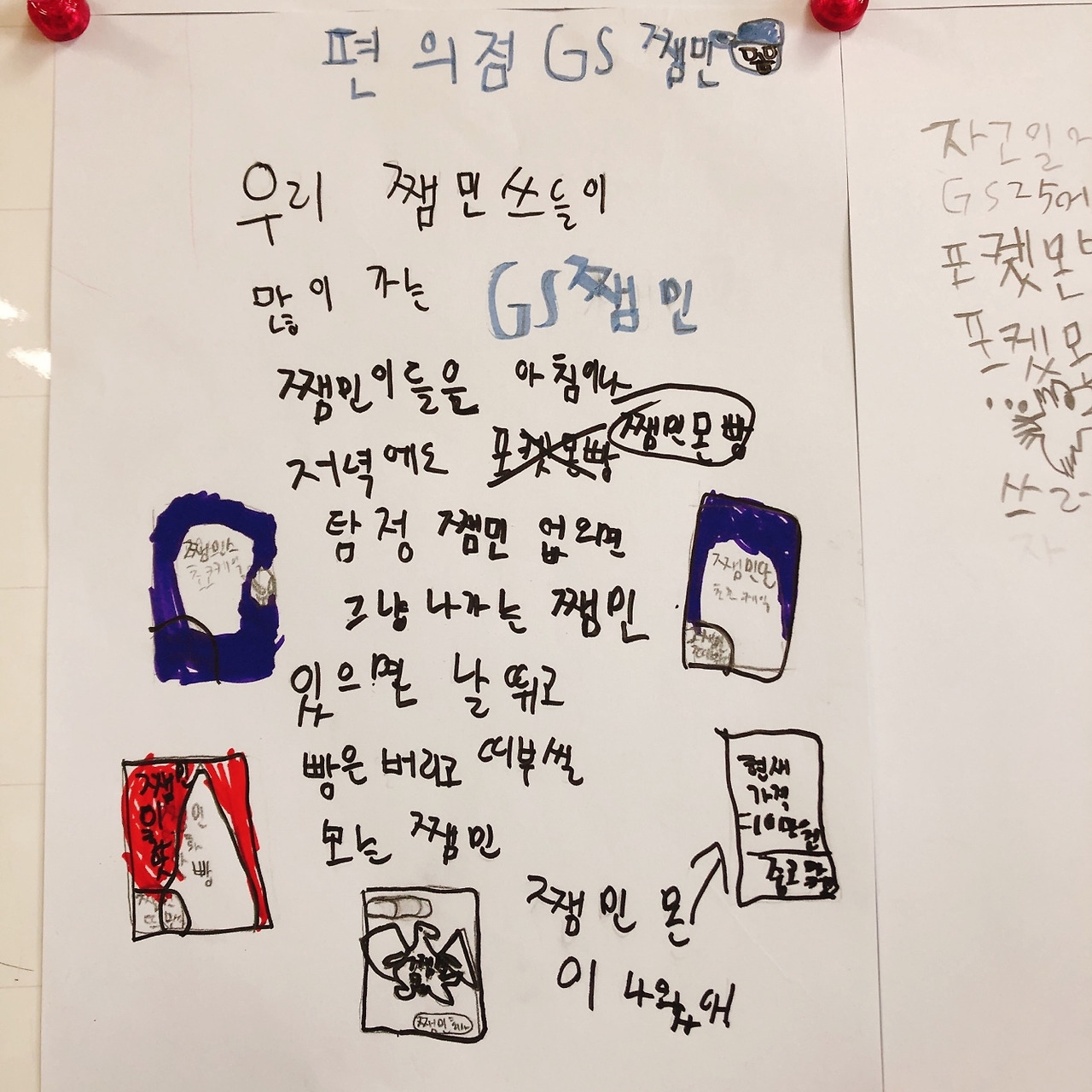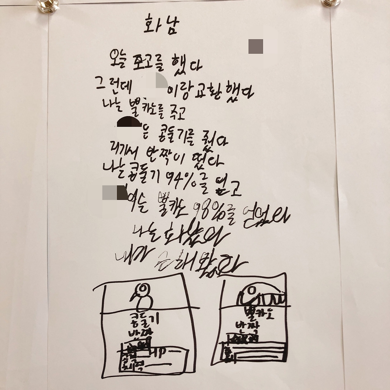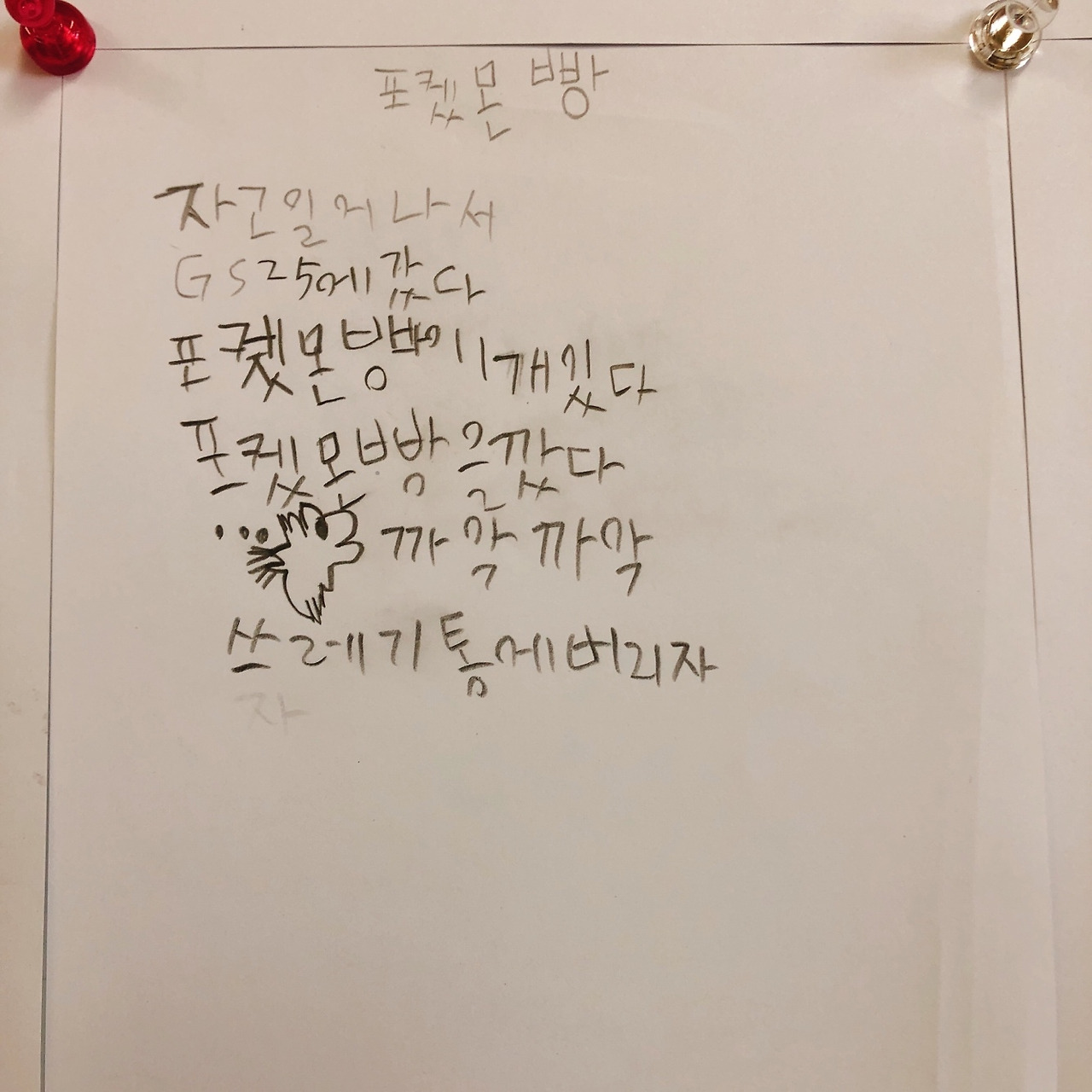 “자고 일어나서 편의점에 갔다. 포켓몬 빵이 1개 있다. 포켓몬 빵을 깠다. 까악 까악. 쓰레기통에 버리자.”