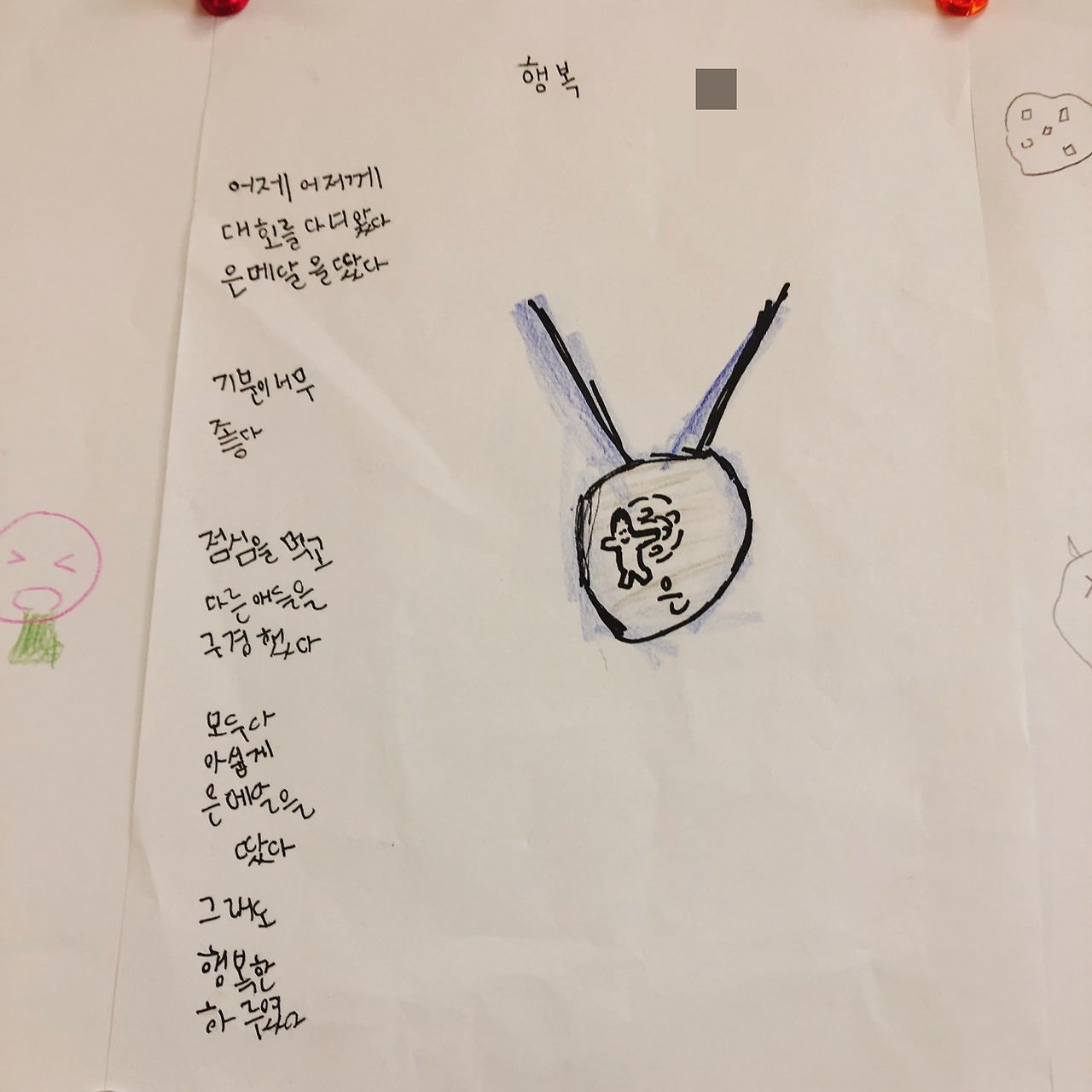 이번 주말에 태권도 대회를 다녀온 이야기를 쓴 아이도 있었다. 은메달이라는 기분 좋은 결과까지 기분이 너무 좋다고 했다. 은메달이 조금은 아쉽다고 했지만 그래도 행복한 하루였다니 좋다. 월요일 아침 등교하자마자 내 옆을 쫄쫄 따라다니며 주말에 대회 다녀온 이야기를 신나게 한 아이다. 내일 꼭 메달을 가져온다고 했는데 잊지 않고 집에 있는 메달을 전부 다 챙겨 왔다. 지금껏 받은 메달을 기쁘게 자랑하며 행복한 미소를 지었다. 다른 아이들도 구경하고 목에도 걸어보며 즐거워 보였다. 열심히 연습한 만큼 과정도 결과도 아름다웠다. 태권도가 그렇게 좋나 보다. 내가 좋아하는 걸 열심히 연습하고 또 잘 해내고 보람찬 하루였을 거다.