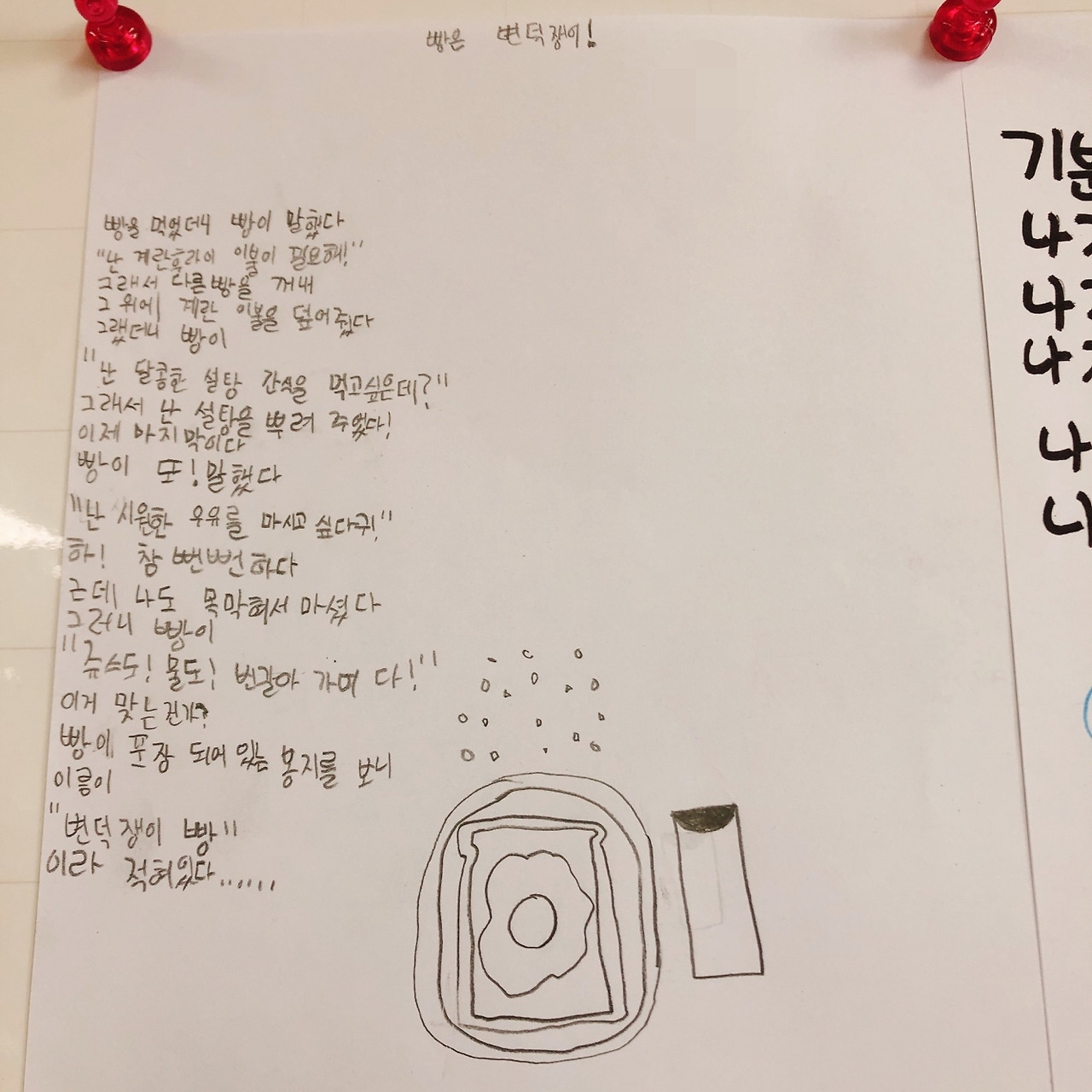 ‘기분’ 하면 내 기분만 떠올랐는데 이 아이는 사물의 기분을 시로 표현했다. 빵으로 이렇게나 재밌는 시를 썼다. 빵이 계란후라이 이불이 필요하다 해서 계란 이불을 덮어주었다. 달콤한 설탕 간식을 먹고 싶대서 설탕을 뿌려주었다. 그렇게 먹었을까? 아니, 빵이 또 말했다. 시원한 우유를 마시고 싶단다. 우유를 마셨다. 빵이 목구멍을 넘어가는 중이었나 보다. 이제 목을 통과해 내려가려... 아니, 주스도 물도 번갈아 가며 마셔달란다. 이게 맞는 건가? 포장 봉지를 보니 빵 이름이 “변덕쟁이 빵”이었다. 가히 변덕쟁이라 불릴 만하다. 이것도 저것도 원하는 게 많은 빵이었다. 이 시를 보고 있으니 진짜 빵이 사람이 된 듯하다. 어쩜 이런 생각을 했을까? 역시 아이들의 눈은 새롭다. 남다르다. 물건이 말을 걸어오기도 하고 내가 말을 건네기도 한다. 아이에게 세상은 온통 감탄의 대상일 테다. 나도 저렇게 보일 때가 있었나? 아이들이 보는 세상을 나도 보고 싶다. 이렇게 시로나마 잠시 엿볼 수 있어 좋다. 감탄하는 동심이 한없이 소중하게 느껴진다.