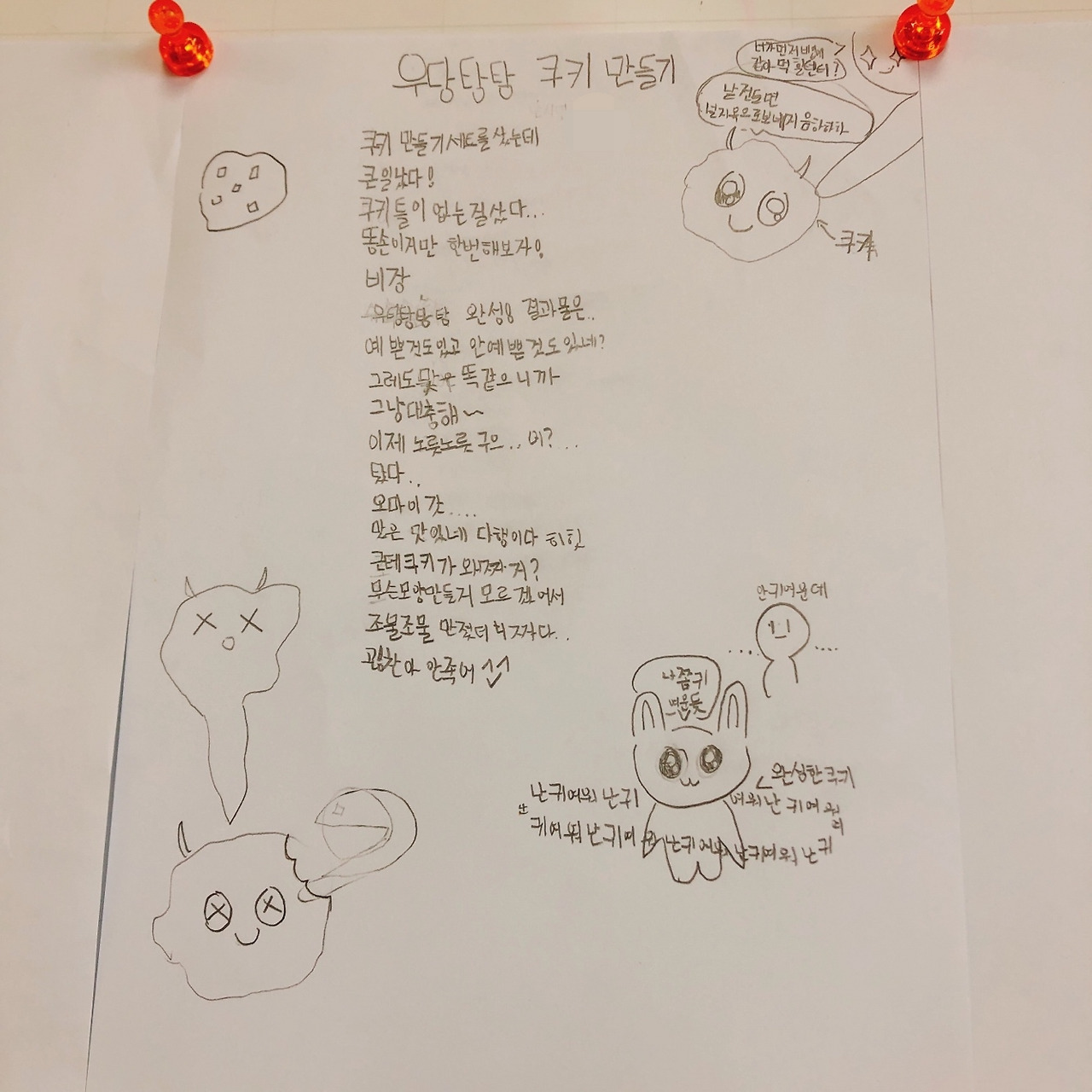 우당탕탕 쿠키 만들 때의 기분을 시로 쓰기도 했다. 게임할 때 행복하다는 아이, 놀 때 기분이 즐겁고 어떨 때는 잘 모른다는 아이, 학교에서 신나게 춤추고 있었는데 갑자기 현타가 왔다는 아이도 있었다.