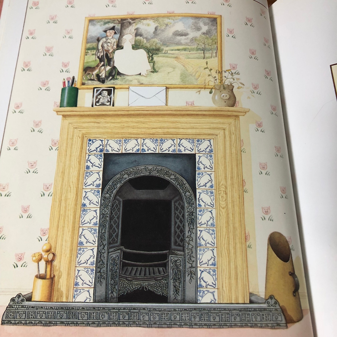 어느 날 저녁, 돌아온 집은 휑하다. 엄마가 없다. 더 이상 못 버티겠는지 엄마는 집을 나갔다. “너희들은 돼지야.”라는 쪽지만 덩그러니 남겨져 있다. 이때 피곳 씨 옆을 보면 배경 곳곳에 돼지가 숨어있다. 이전 장면에서 피곳 씨가 소파에 앉아 신문을 볼 때 벽에 비친 그림자가 돼지 모양이었는데 이번에도 돼지가 보인다. 가슴에 달린 브로치도, 열고 들어오는 문의 손잡이도 돼지 모양이다. 기분 탓인지 벽 콘센트 구멍도 돼지 콧구멍 같다. 집 안의 물건들도 다 돼지로 변했다. 벽지의 튤립이 어느새 돼지 얼굴로 바뀌었다. 돼지 화병, 돼지 벽 무늬, 돼지 그림, 벽난로의 문양까지 돼지다. 엄마가 남기고 간 “너희들은 돼지야.” 쪽지를 열어보는 아빠의 손도 돼지 손이다. 그리고 바로 다음 장면부터 아빠와 아이들은 모두 돼지 얼굴이다. <돼지책>이란 책 제목에 걸맞게 아빠와 아이들이 돼지임을 표현하고 있다.