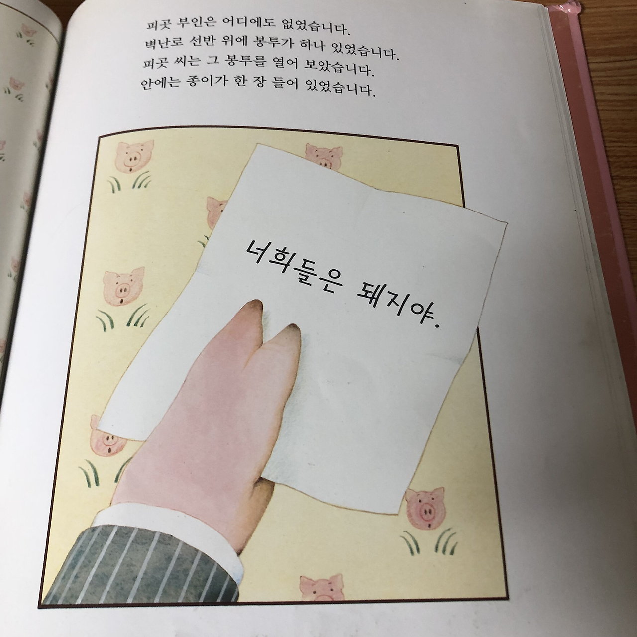 왜 <돼지책>일까 궁금했는데 책을 덮고 나니 알겠다. 밥 달라고 찾는 아빠와 아이가 돼지였다. 꿀꿀 돼지처럼 밥만 찾고 가정의 일을 함께할 생각은 없는 게으른 모습이었다. 엄마는 모든 짐을 짊어지고 혼자 부담해야 했다. 피곳 씨와 아이들은 혼자서 모든 일을 하는 엄마의 힘듦과 소중함을 깨닫지 못했다. 항상 이럴 때마다 비유의 대상이 되는 돼지에게 미안하지만 <돼지책>이라는 제목이 딱 맞다.