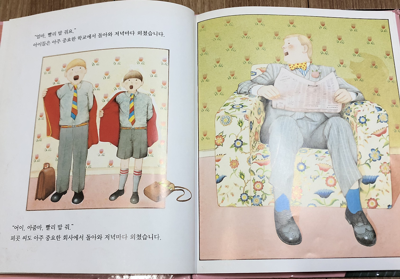 피곳 씨네 가족은 멋진 집에 살고 있다. 그림으로 보아 남부러울 것 없이 사는 모습이다. 그런데 집 안을 자세히 들여다보니 이상하다. “여보, 빨리 밥 줘.”, “엄마, 빨리 밥 줘요.” 모두 휑하니 가 버린 뒤 엄마만 남아 산더미 같은 집안일을 마무리한다. 그러곤 쉬는 걸까? 곧장 일하러 간다. 저녁에 돌아와 “어이, 아줌마, 빨리 밥 줘.”까지 피곳 씨는 선을 넘어도 세게 넘었다. 아내를 아줌마라고 부르질 않나 집에 돌아와서도 밥. 밥. 밥. 밥부터 찾는다. 아내가 밥해주는 사람인가 보다. 아이들도 마찬가지다. 아빠를 보고 배운 건가? 엄마가 밥으로 보이나 보다. 볼 때마다 밥 타령이다. 식사 후에도 아무 생각도 없다. 소파에 누워 TV 보기 바쁘다.