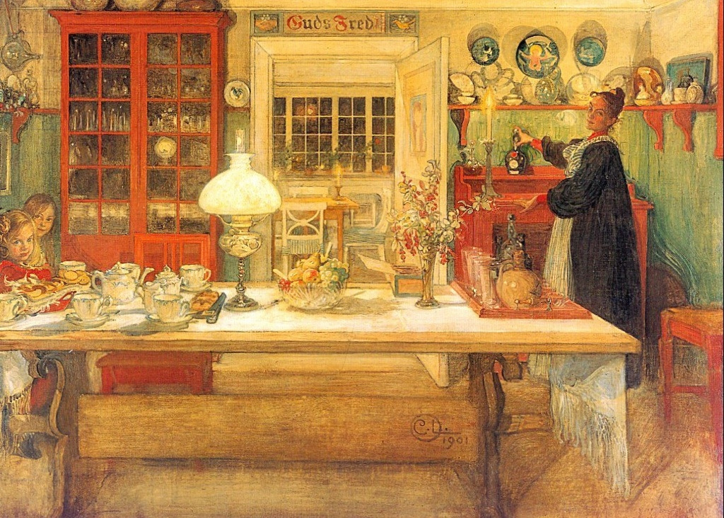 엄마와 아이들이 보인다. 부엌 같은데 기다란 식탁 위에는 그릇과 찻잔, 과일과 간식이 보인다. 꽃과 조명으로 이 공간을 밝혔다. 덕분에 분위기가 한층 따스하고 편안해진 것 같다. 식사 중인 걸까? 그러기엔 식탁 위에 차려진 음식이 별로 보이지 않는다. 그럼 식사 후 티타임일까? 뒷배경에도 눈이 간다. 찬장에는 식기들이 가득하다. 장식장에도 무언가 가득 차 있고 가지런히 정돈된 게 아주 깔끔하다. 엄마는 피아노 앞에 서 있는 것 같다. 엄마의 손이 닿은 것은 와인일까? 맞은편에 있는 남편을 보고는 저 병을 잡은 걸까? 오늘 저녁 와인을 한잔하려나? 부엌 같은데 싱크대는 보이지 않는다. 반대편에 있을까? 궁금하다. 큰 식탁 위에 식탁보가 길게 깔려있고 역시 촛불이 빠지면 섭하지. 곳곳에 촛불이 제 몸을 태워 따뜻한 빛을 내고 있다. 단란한 가족들의 저녁 식사 장면을 보고 있으니 여러 의미로 여유로워 보인다. 칼 라르손의 가족 그림일 것 같다. 자녀가 많았다는데 나머지 가족들은 어디에 있을지도 궁금하다. 딸들이 그림 그리는 아빠를 바라보고 있는 걸까? 자신을 자주 보던 딸들의 시선을 그린 걸까? 그림의 반대편 모습 그리고 그 너머의 모습이 궁금해 상상하게 된다.