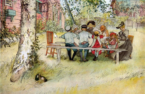 아내의 모습, 자녀들의 모습을 많이 그렸더라. 그래도 가족이 모여 있는 이 그림이 가장 마음에 들었다. 따로따로 있을 때보다 한데 모였을 때 비로소 온전한 가족이다. 함께 만든 소중한 집 앞 푸른 잔디 마당, 커다란 자작나무 그늘 아래서 오순도순 아침 식사하는 모습을 보고 있으니 참 예쁘다. 누구나 원하는 이상적인 가족의 모습이다. “가족과 집이 내 생애 최고의 걸작이다.”라는 칼 라르손은 사랑하는 가족의 모습을 이렇게 그리면서 참으로 행복했을 것 같다. 그림 속 가족의 모습은 항상 행복해 보였다. 왜 행복을 그린 화가라는지 그림만 봐도 단번에 알겠더라. 그림이라는 것을 통해 내 눈이 가장 많이 머무는 것과 그 순간을 그렸구나.