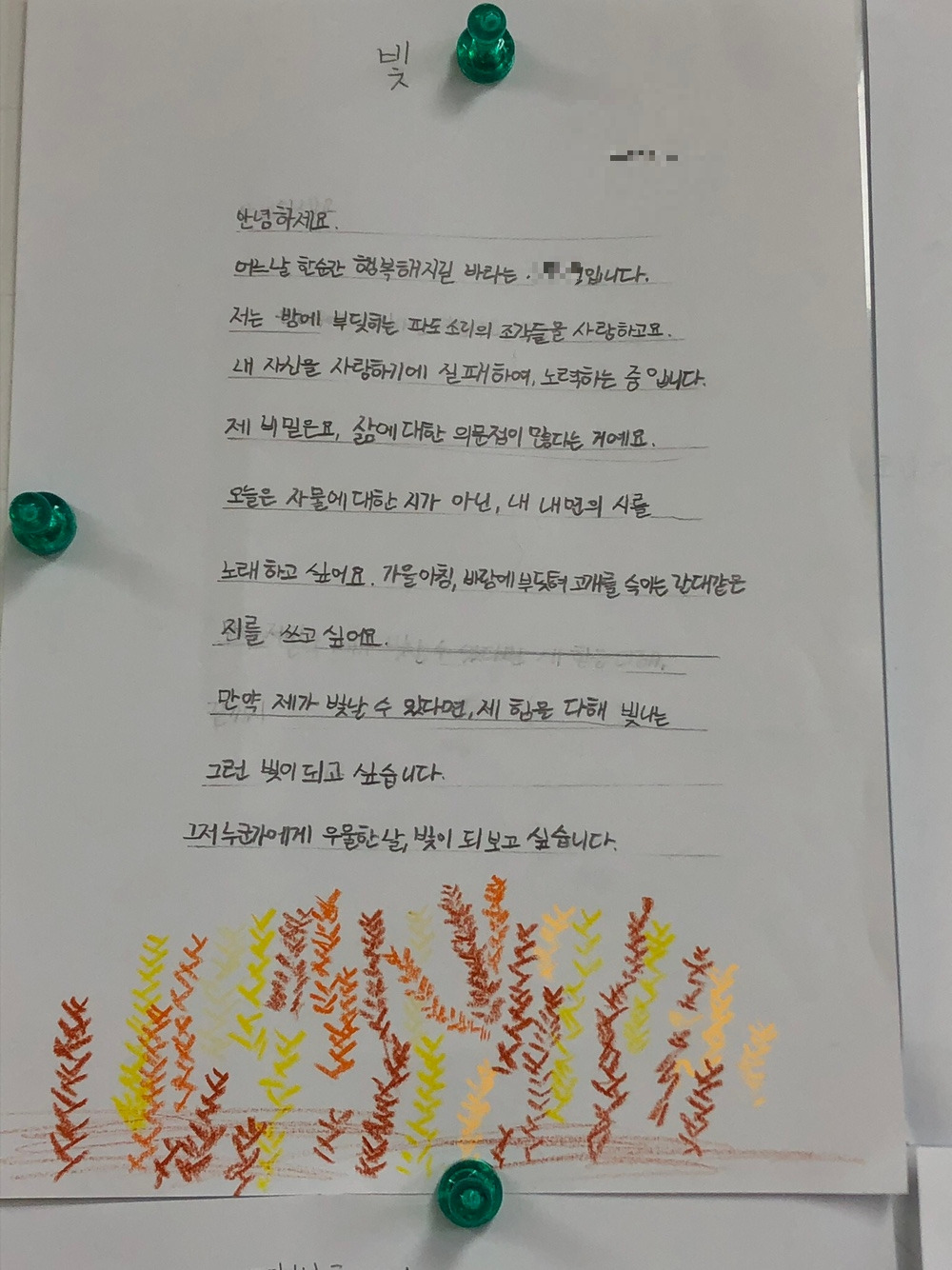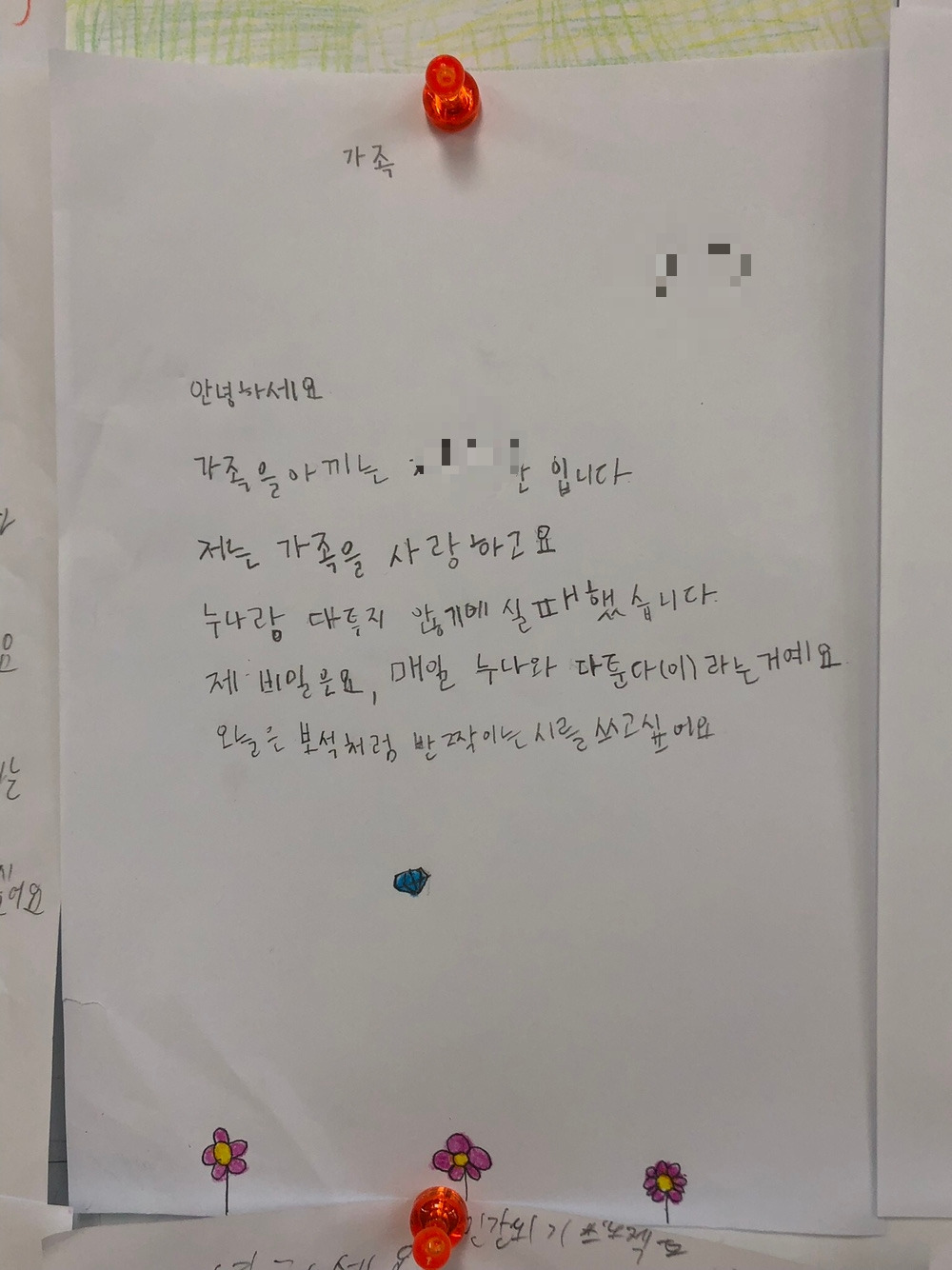 평소에도 생각이 깊고 어른스러워 감탄할 때가 많은 아이는 역시나 사색적이고 감성적인 시를 써 보였다. 가장 궁금했던 부분은 오늘은 어떤 시를 쓰고 싶냐는 것에 대한 답변이었는데 ‘가을 아침, 바람에 부딪쳐 고개를 숙이는 갈대 같은 시를 쓰고 싶다’, ‘엄마처럼 포근한 시를 쓰고 싶다’, ‘파란색처럼 차가운 시를 쓰고 싶다’, ‘소나기처럼 길고 짧은 시를 쓰고 싶다’, ‘보석처럼 반짝이는 시를 쓰고 싶다’ 등 답변들에 모두 진심이 담겨있어 기특했다.