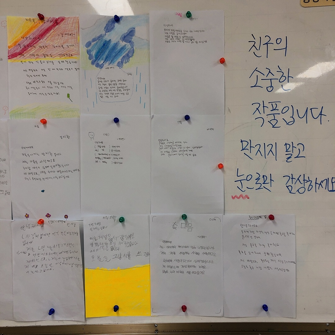 아이들이 ‘꼬마 시인’, ‘꼬마 작가’로 거듭나는 여정을 이곳에 남기고 싶습니다. 함께 정한 주제부터 자유주제까지 여러 주제로 다양한 시를 함께 써보고자 합니다. 선생님과 순수한 아이들이 만들어가는 시를 보여주고 싶습니다. 아이들의 순수하지만, 톡톡 튀는 개성과 진심이 가득 담긴 특별한 시입니다.