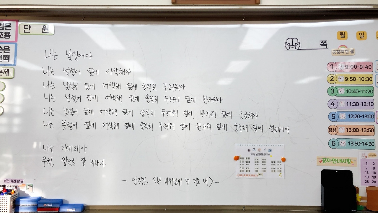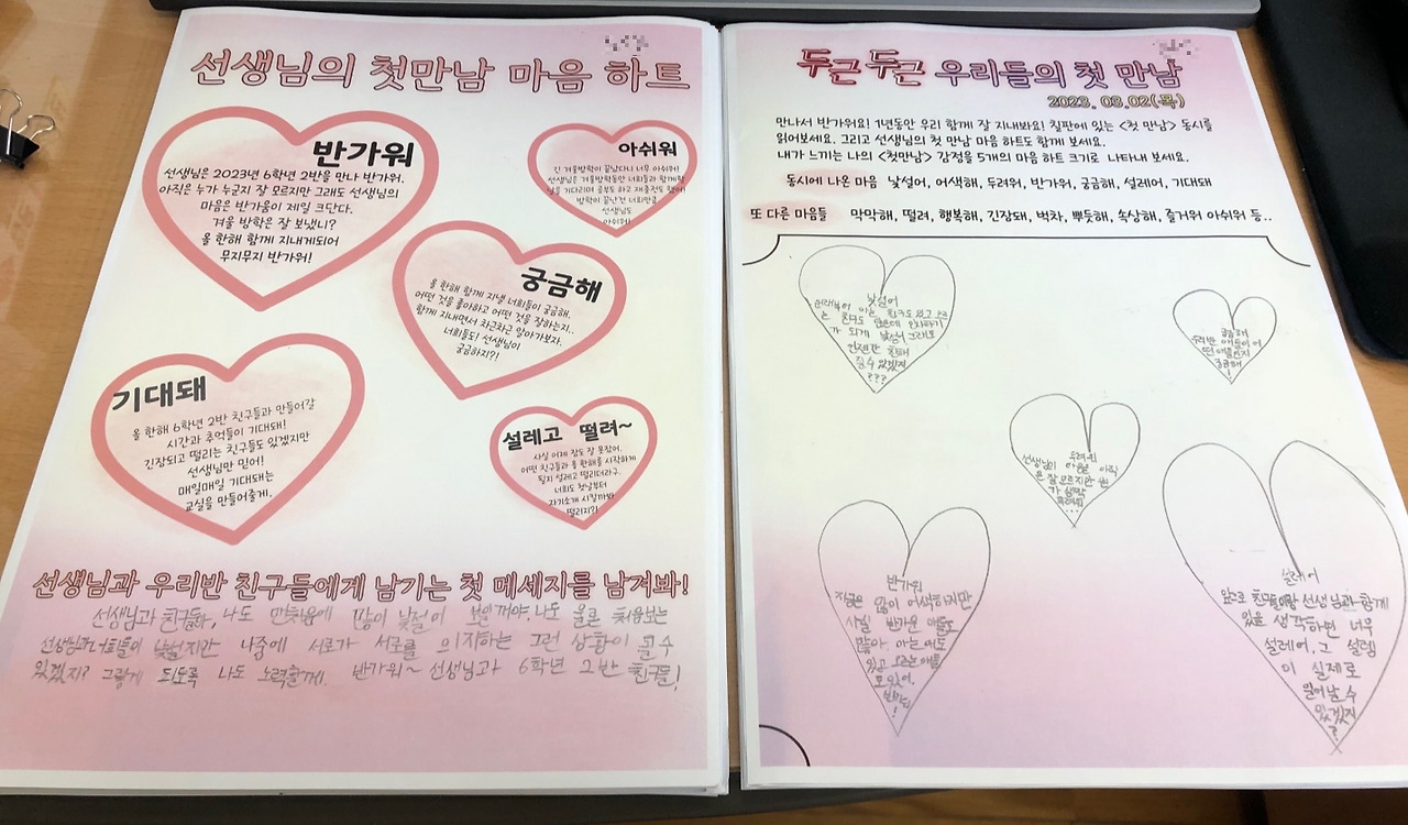 어떤 아이들과 어떤 한 해를 보내게 될까? 아이들은 친한 친구랑 떨어지기 싫은 마음, 작년 반을 그리워하는 마음, 낯설고 두려운 마음으로 교실에 들어선다. 같은 반이 될 친구들은 어떨지, 선생님은 어떨지 참 궁금하고 설레는 마음도 있지만 걱정이 앞서겠지? 아이들만 그런 건 아니다. 선생님들도 전날 잠을 설칠 정도로 걱정 한가득 떨리는 마음으로 첫날을 맞이한다. 경력 많은 베테랑 선생님도 가장 떨리는 순간이 바로 3월 개학이 아닐까 싶다. 올해는 어떤 한 해를 보내게 될까? 첫 만남에 올 한 해를 그려보기도 한다. 이렇게 만나 우리가 함께 올 한 해를 보내겠구나.