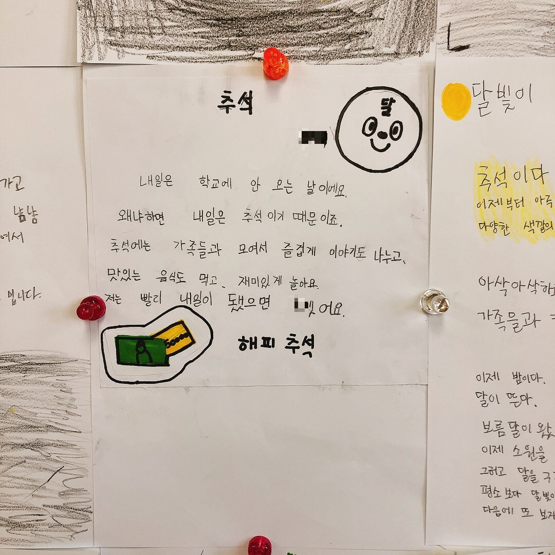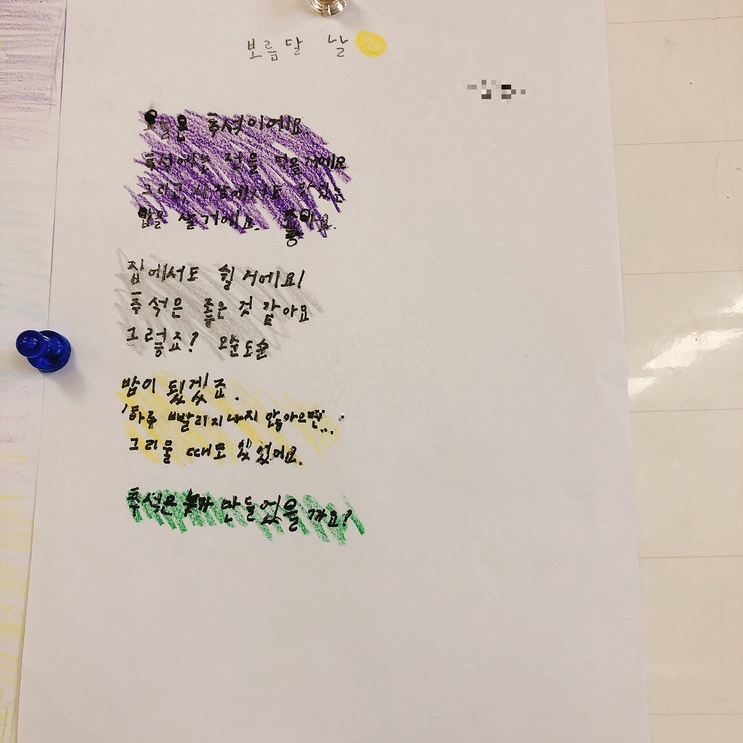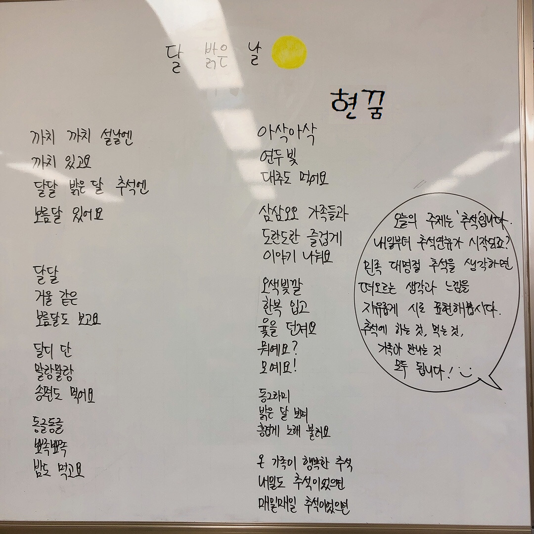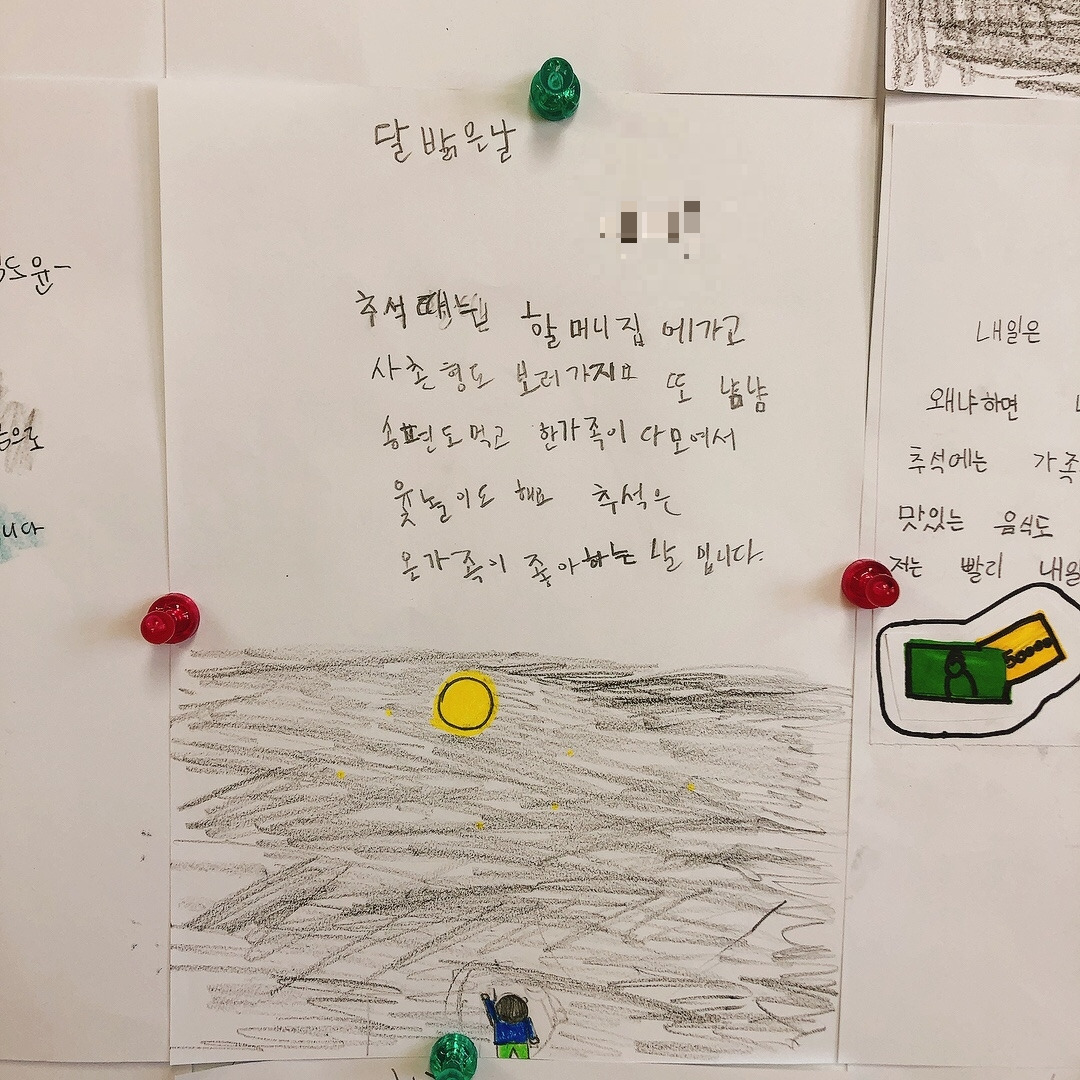 확실히 자신들이 관심 있어하는 주제에 대해서는 집중해서 곧잘 시를 써 보였고 재밌어했다. 아이들의 시에 가득 그려진 노랗게 빛나는 보름달을 보니 이제 추석이 시작되는구나 실감이 났다. 칠판 가득 채워진 추석에 대한 기대감으로 나도 덩달아 설렜다. 아이들이 이만큼 기다리고 기대했던 추석을 가족들과 즐겁게 보내고 오면 좋겠다.
