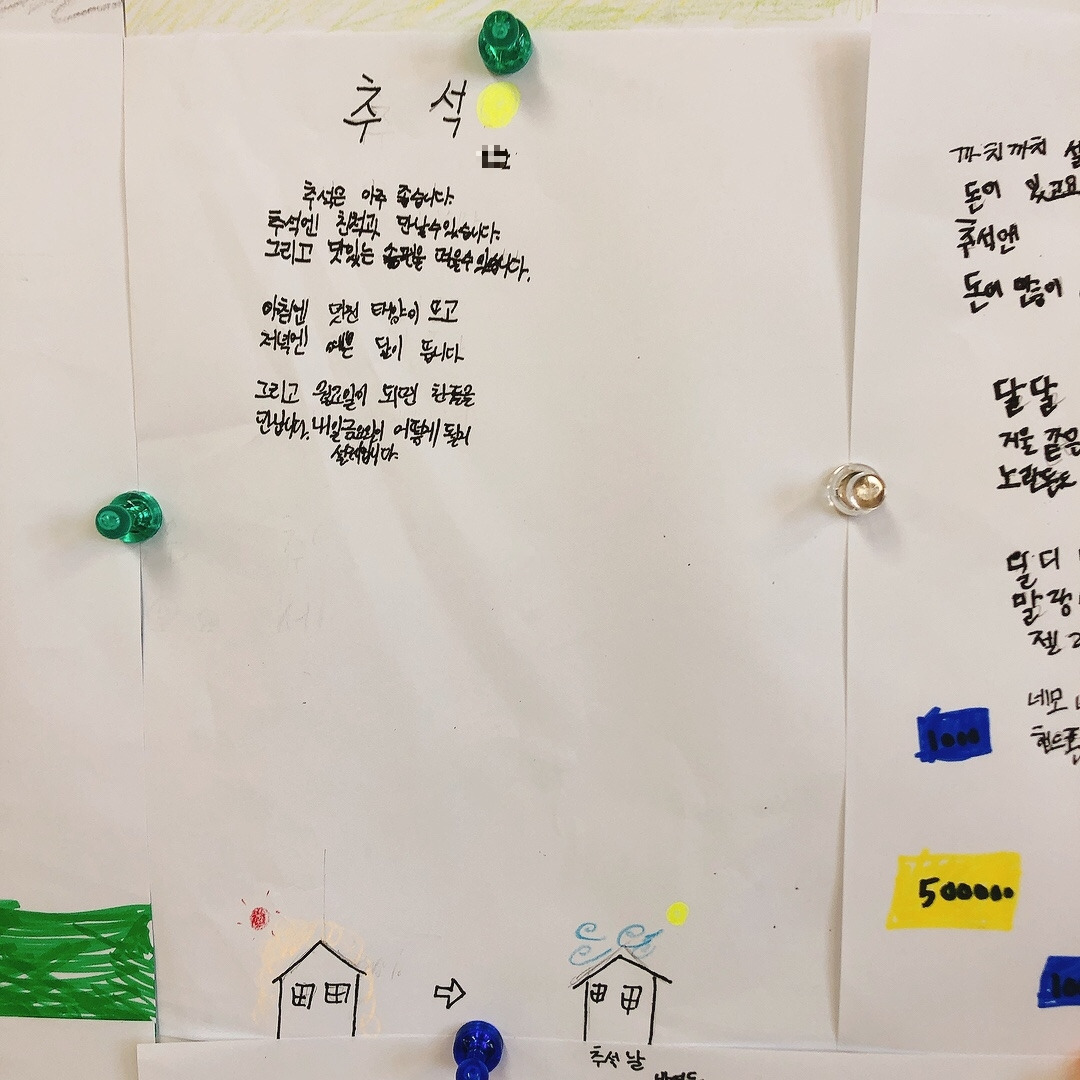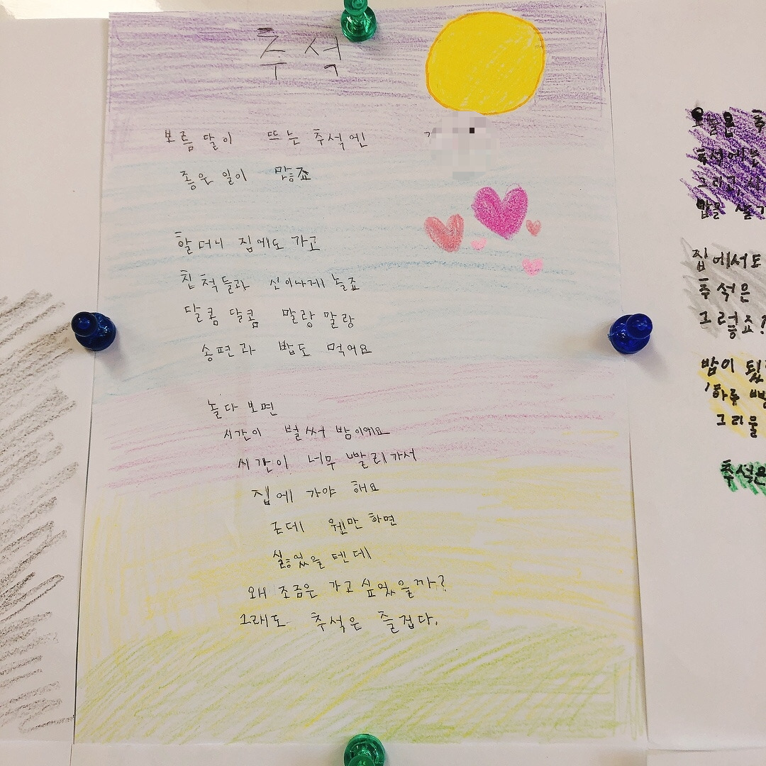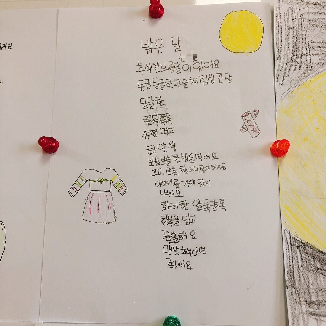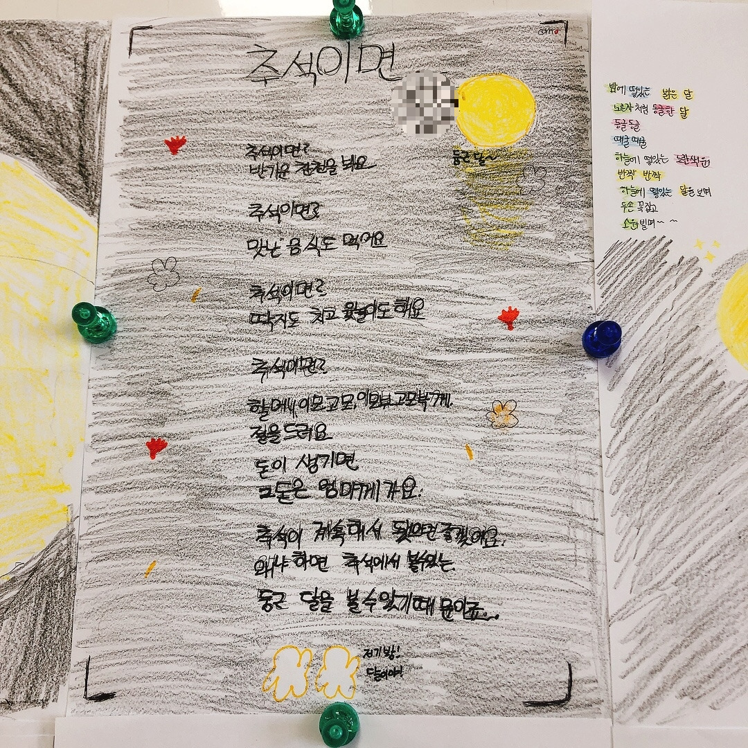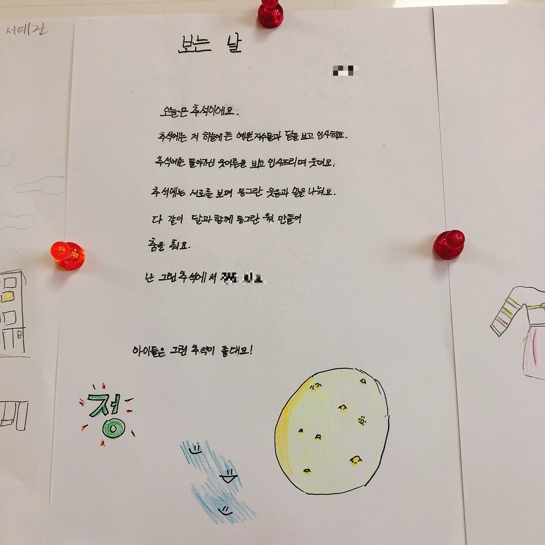 확실히 자신들이 관심 있어하는 주제에 대해서는 집중해서 곧잘 시를 써 보였고 재밌어했다. 아이들의 시에 가득 그려진 노랗게 빛나는 보름달을 보니 이제 추석이 시작되는구나 실감이 났다. 칠판 가득 채워진 추석에 대한 기대감으로 나도 덩달아 설렜다. 아이들이 이만큼 기다리고 기대했던 추석을 가족들과 즐겁게 보내고 오면 좋겠다.