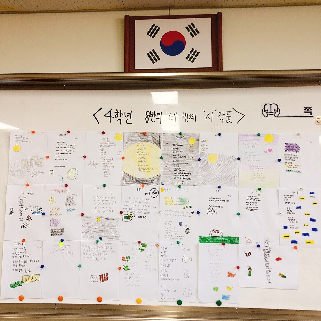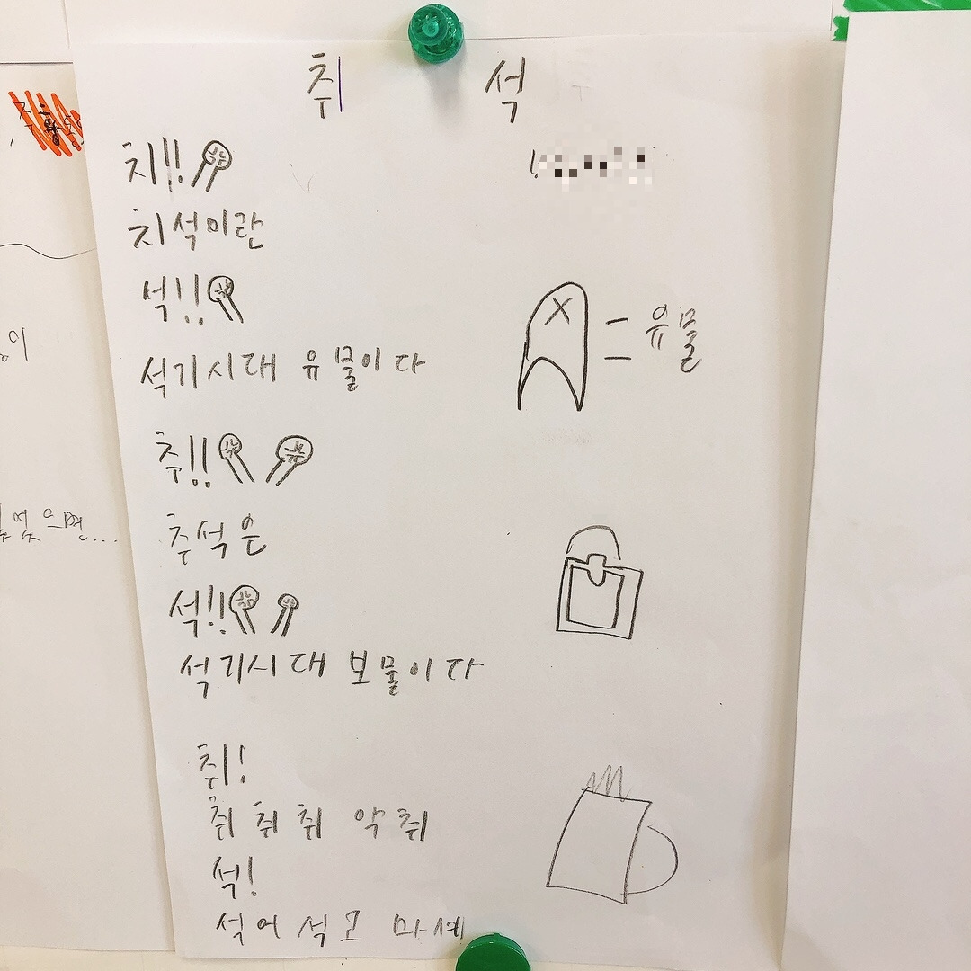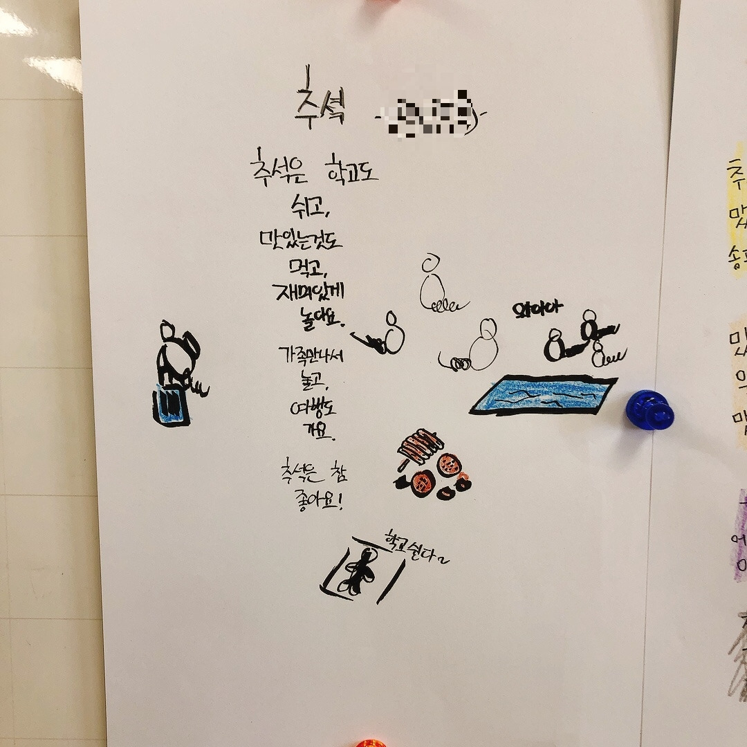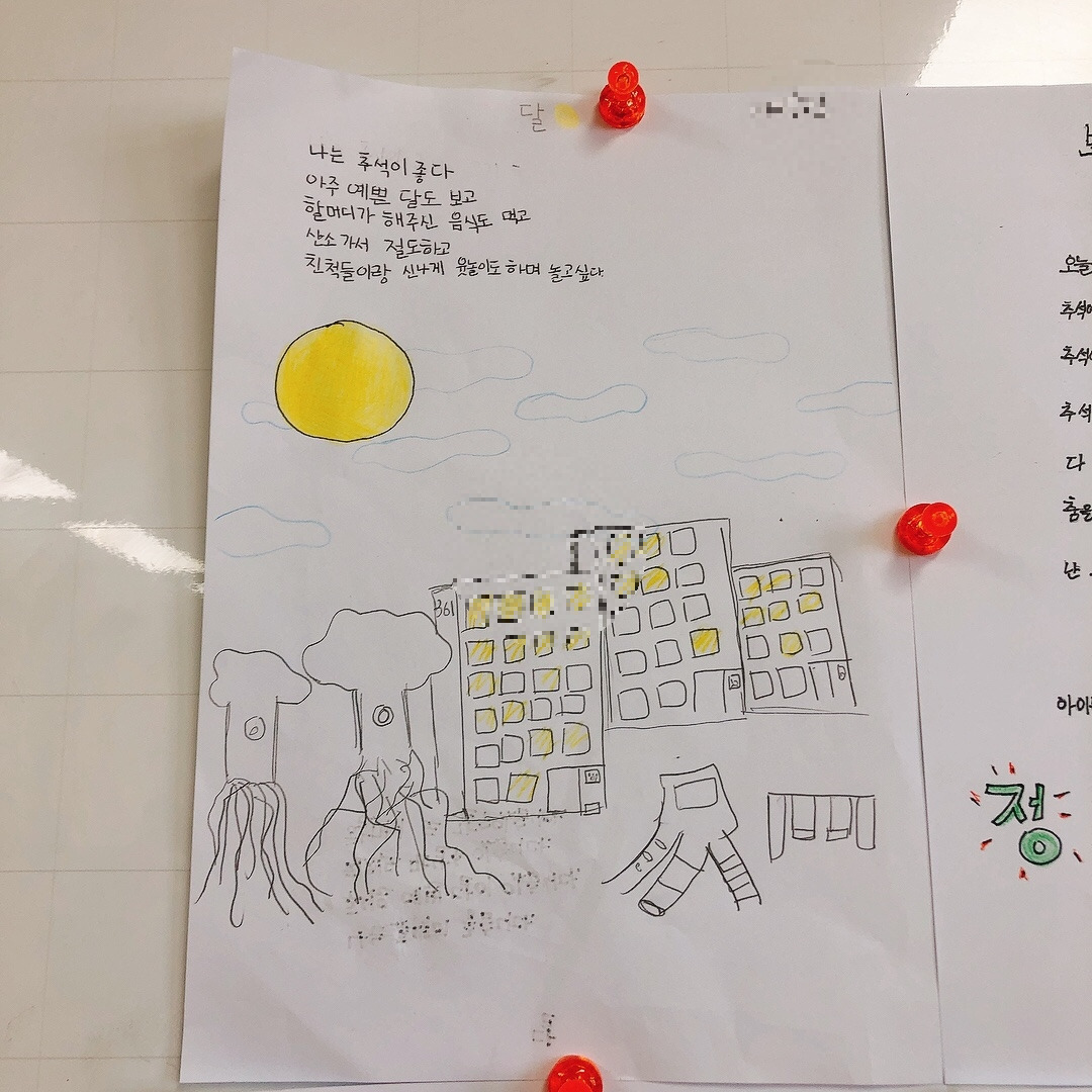 확실히 자신들이 관심 있어하는 주제에 대해서는 집중해서 곧잘 시를 써 보였고 재밌어했다. 아이들의 시에 가득 그려진 노랗게 빛나는 보름달을 보니 이제 추석이 시작되는구나 실감이 났다. 칠판 가득 채워진 추석에 대한 기대감으로 나도 덩달아 설렜다. 아이들이 이만큼 기다리고 기대했던 추석을 가족들과 즐겁게 보내고 오면 좋겠다.